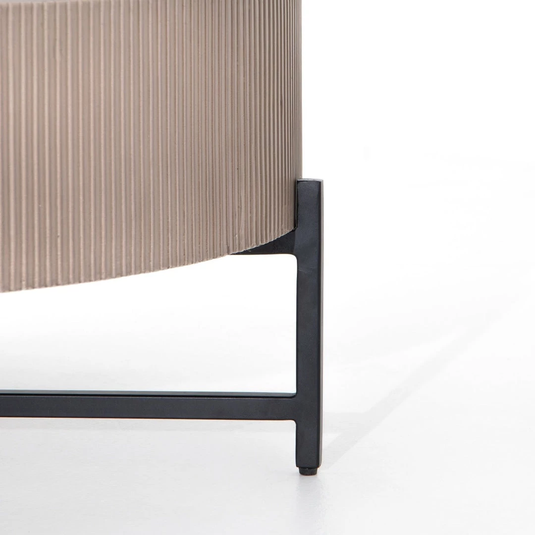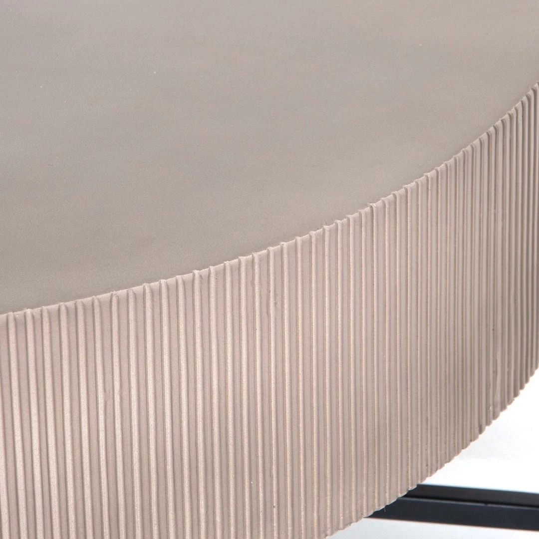 Side reeding lends texture to a rounded coffee table of ribbed concrete, while low, black steel framing spurs an intriguing juxtaposition of scale. Cover or store inside during inclement weather and when not in use.