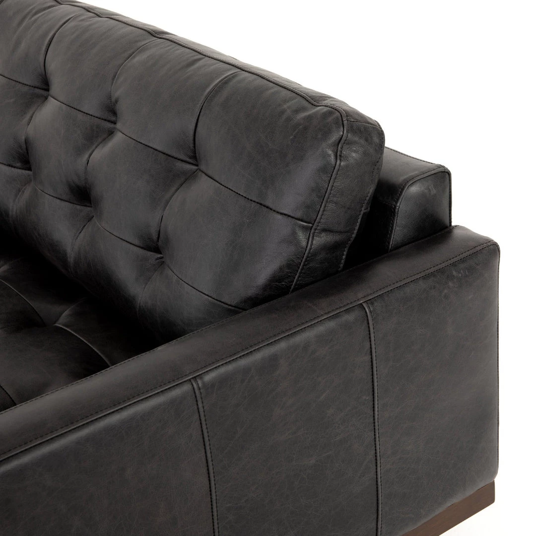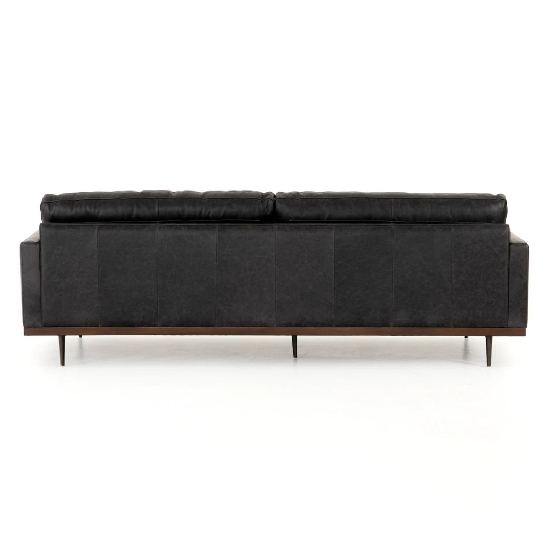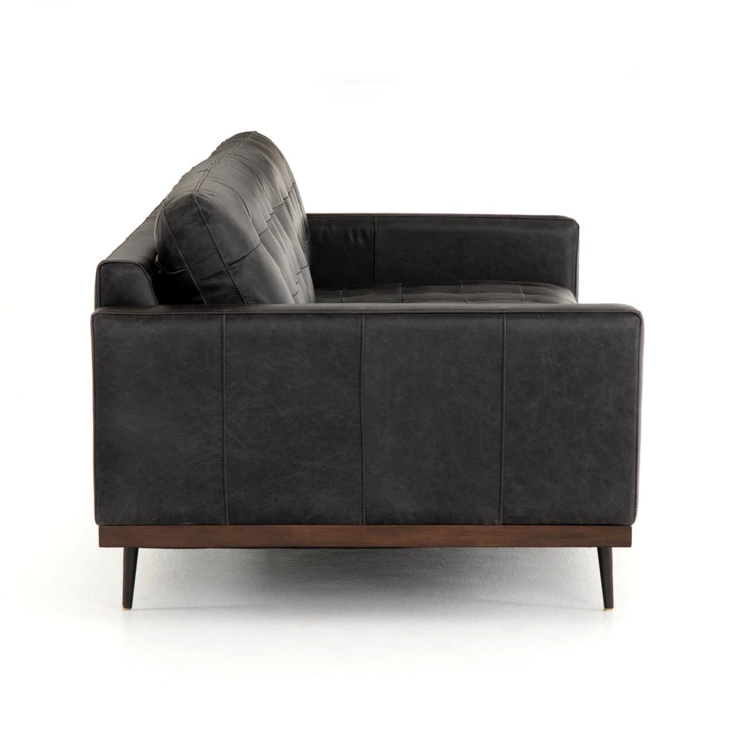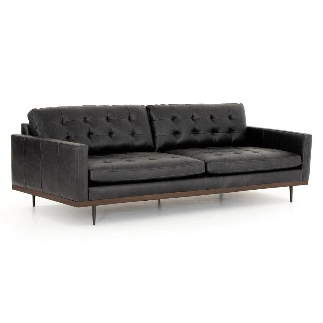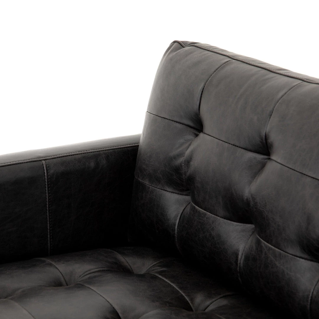 Low-leaning style with mid-century vibes. Black top-grain leather, with button tufting for texture and comfort. Wrap-around framing and cone-tapered legs for fine finishing touches.