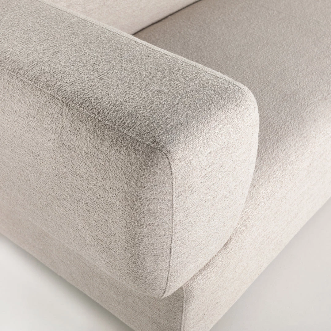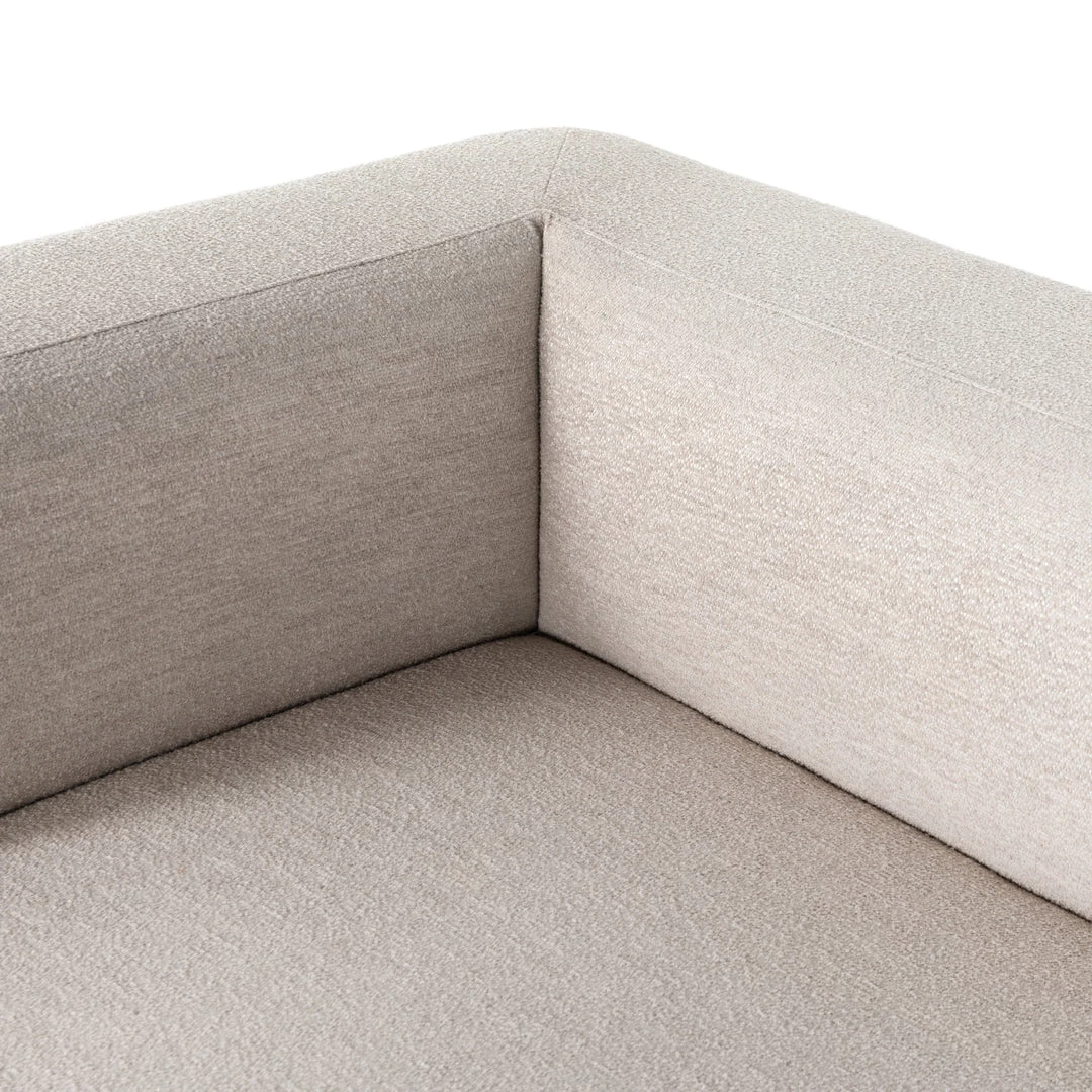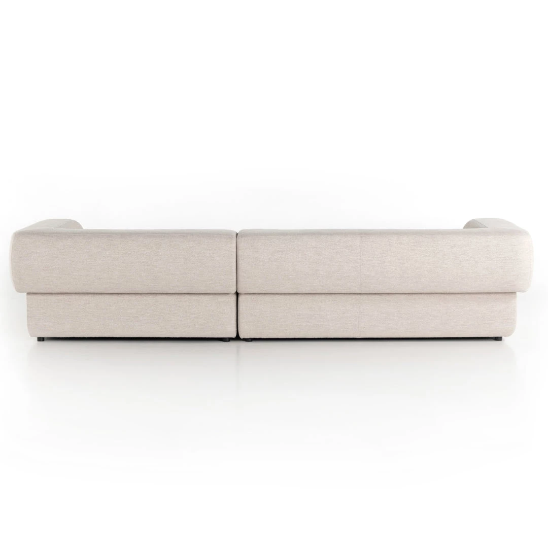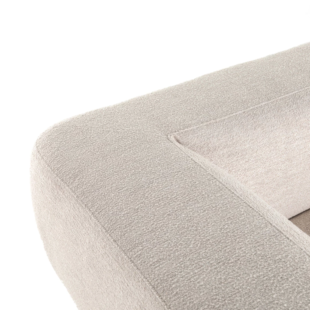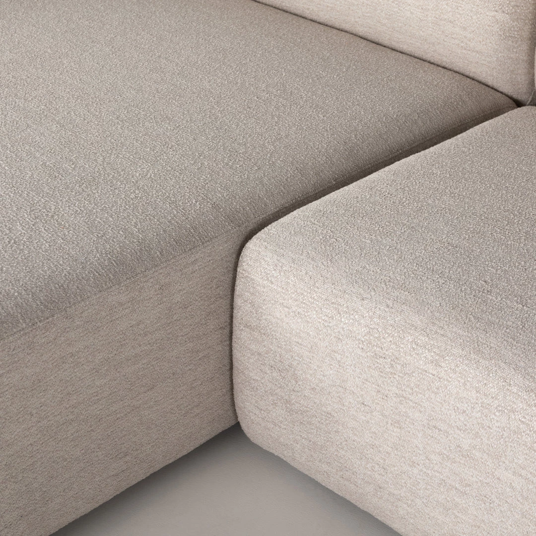 Soft volume says “relax.” Upholstered in a pristinely tailored high-performance fabric that feels like a blend of linen and boucle, rolled curves and grand proportions bring a look of beautiful drama to everyday lounging. Two-piece right arm-facing sectional with matching chaise.