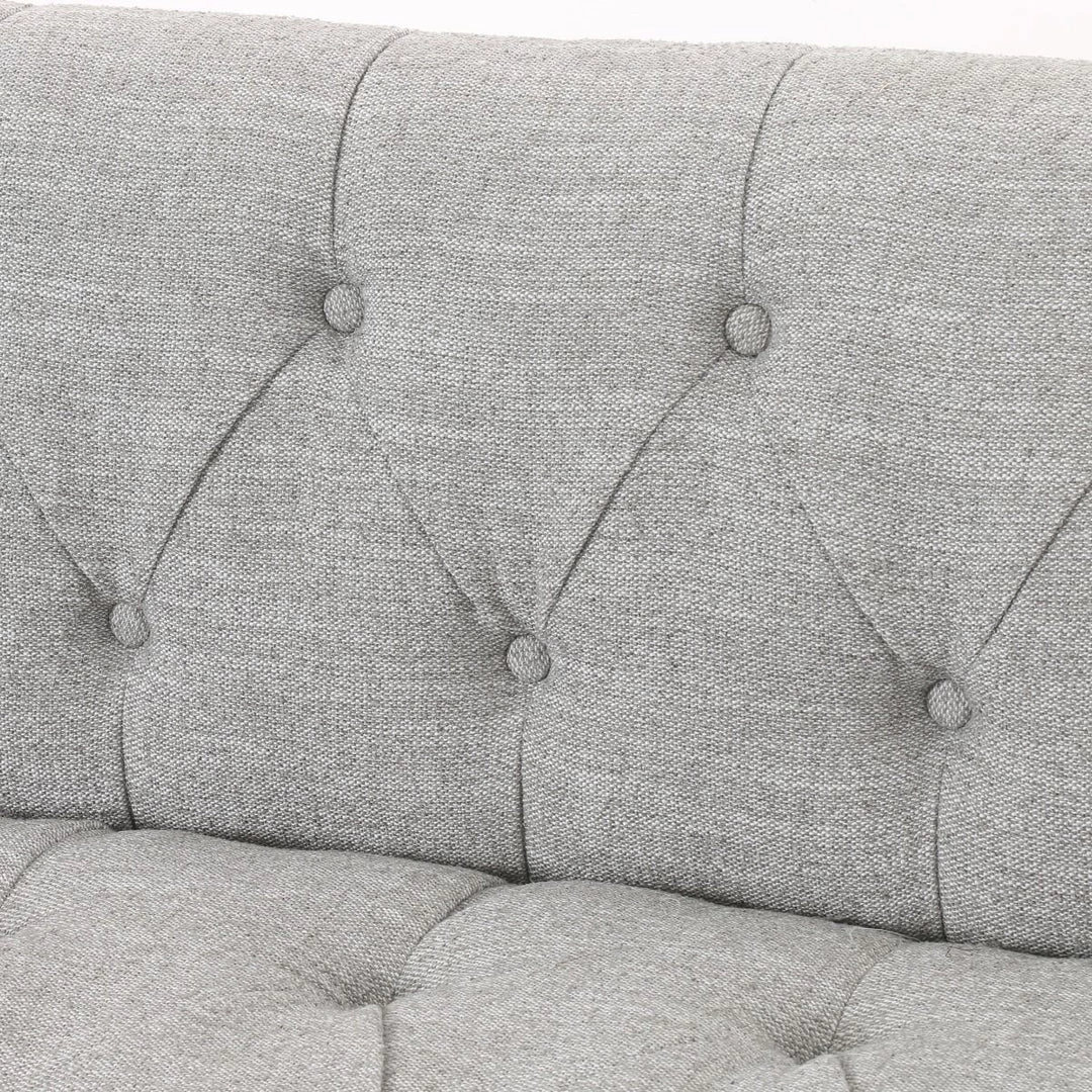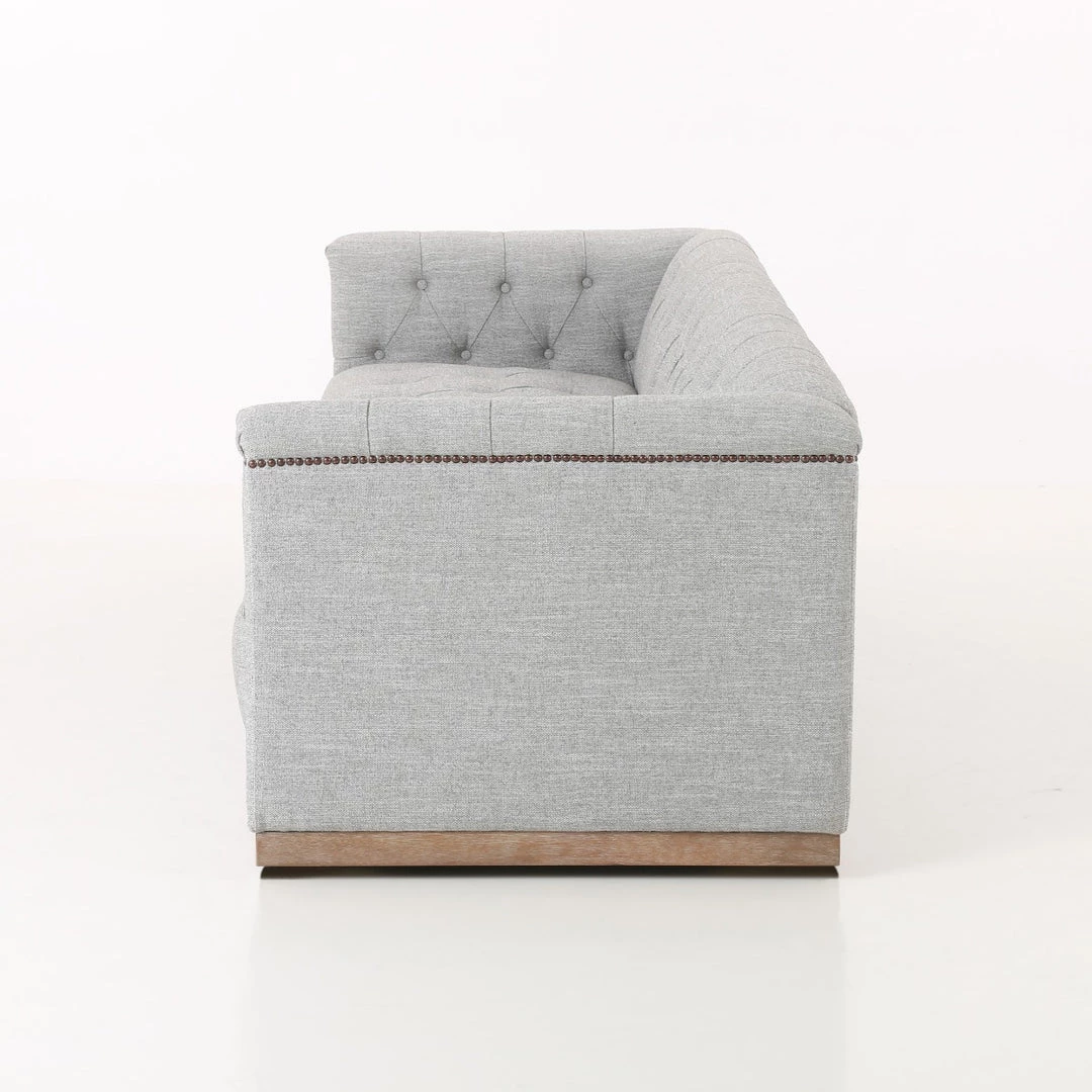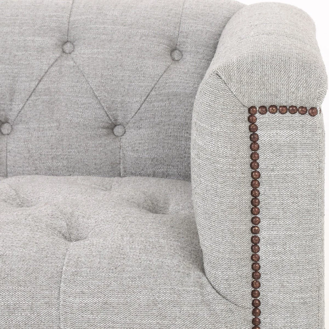 A classic tufted sofa in a light grey poly/cotton blend upholstery on a whitewashed parawood base finished in aged bronze nail heads