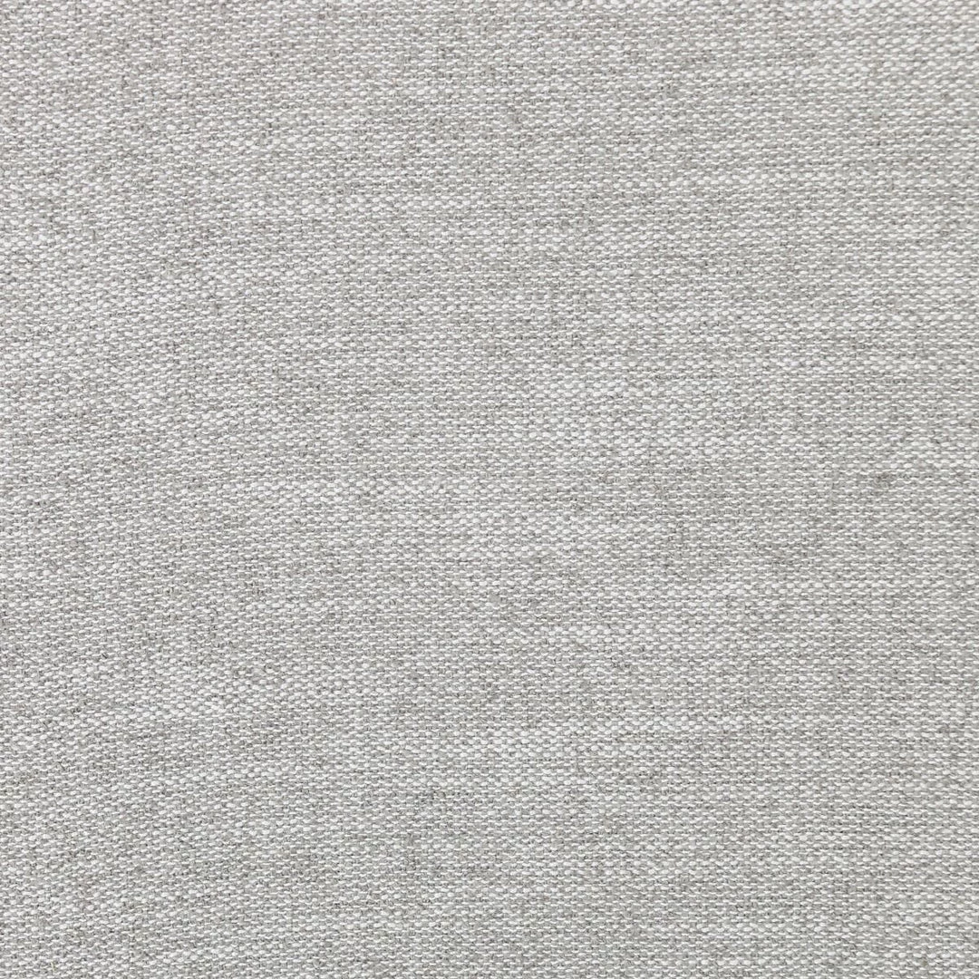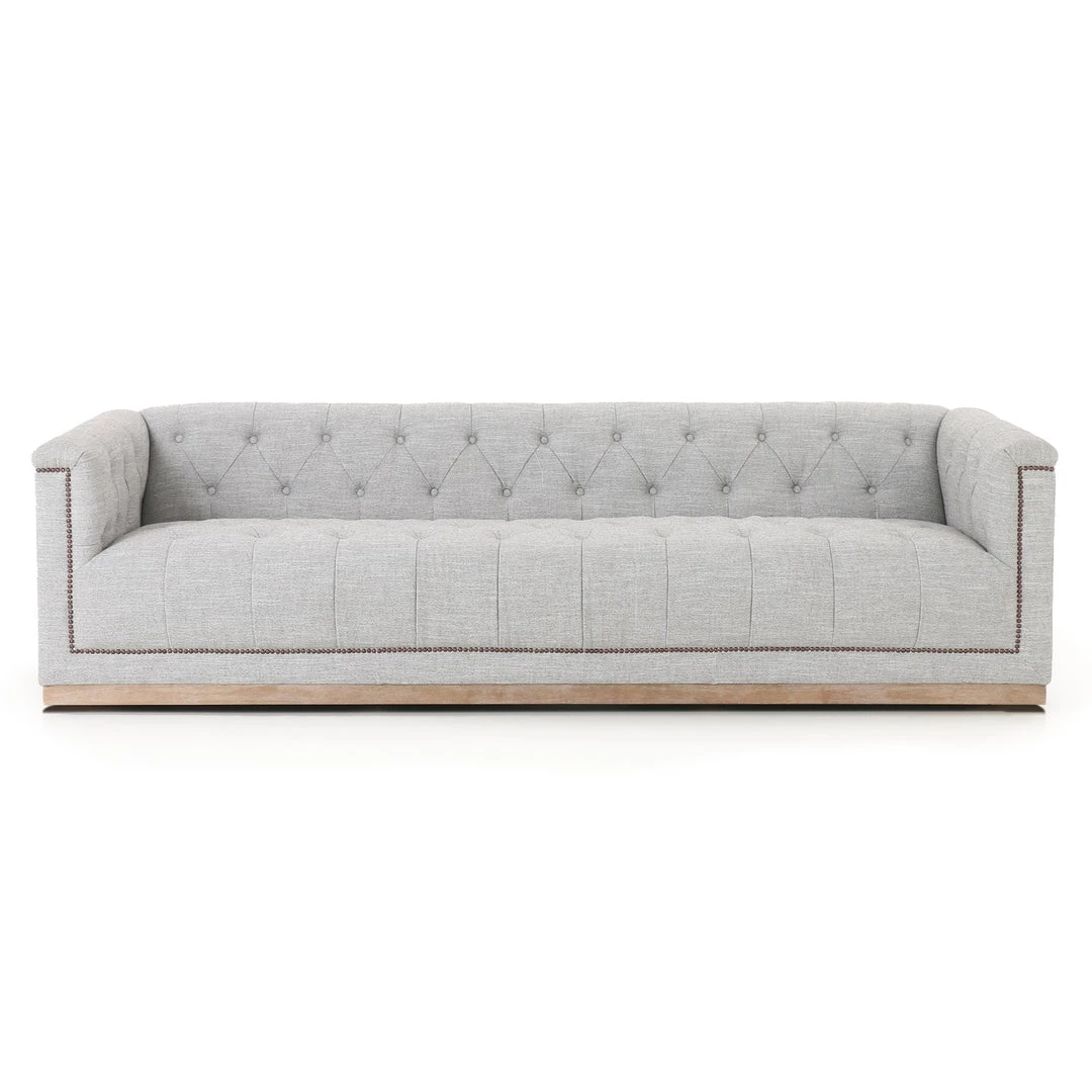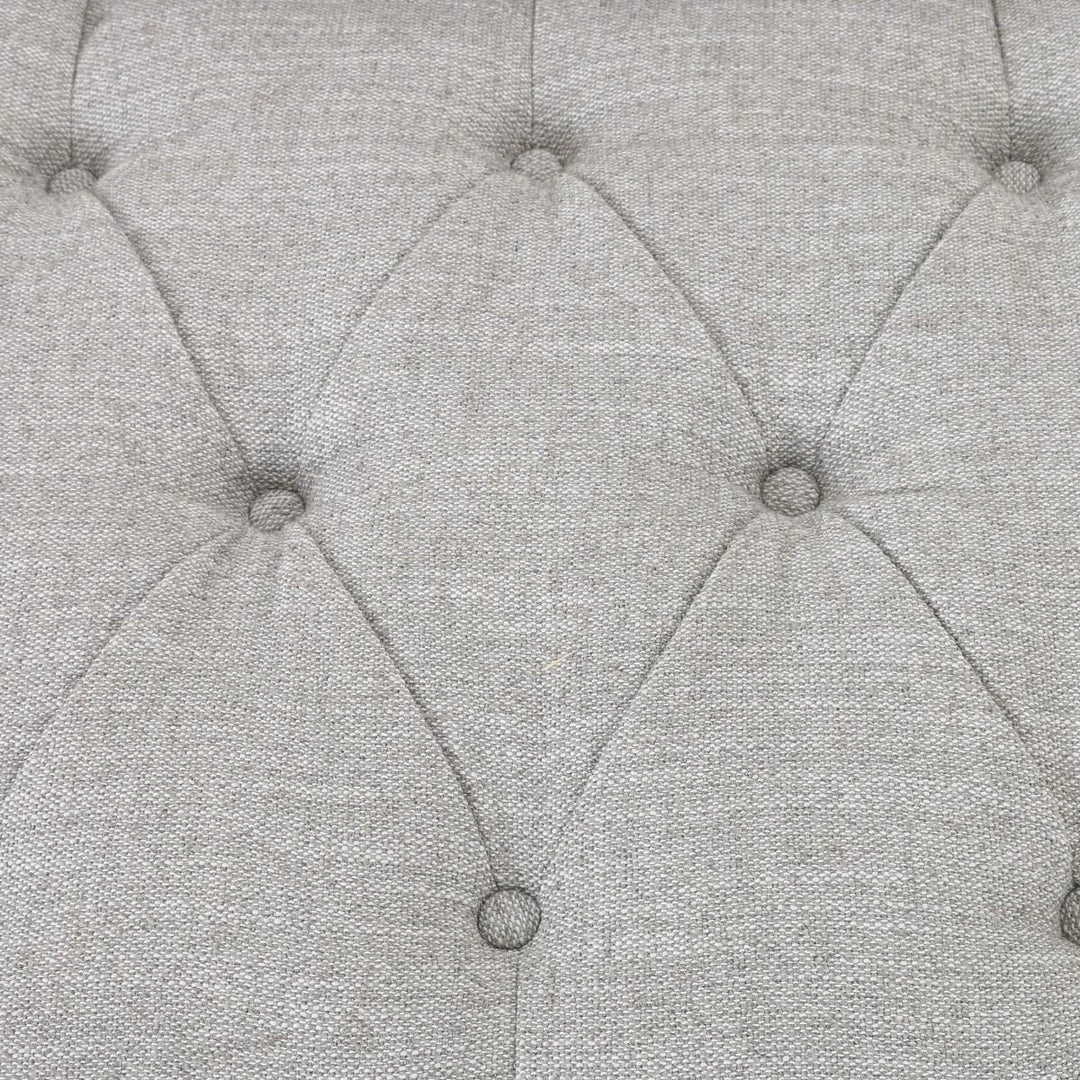 A classic tufted sofa in a light grey poly/cotton blend upholstery on a whitewashed parawood base finished in aged bronze nail heads