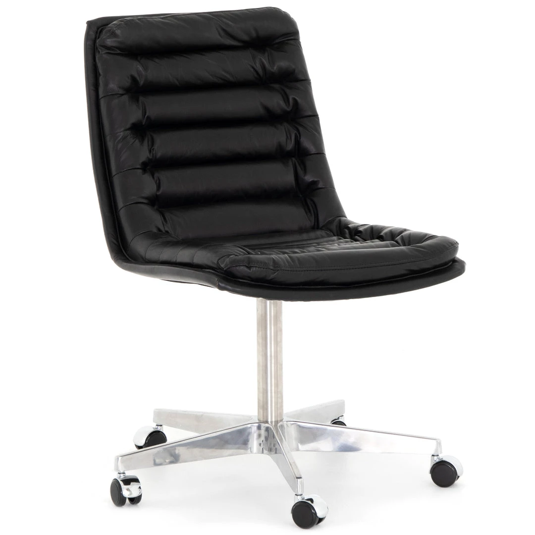 Paired back and fashion-forward, this minimalist desk chair in black top-grain leather offers maximum comfort. Inspired by work spaces of the ‘50s and ‘60s. Stainless steel casters make for stylish ease in the workplace.