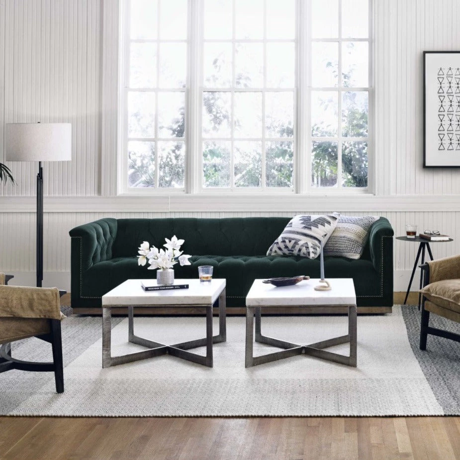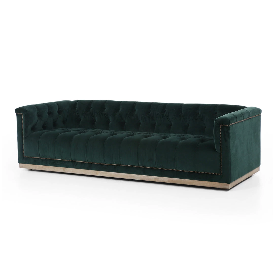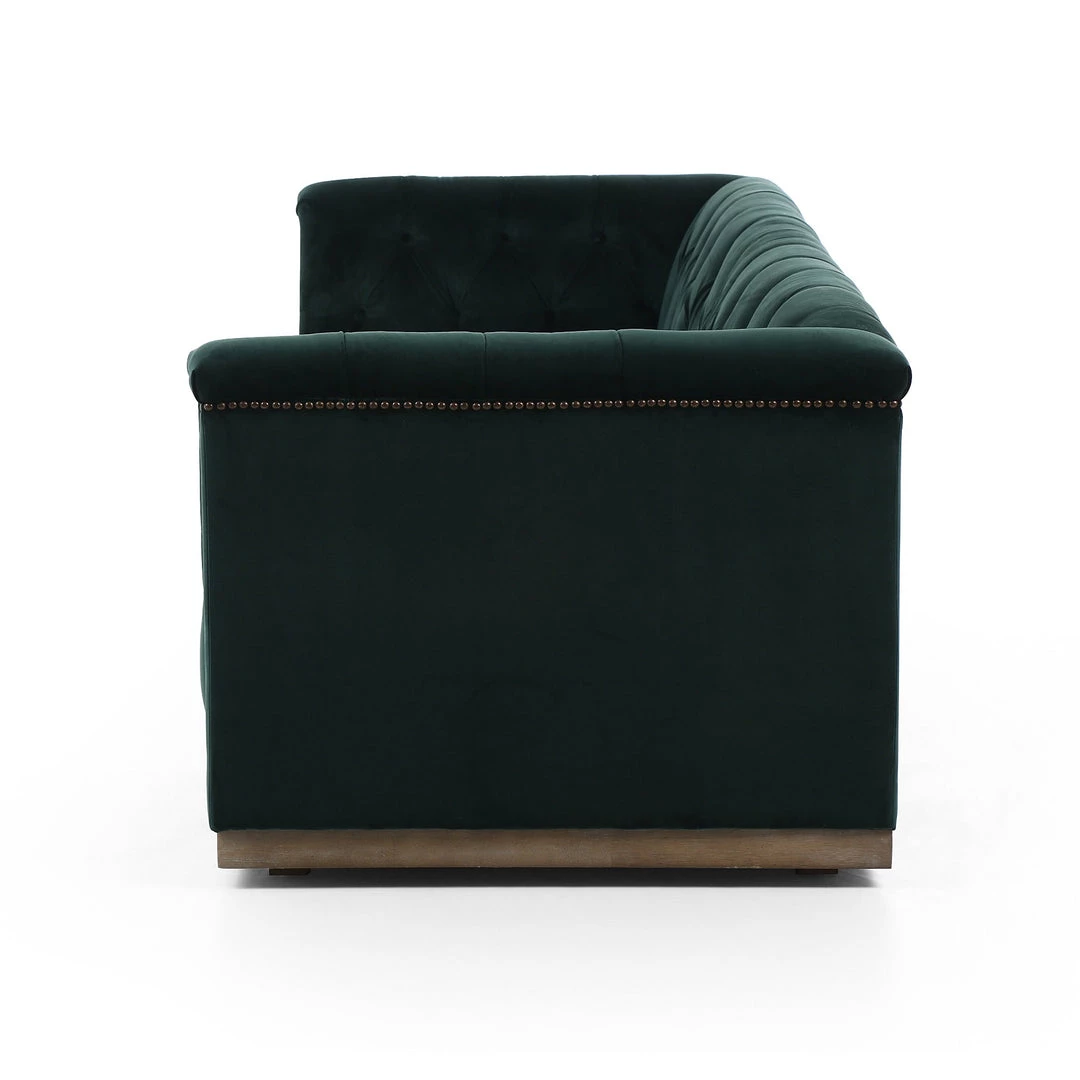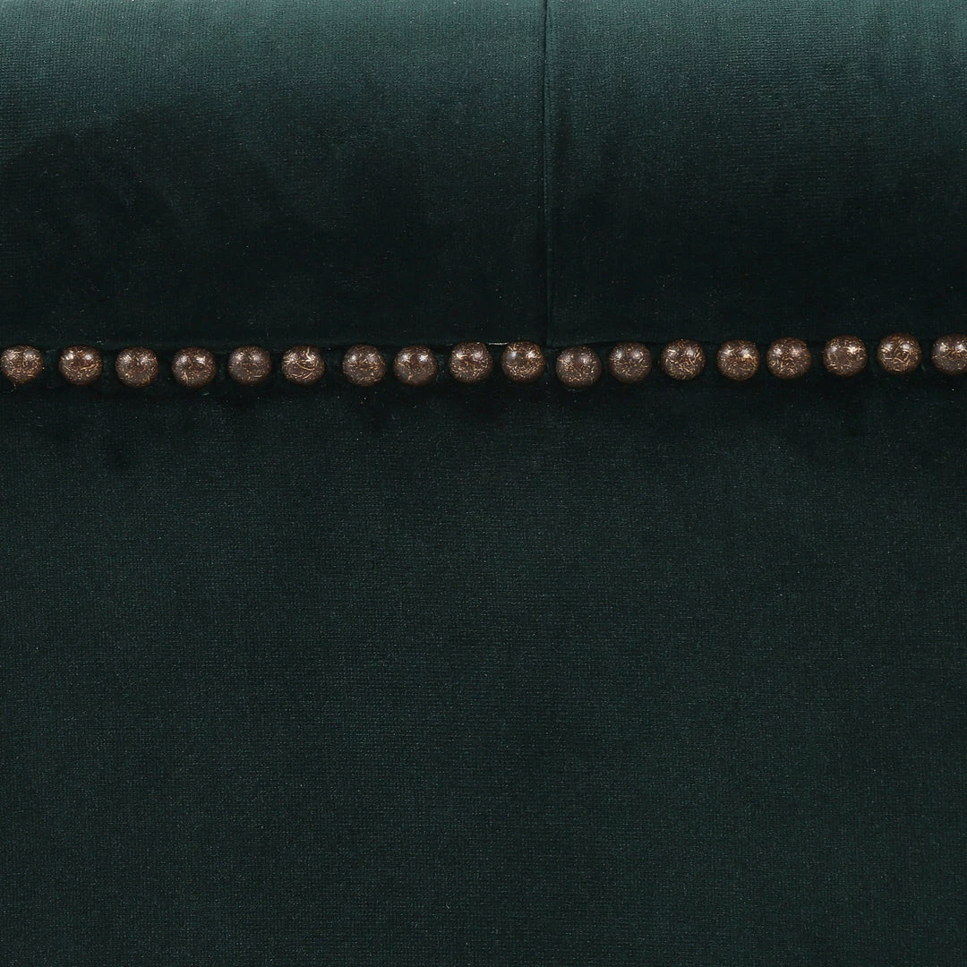 This modern take on the classic library sofa adopts a velvety jade poly-blend covering and mounted on a whitewash parawood base. Aged bronze nailheads add modernity.