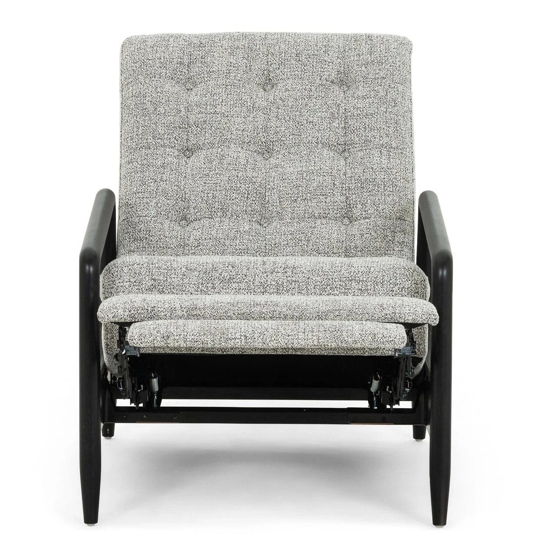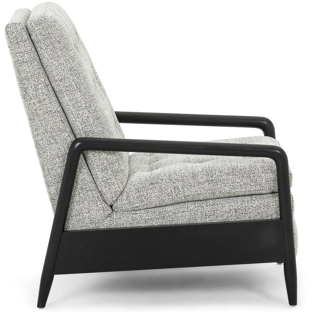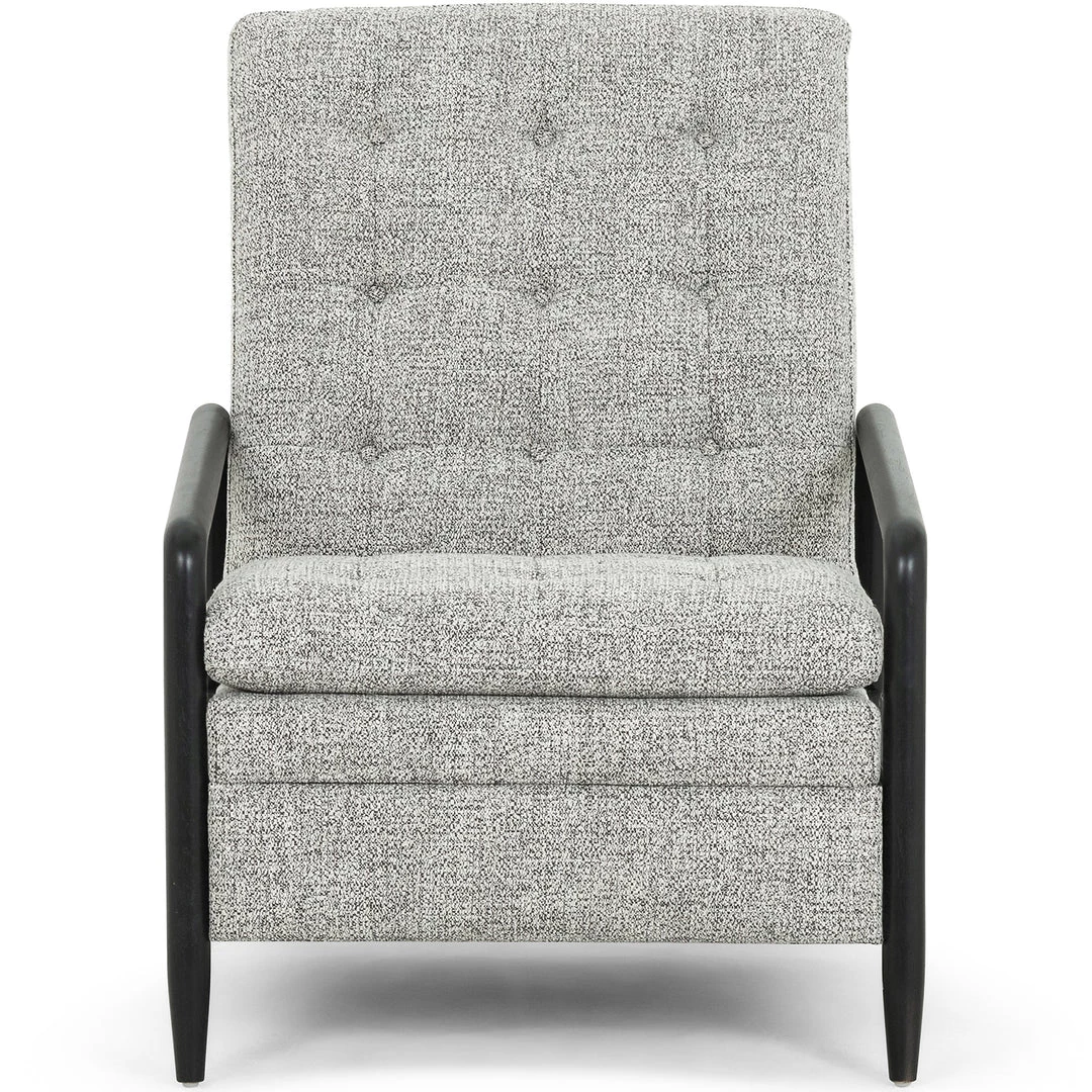 Recline in style. Button tufting and pewter-colored upholstery fuse for a textural twist on the classic recliner. Finished in a brushed ebony, sloped parawood arms add a modern finishing touch.