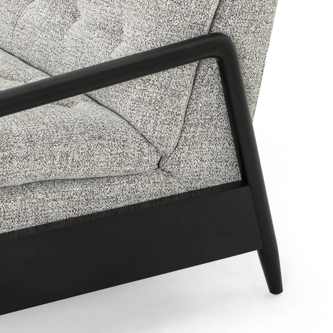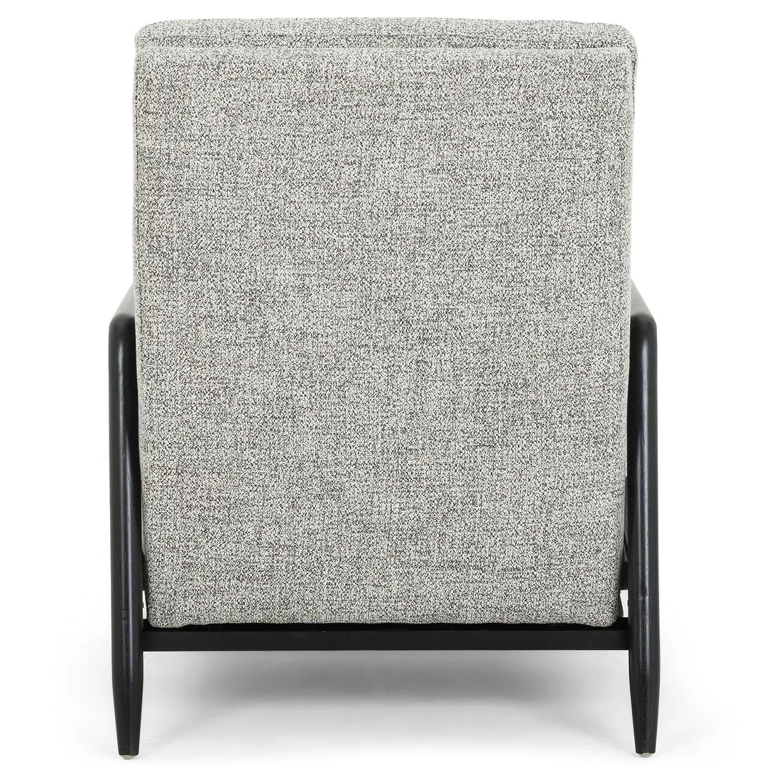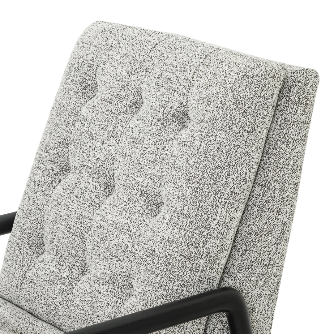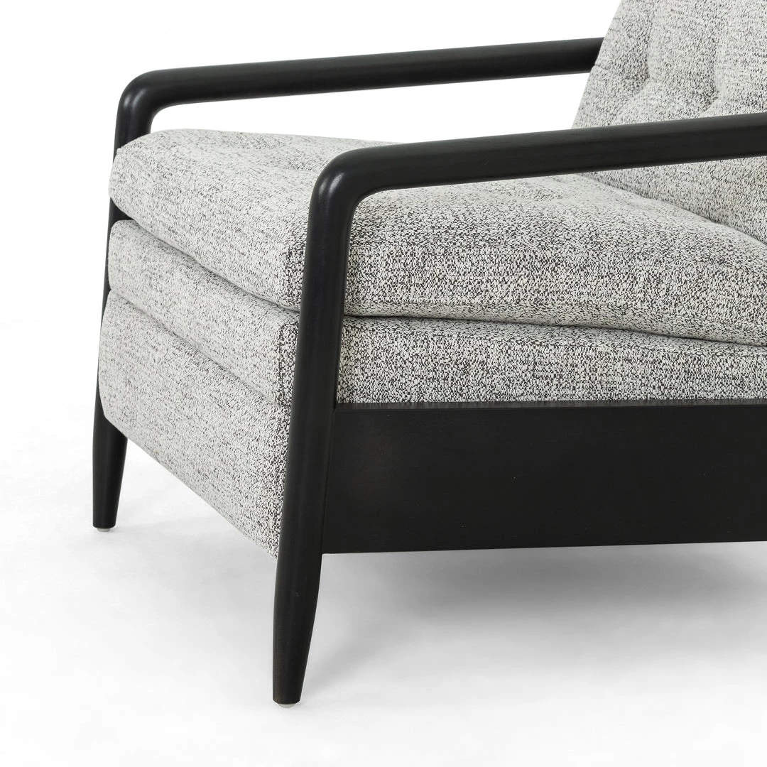 Recline in style. Button tufting and pewter-colored upholstery fuse for a textural twist on the classic recliner. Finished in a brushed ebony, sloped parawood arms add a modern finishing touch.