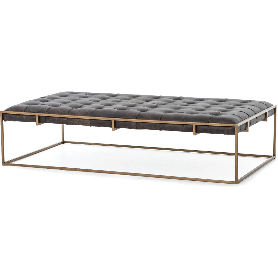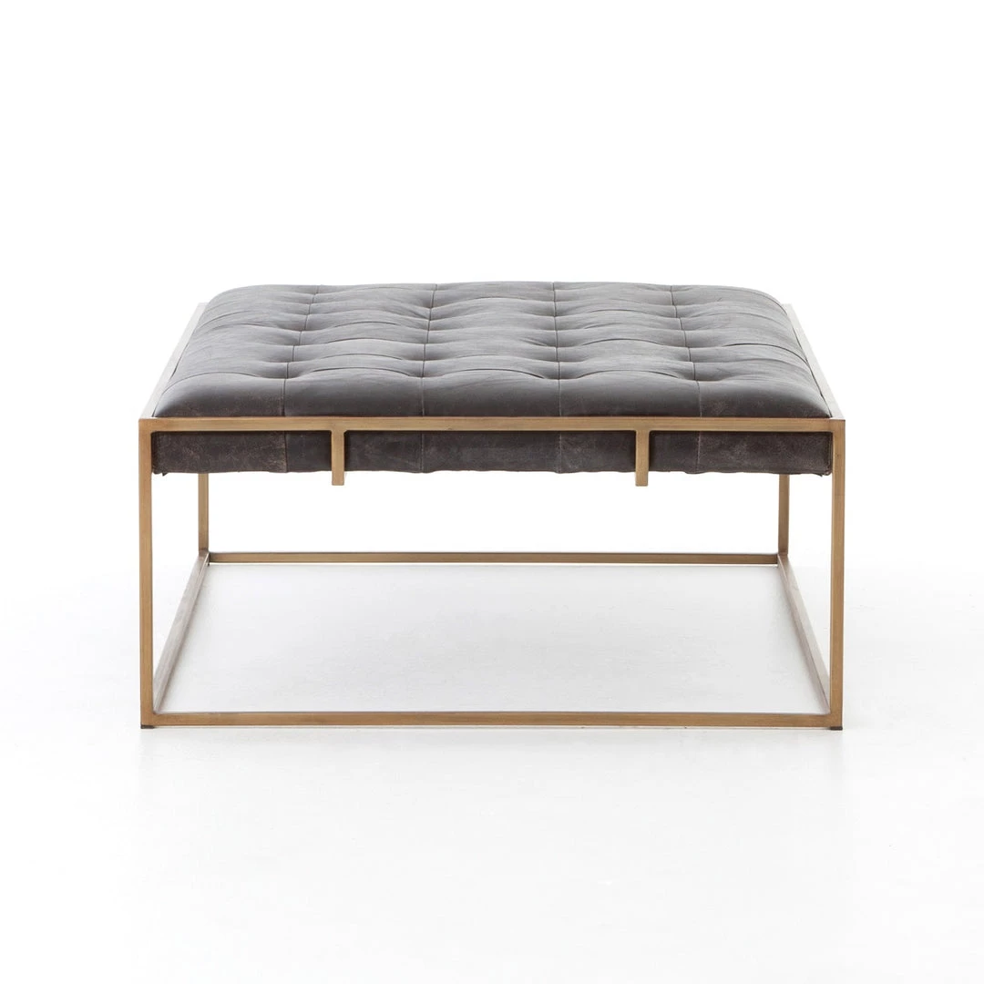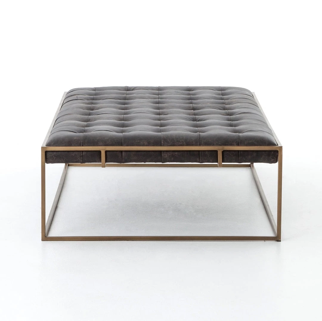 Traditional library style meets modern minimalism with this cocktail ottoman. Blind-tufted, top-grain leather tops float inside an antique brass Parsons base with cage-like detailing. A grid-tufted top-grain vintage leather cushion floats inside an antique brass frame to create this tailored yet soft coffee table option.