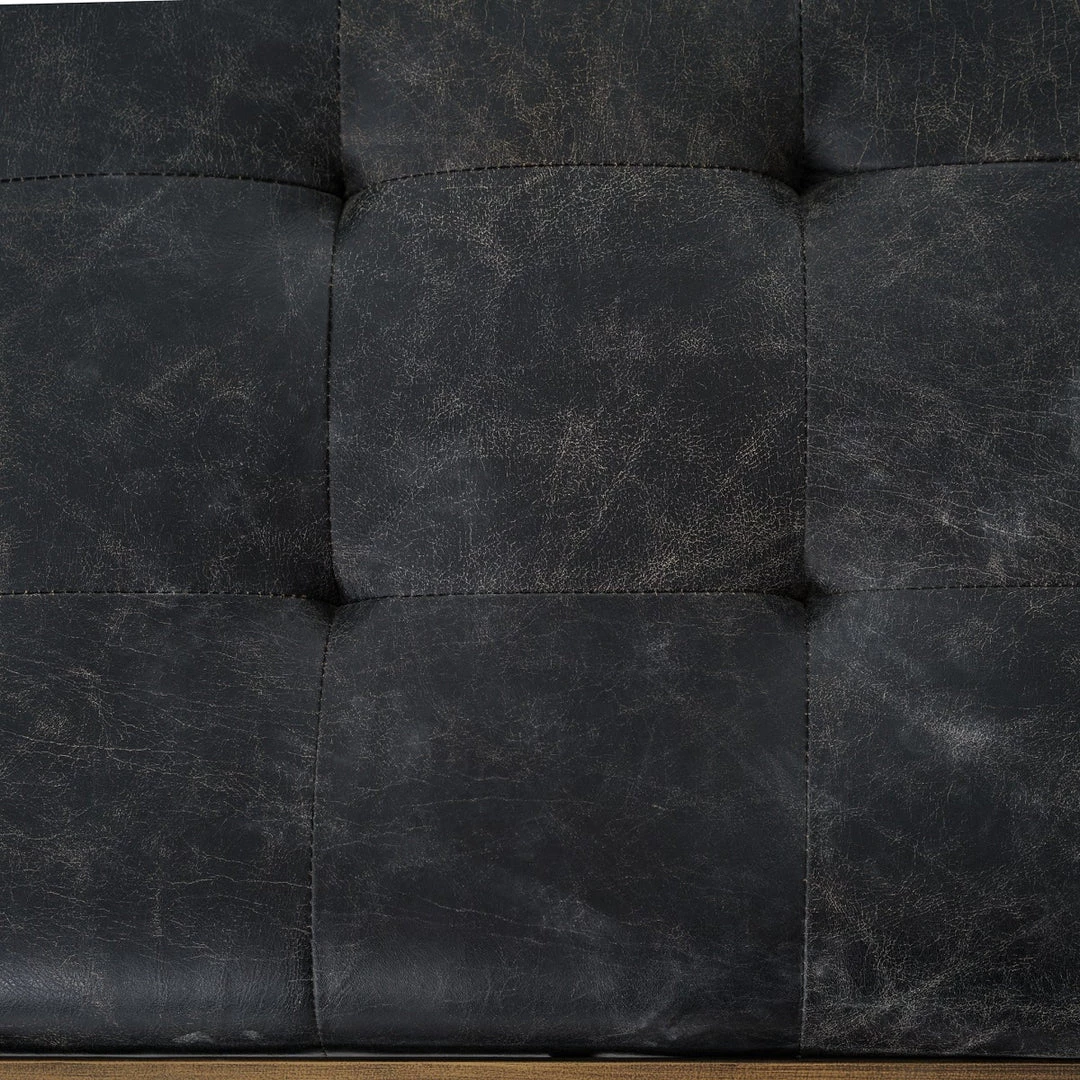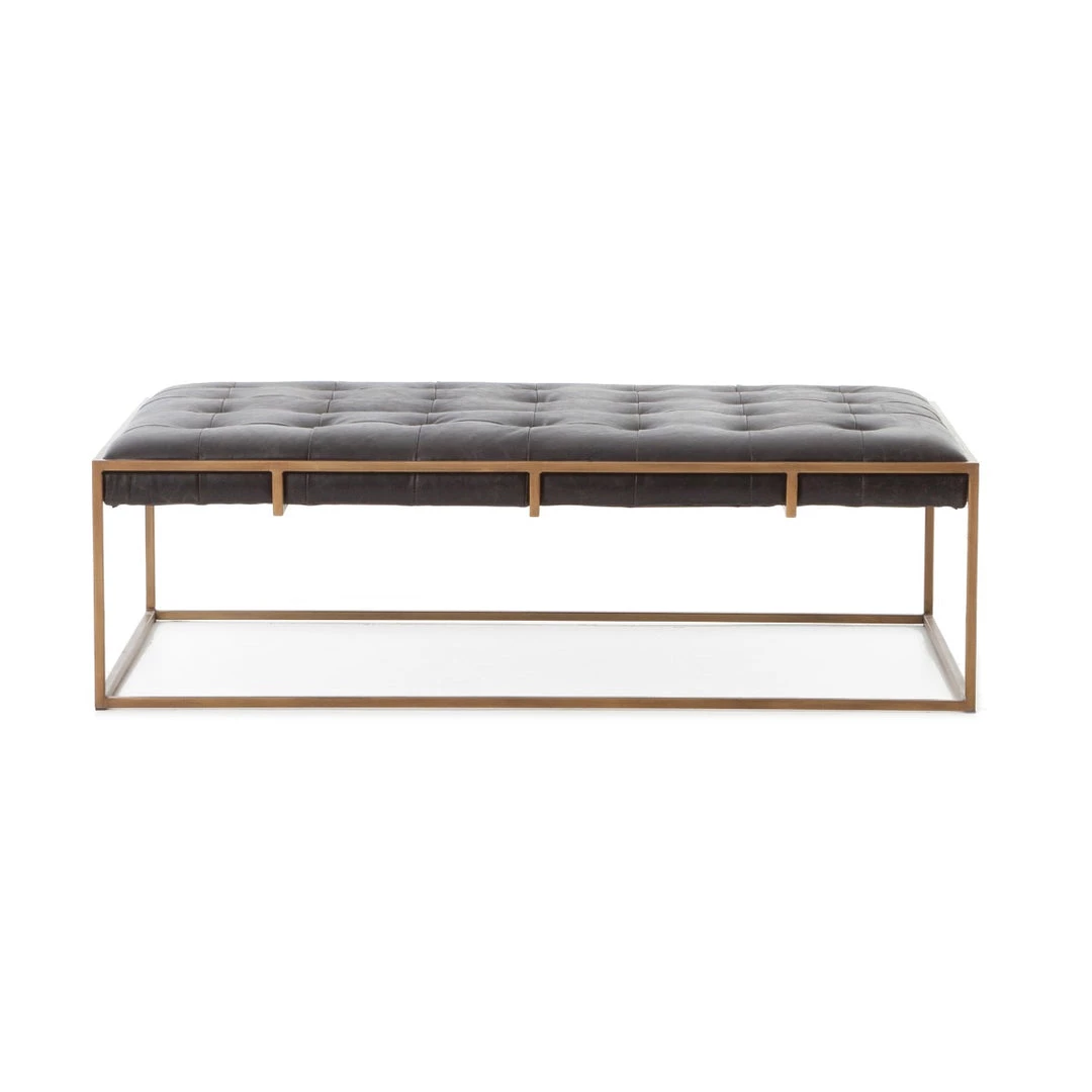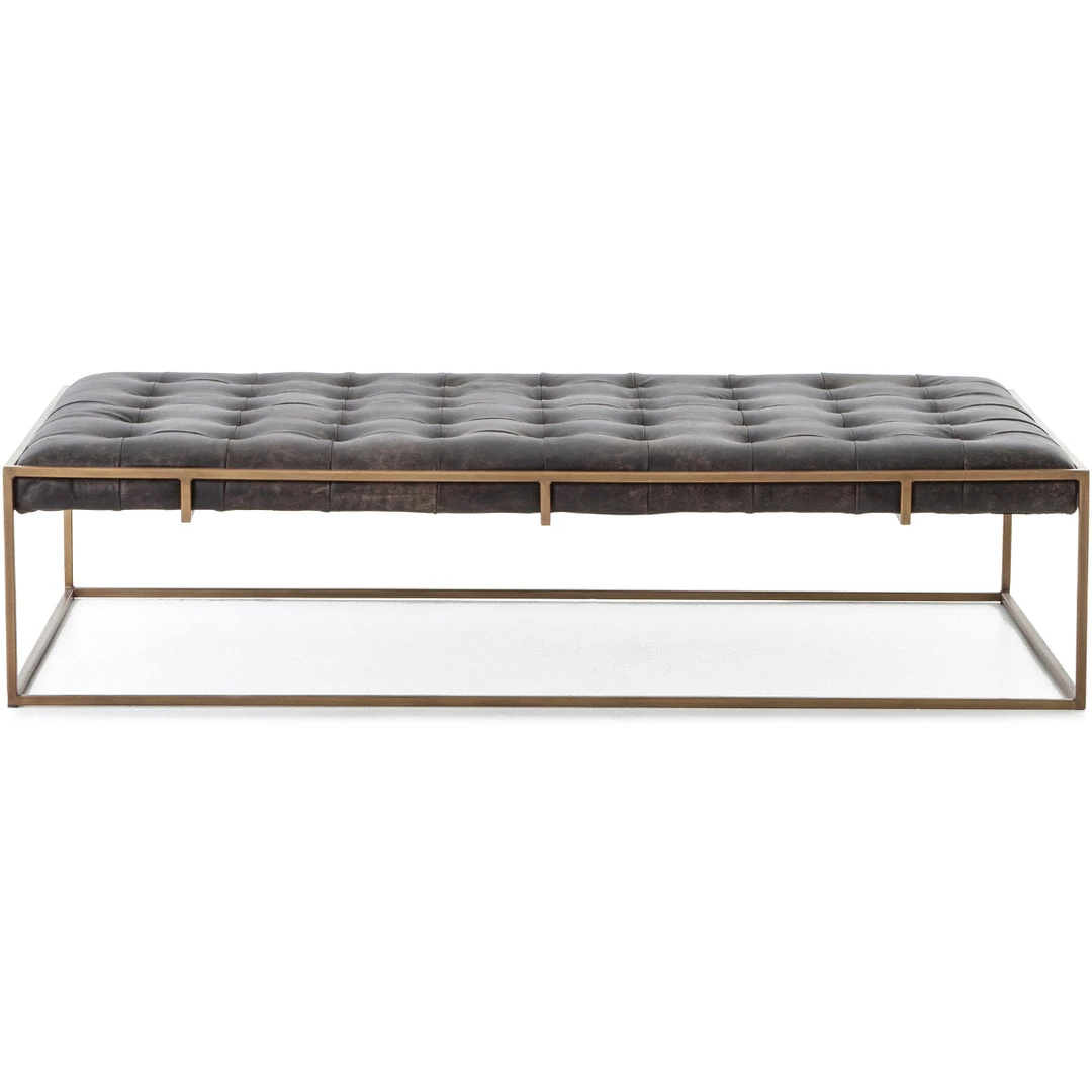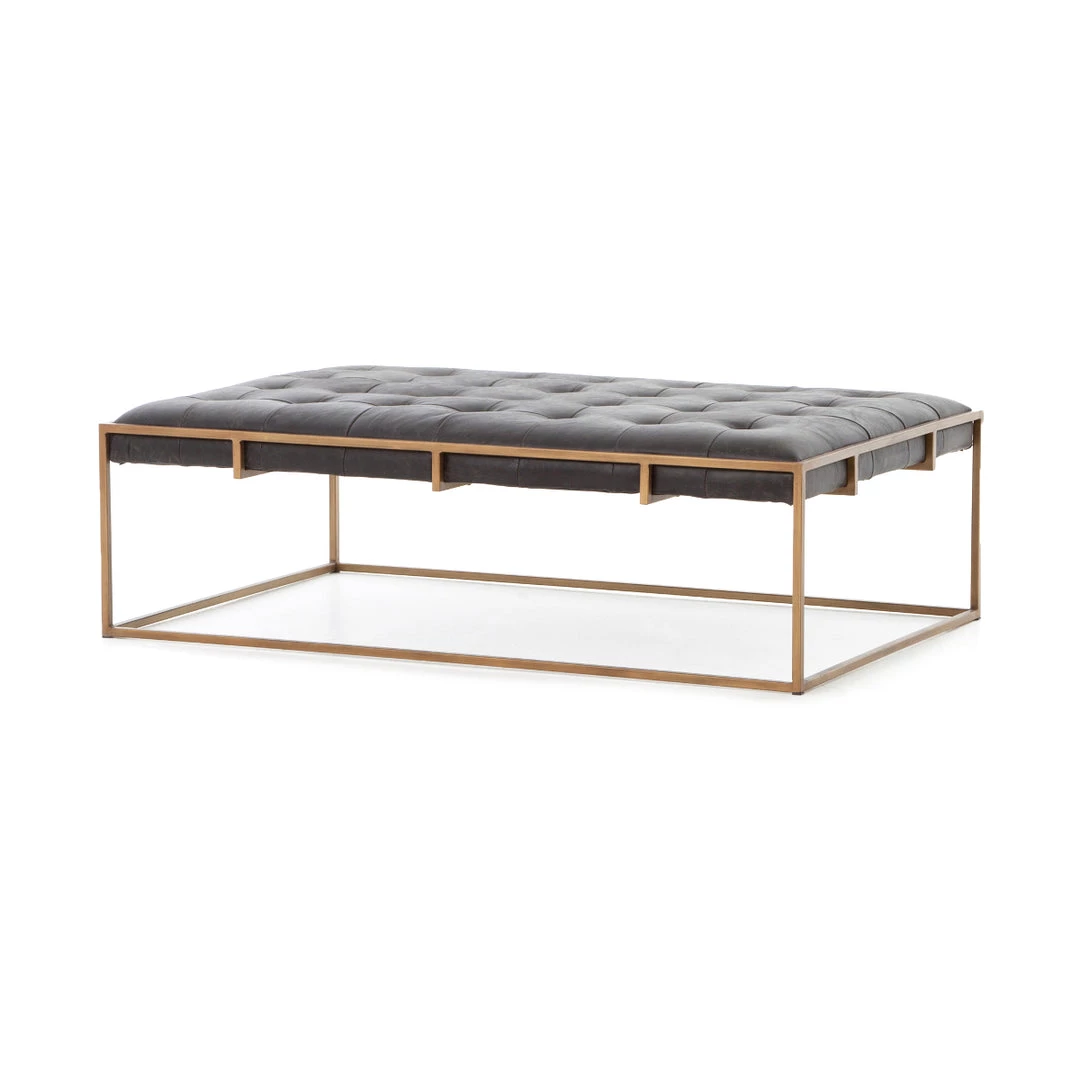 Traditional library style meets modern minimalism with this cocktail ottoman. Blind-tufted, top-grain leather tops float inside an antique brass Parsons base with cage-like detailing. A grid-tufted top-grain vintage leather cushion floats inside an antique brass frame to create this tailored yet soft coffee table option.