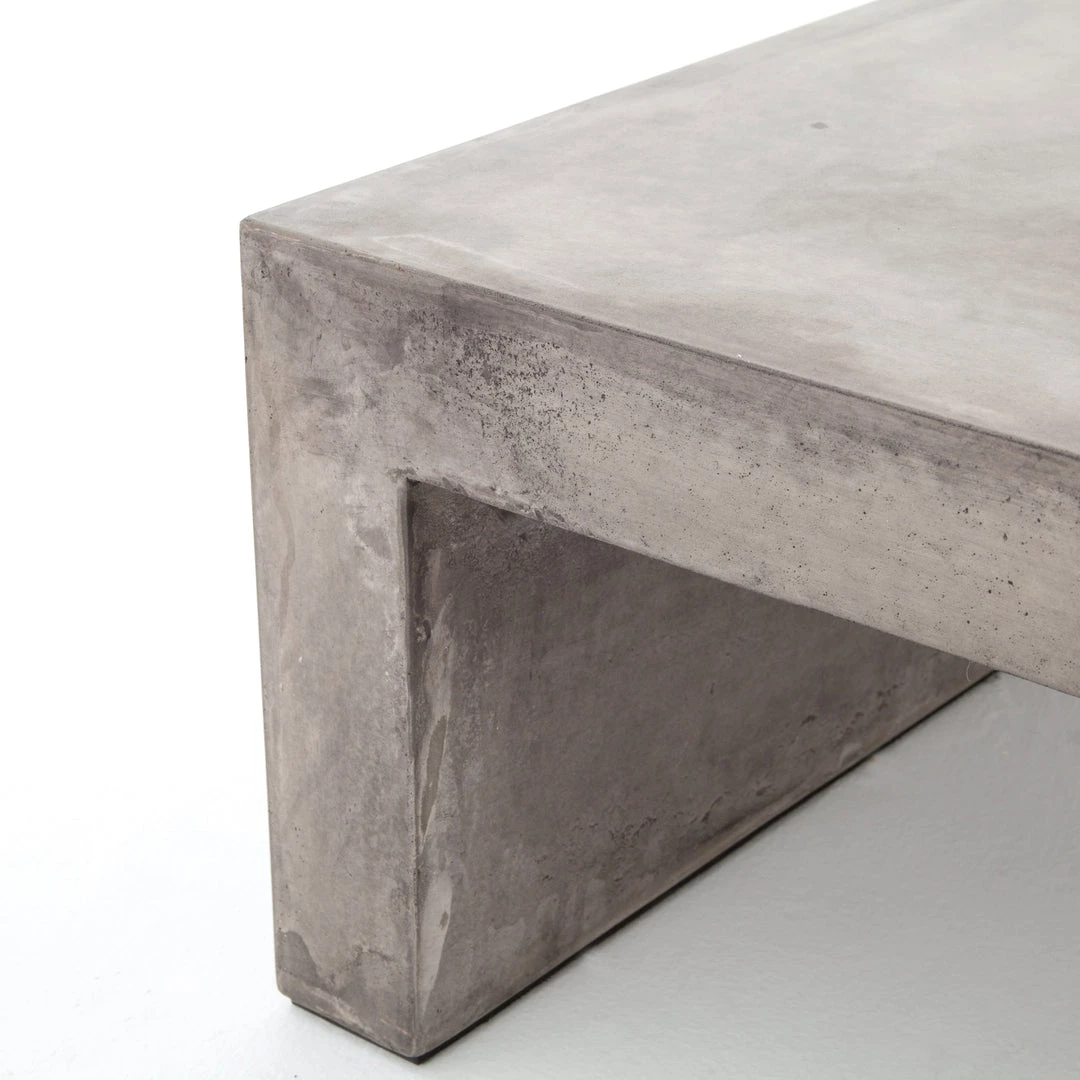 Industrial materials in smoothly refined shapes. Natural grey concrete forms a simple waterfall coffee table.