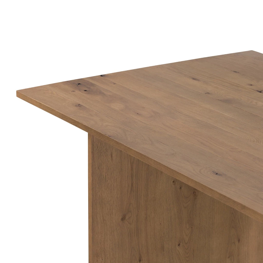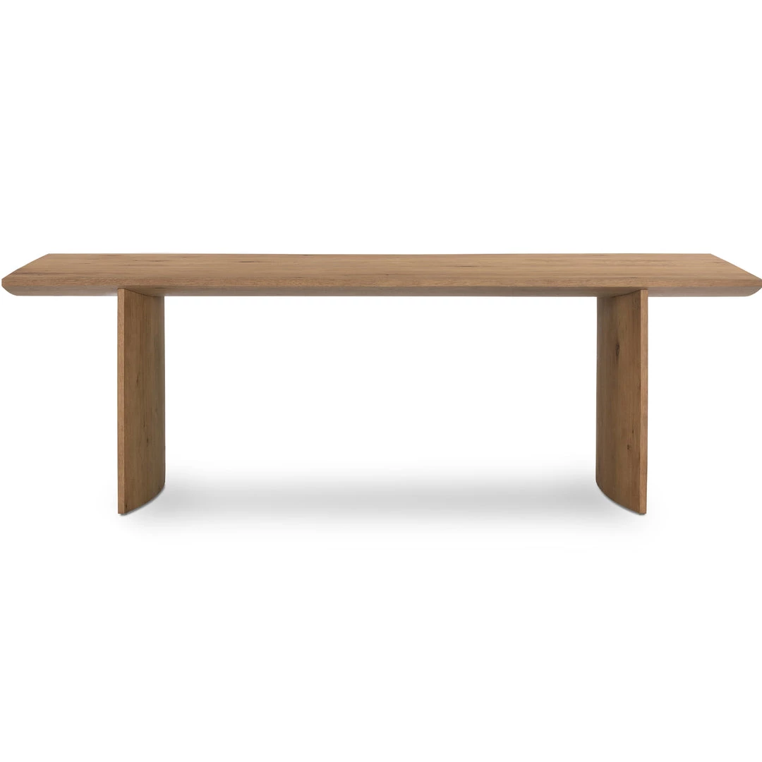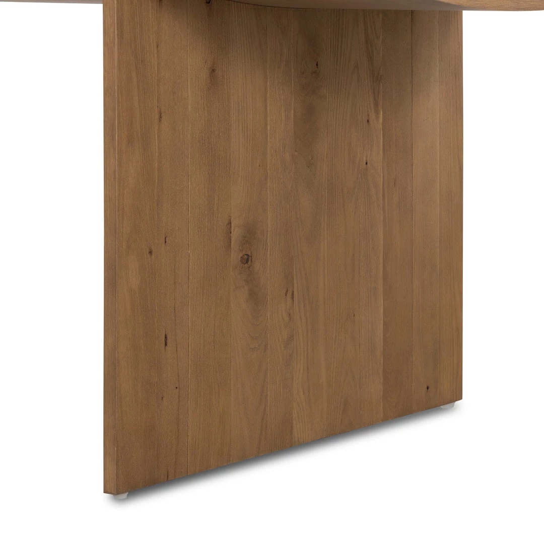 A shape-driven dining table made from thick-cut oak veneer features overscale proportions and half-moon shaping in a warm dusty-brown finish.
