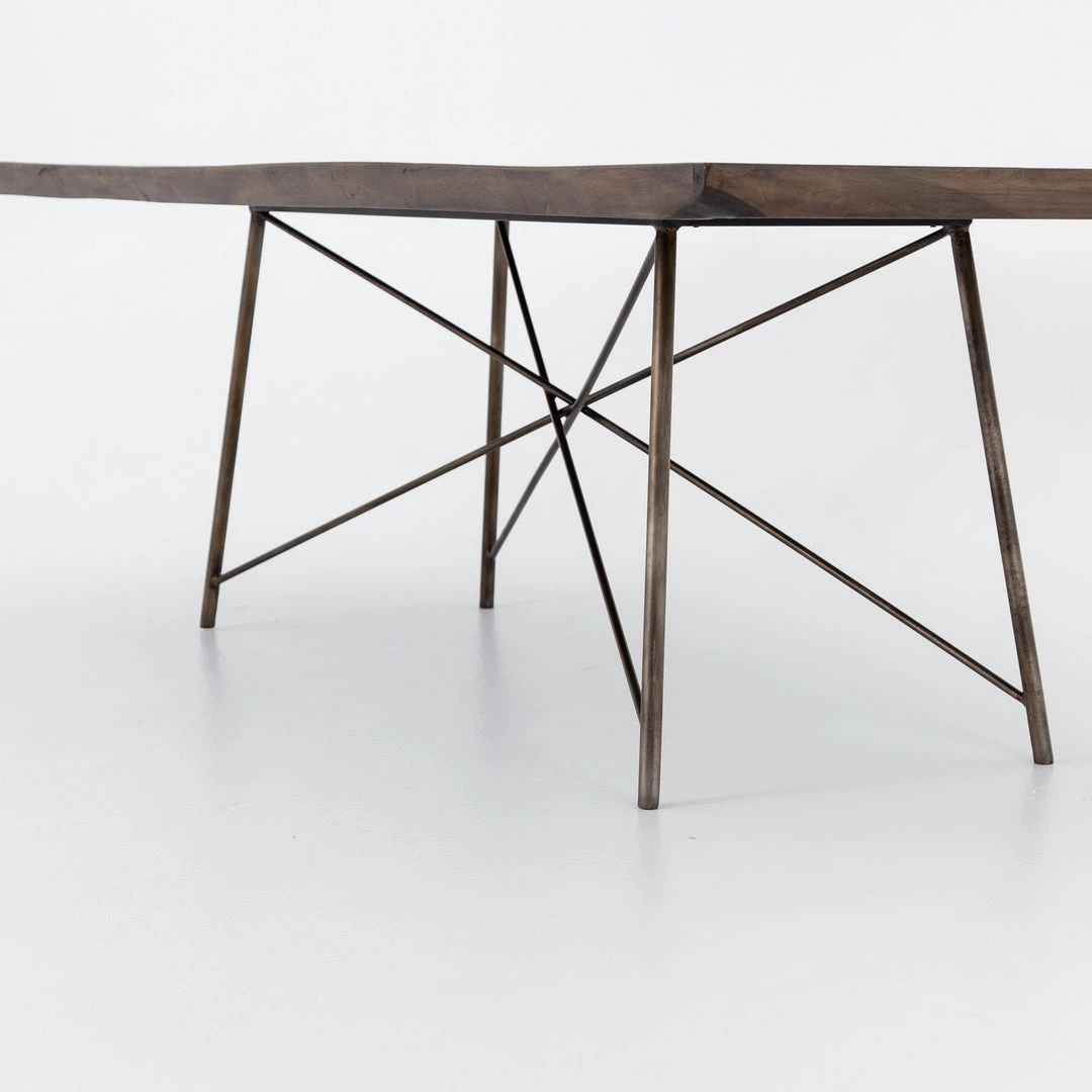 X marks the spot. A bronzed iron base strikes a spare, geo-inspired shape to support a top of smoked saman wood veneer, bringing an intriguing contrast of texture and trend to the dining table.