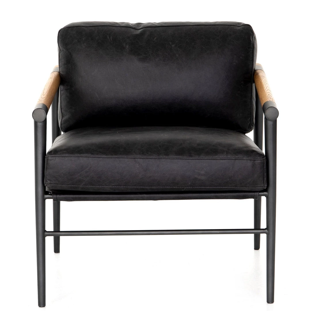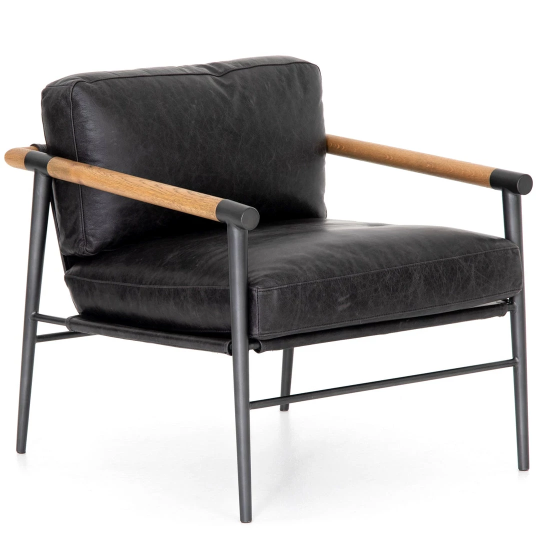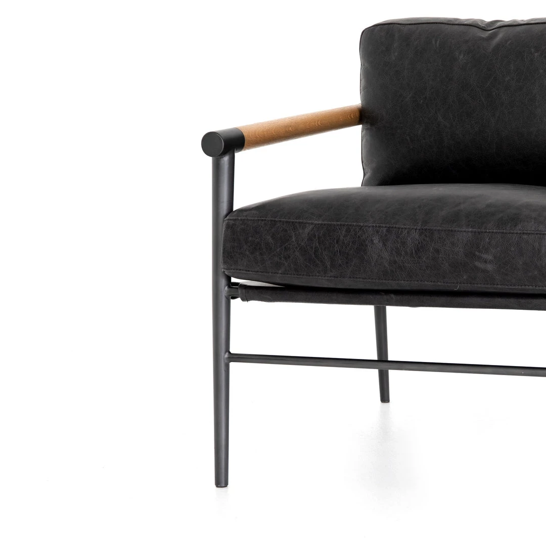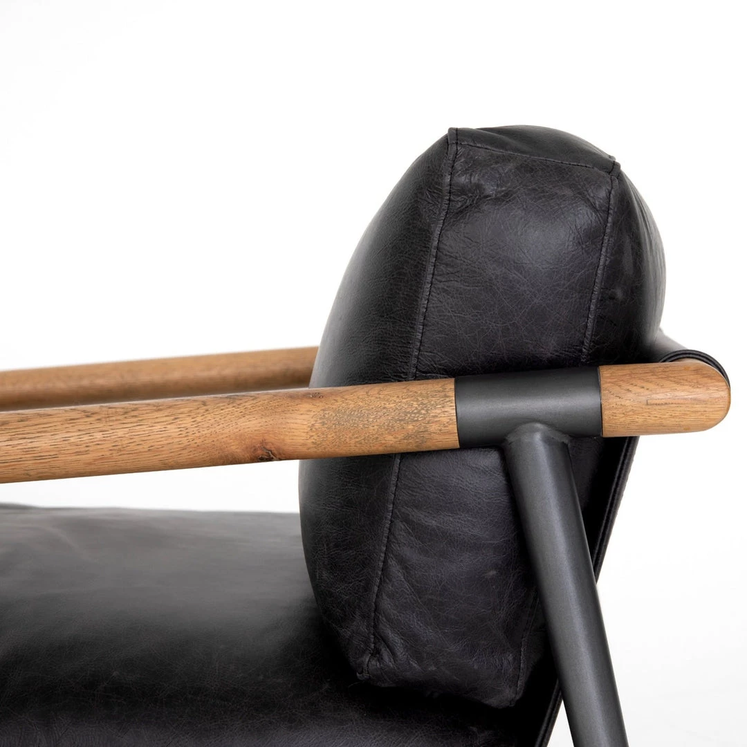 Buttery black seating of Four Hands-exclusive top-grain leather, with angular arms of exposed oak providing fresh contrast. Slim, carbon-finished steel legs for a dose of modern-industrial edge.