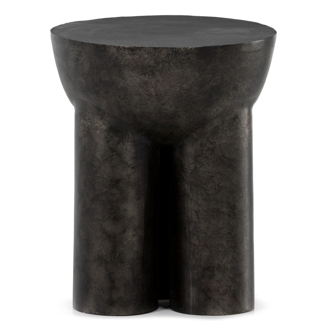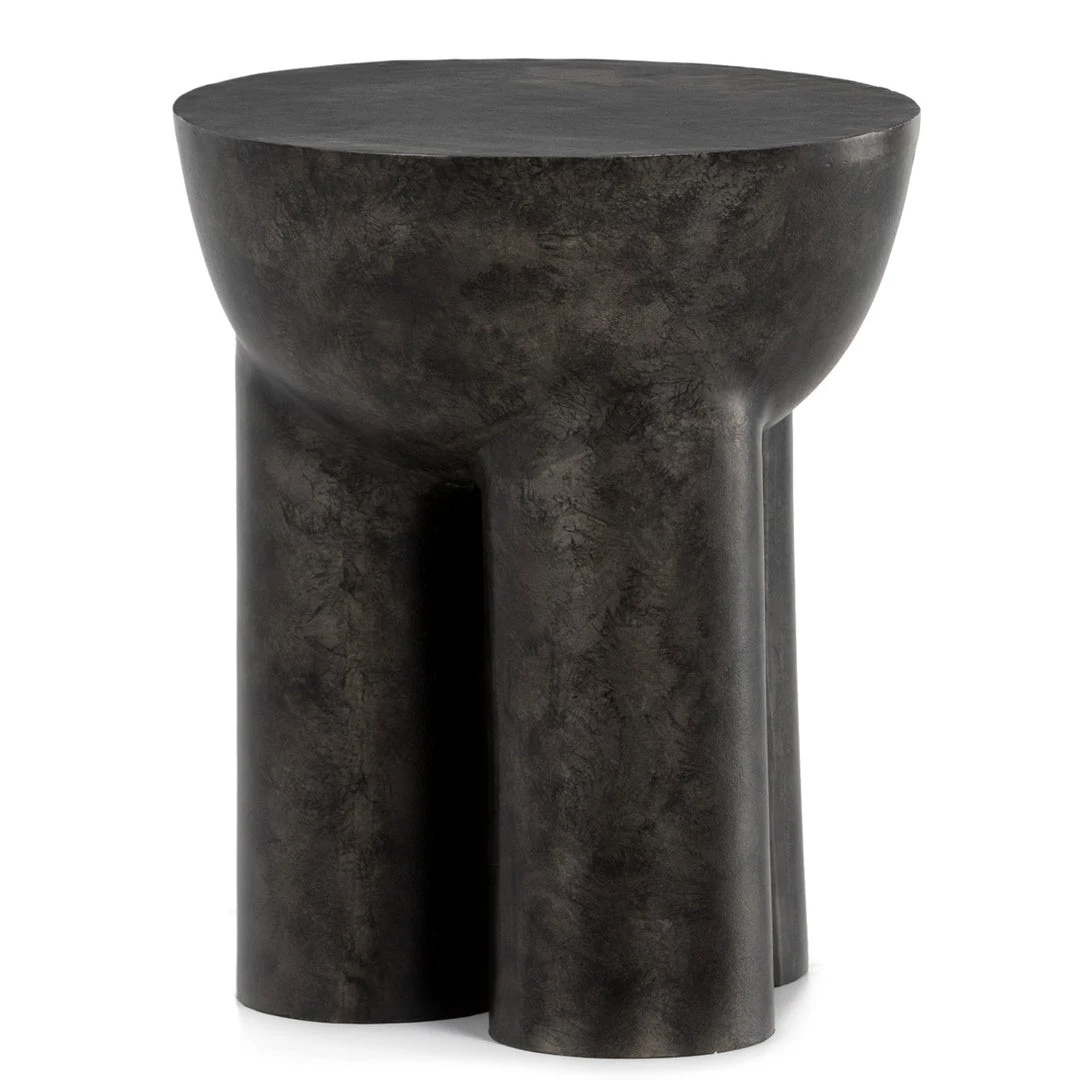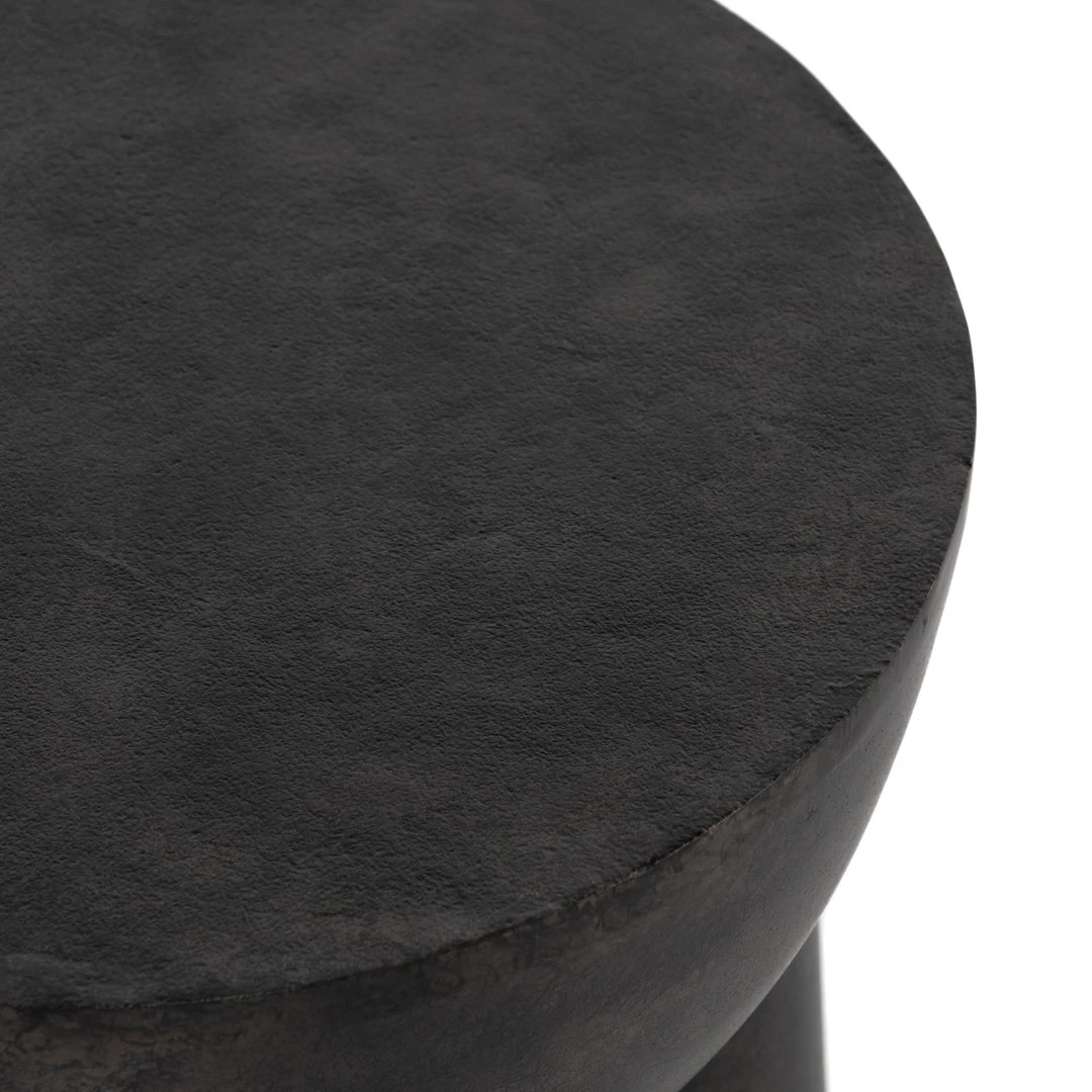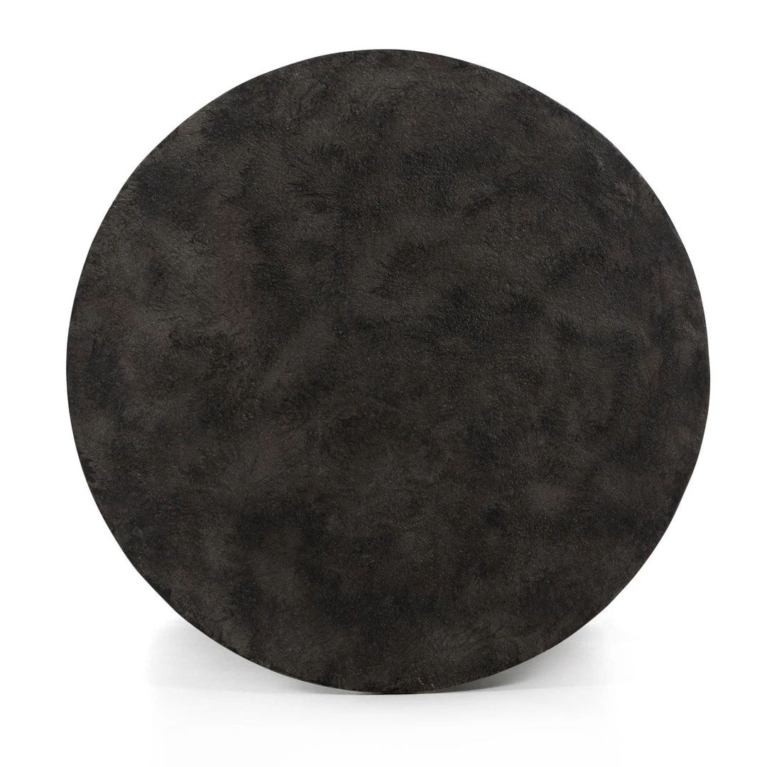 Made from raw black cast aluminum, a chunky cylinder base supports a drum-style tabletop with naturally beautiful high/low hues.