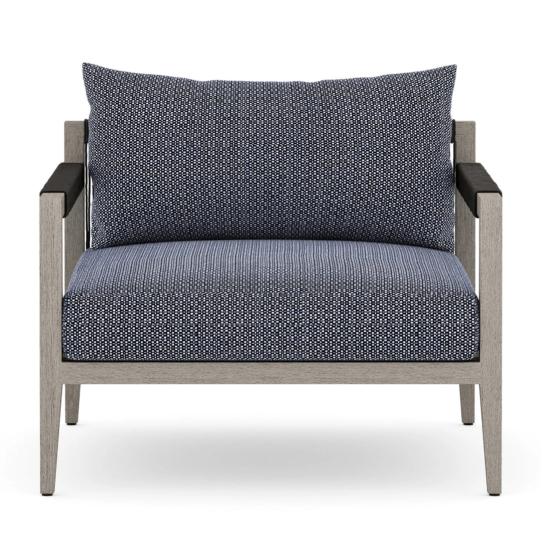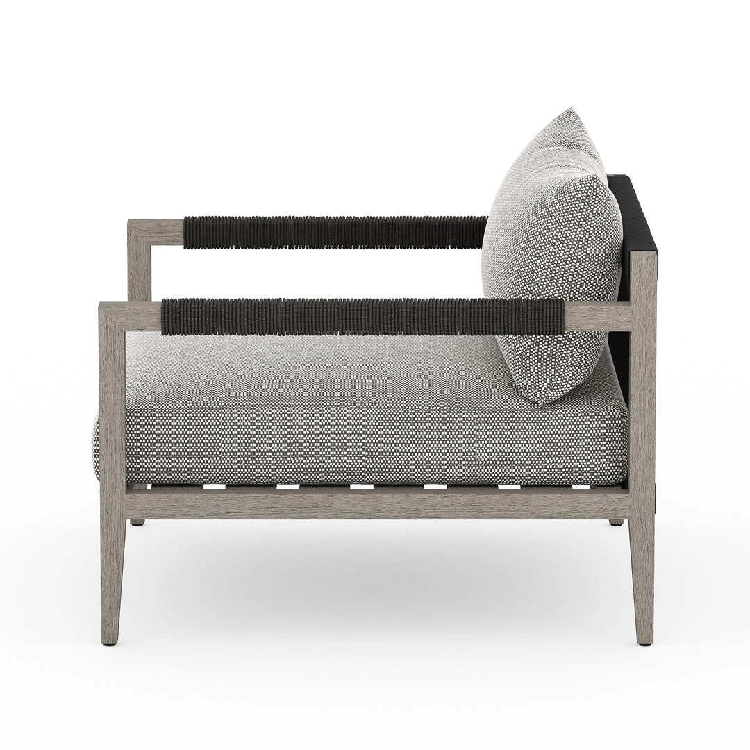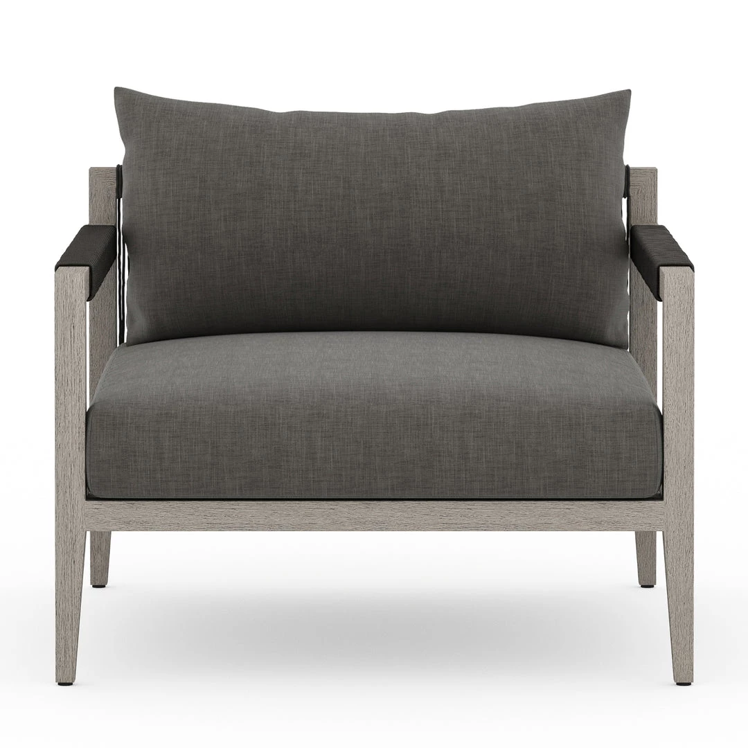Modern materials ready a stylish silhouette for the outdoors. Weathered grey teak forms a clean frame for UV-resistant and water-repellent Sun-proof fabric.