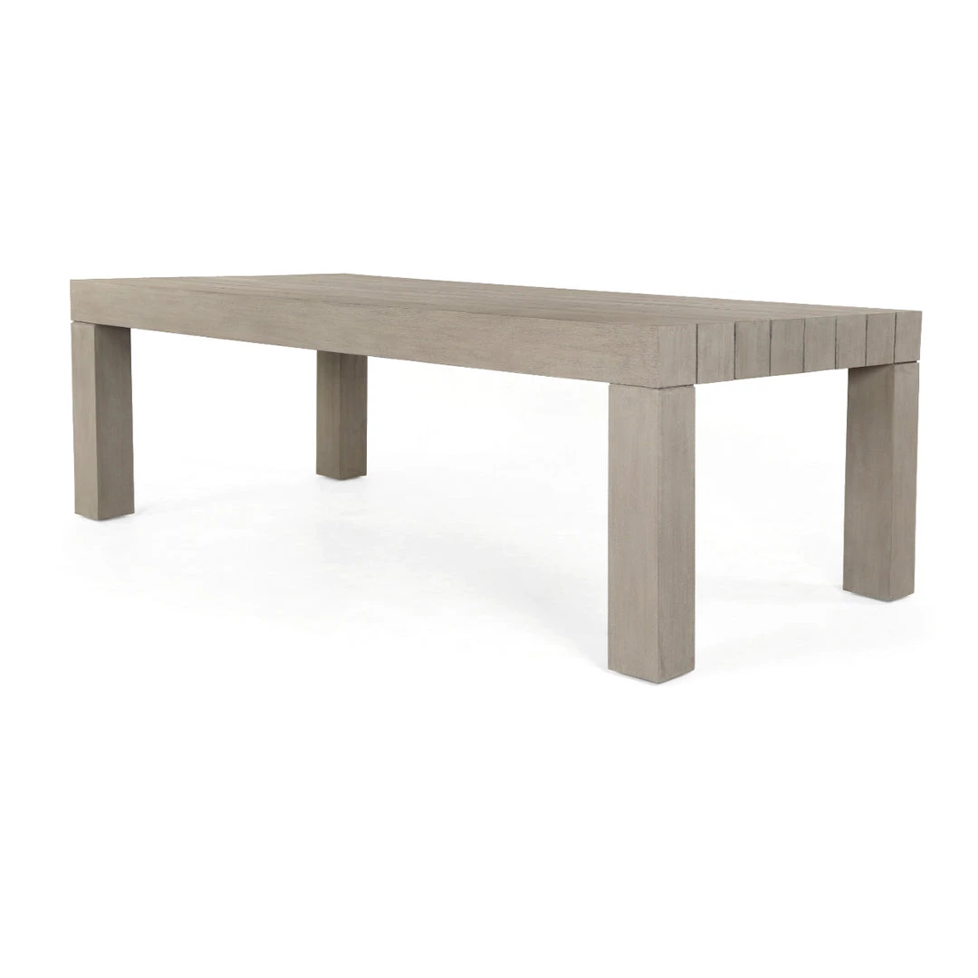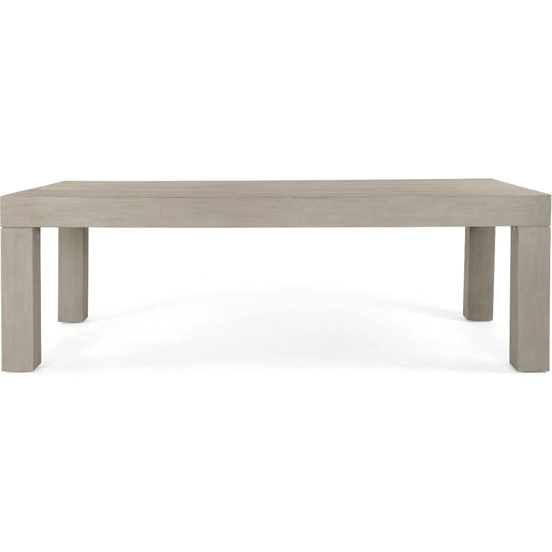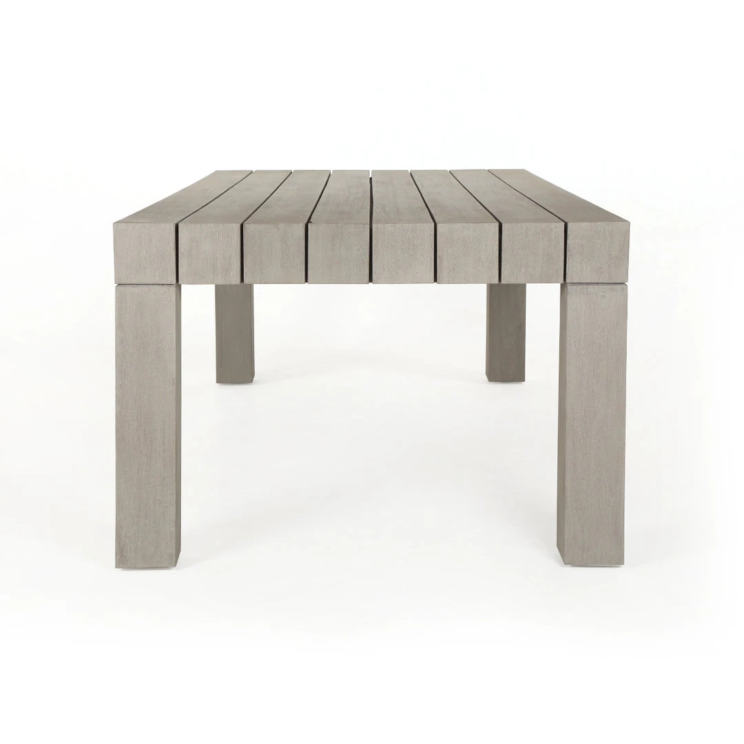 Organic elements, indoors or out. Teak wood is fashioned into a clean-lined dining table and weathered to a natural finish.