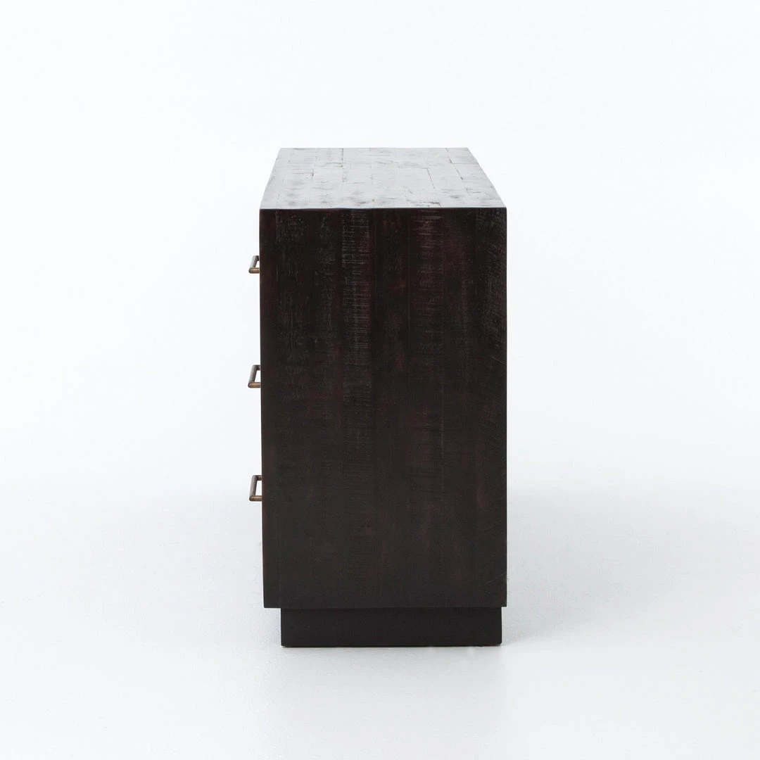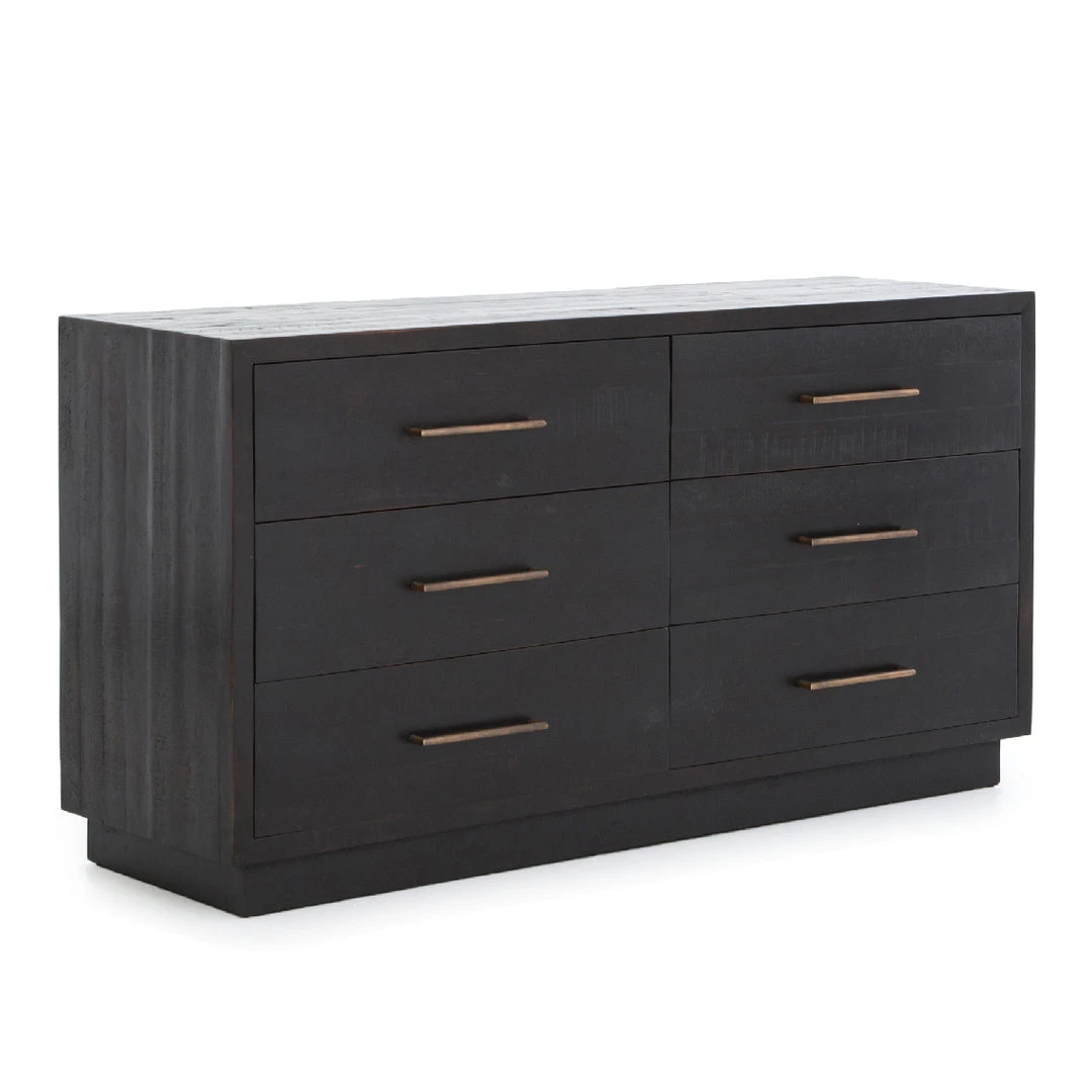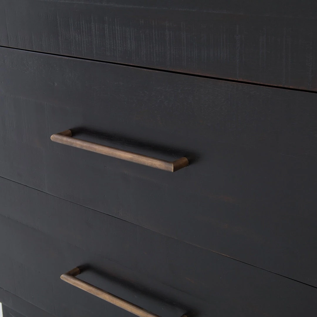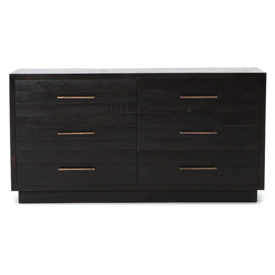 Simple with a modern edge. Solid acacia in a burnished black finish forms clean lines while brass hardware adds a sleek touch to six spacious drawers.