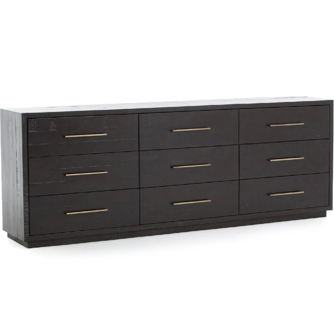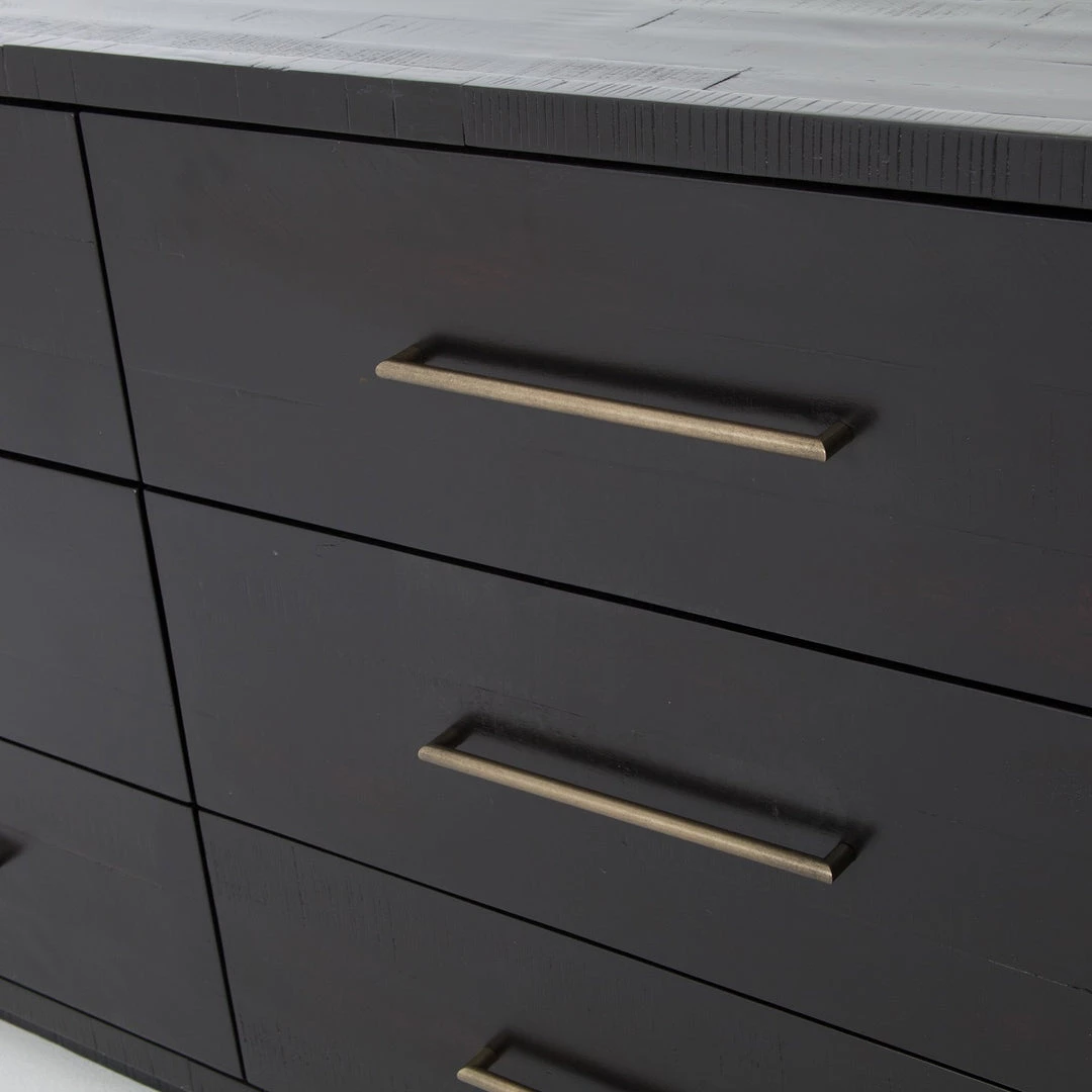 Simple with a modern edge. Solid acacia in a burnished black finish forms clean lines while brass hardware adds a sleek touch to nine spacious drawers.