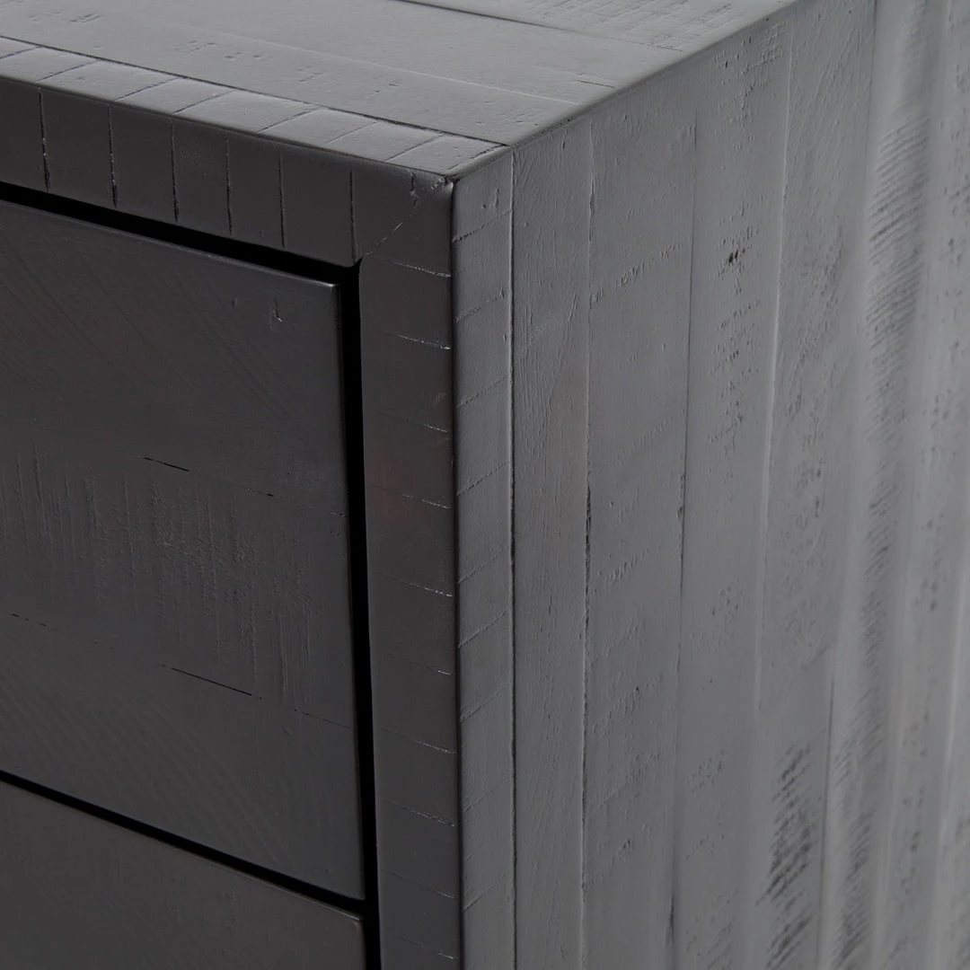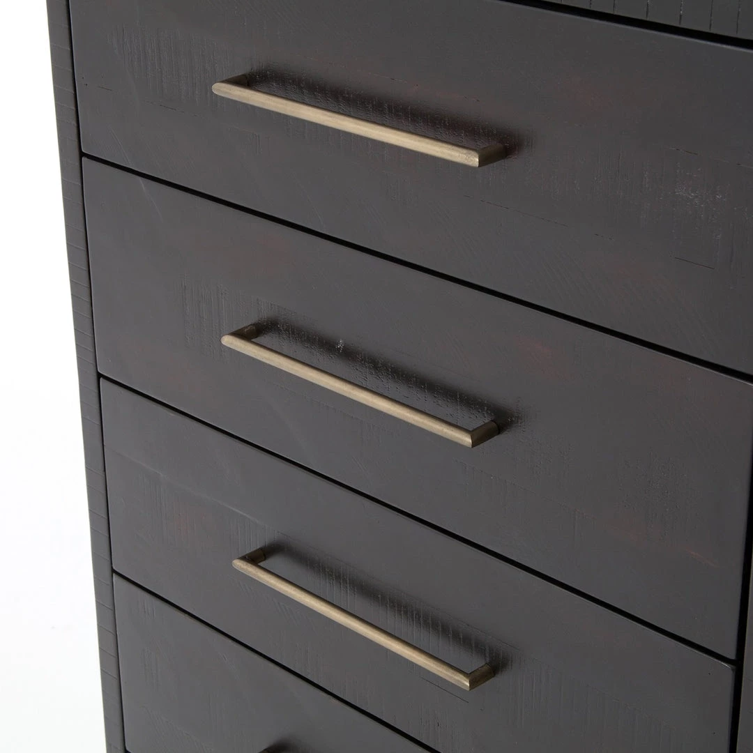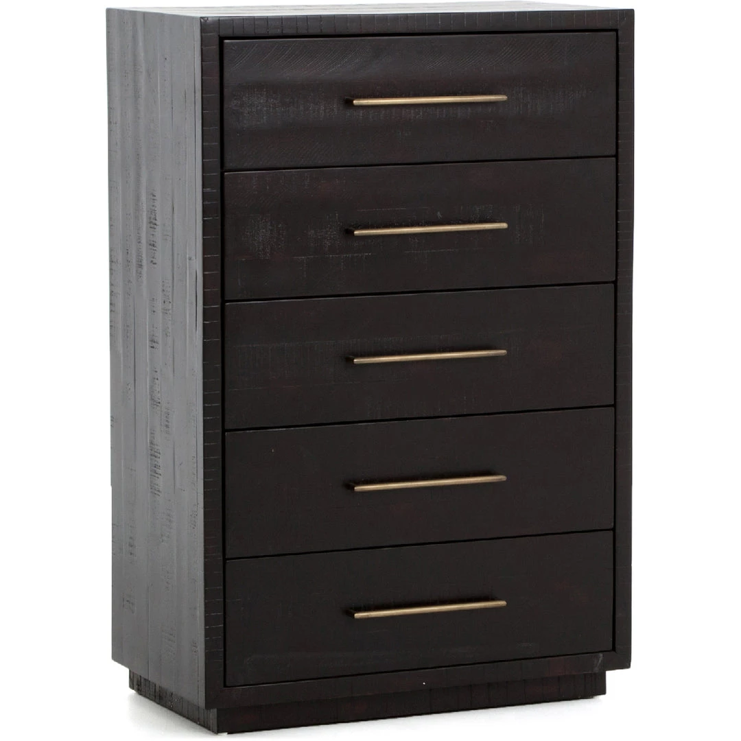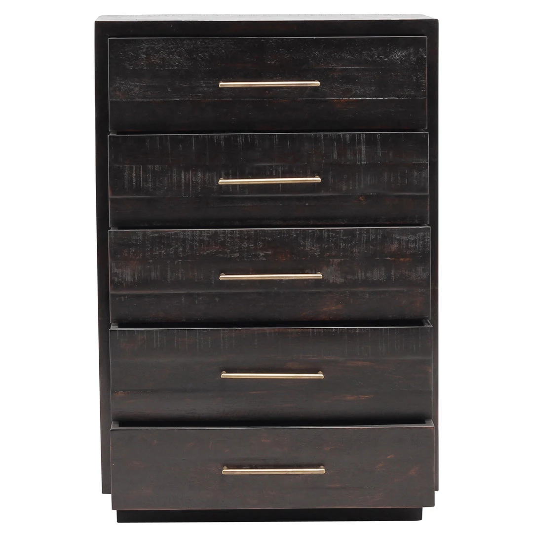 Simple with a modern edge. Solid acacia in a burnished black finish forms clean lines while brass hardware adds a sleek touch to five spacious drawers.
