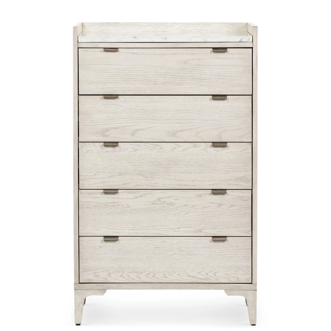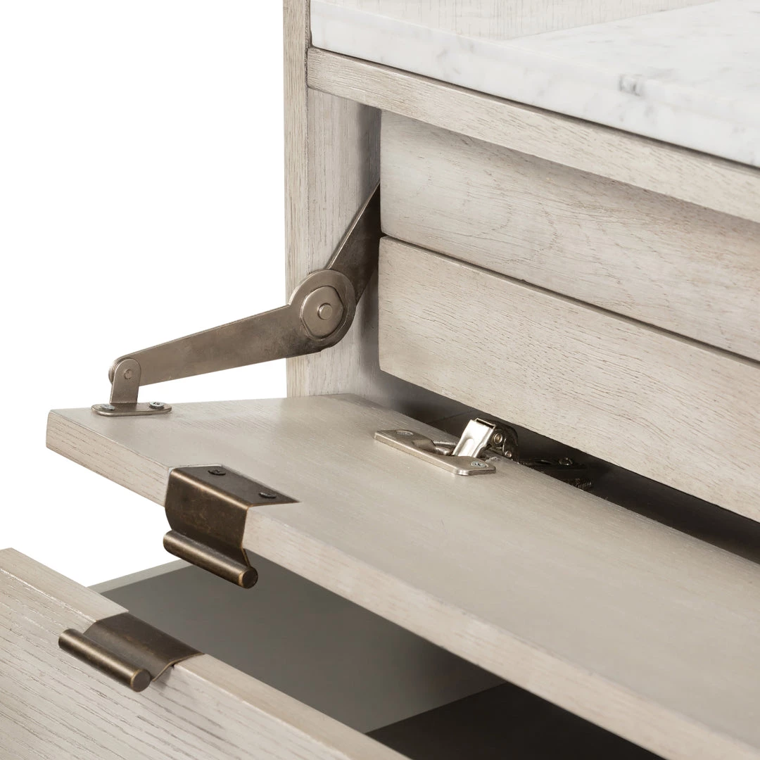 Vintage white oak is finished with a dry hand for a light look, while a top of white Italian marble offers a sophisticated material mix. Top drawer features a clever drop-down front, revealing two smaller drawers, perfect for storage of jewelry and accessories.