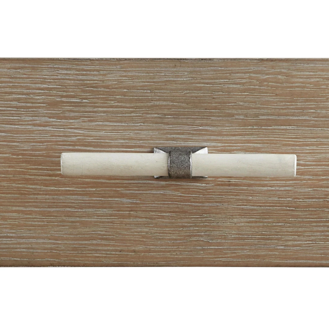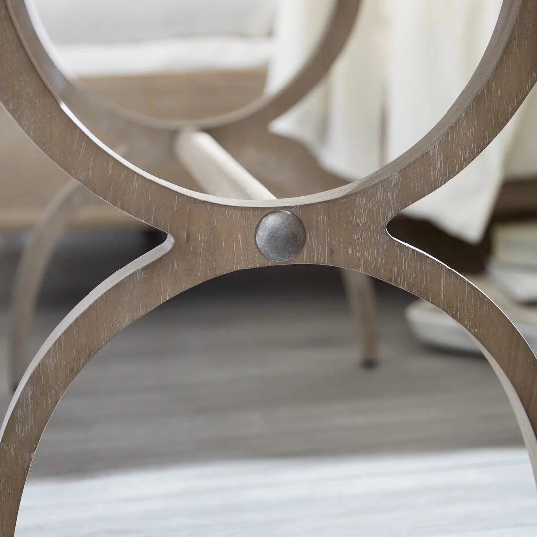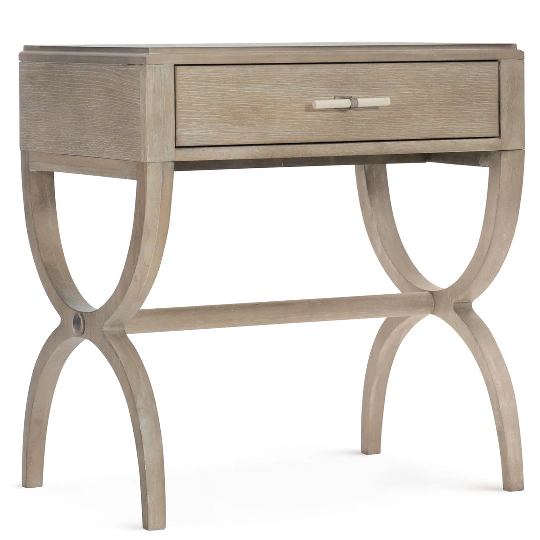 Sleek and sophisticated, the Affinity Leg Nightstand blends a simple one-drawer top with a pewter and antique white bar pull with an intriguing base combining rounded X-motif legs and a center stretcher. Finished in sand-blasted greige (gray/beige) on quartered white oak.