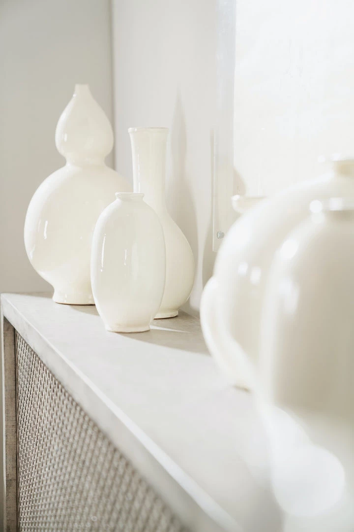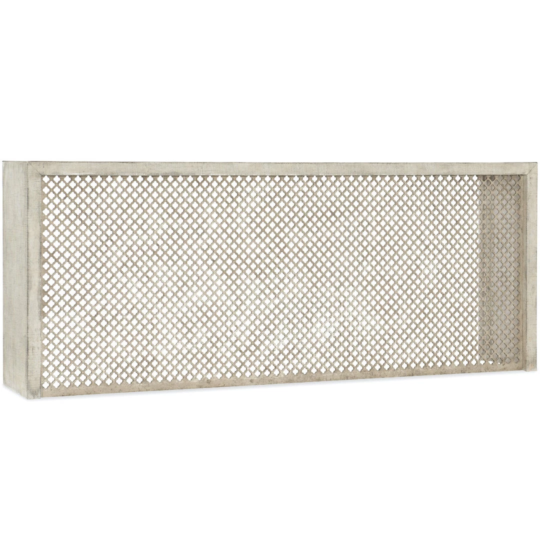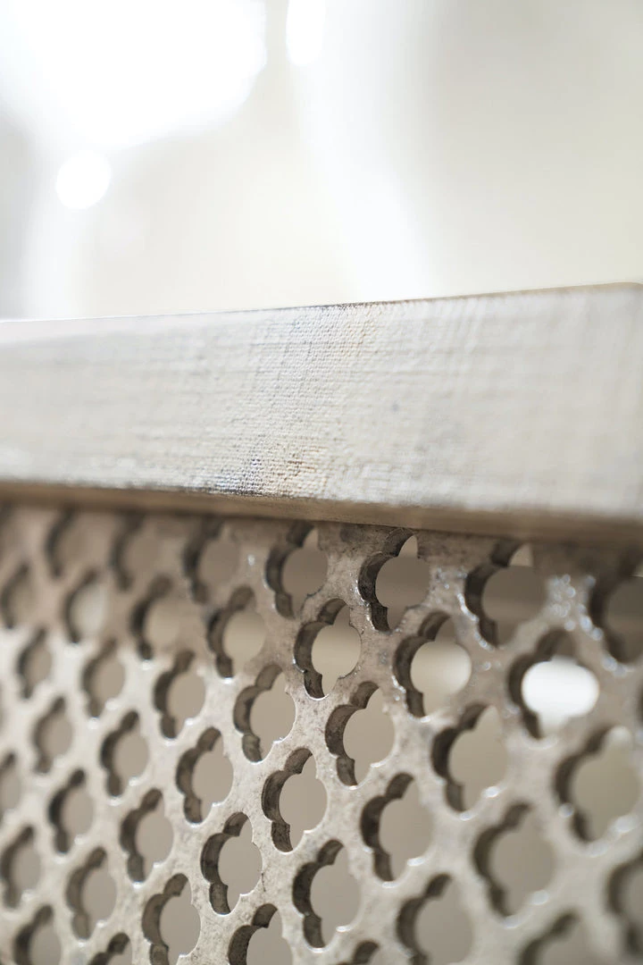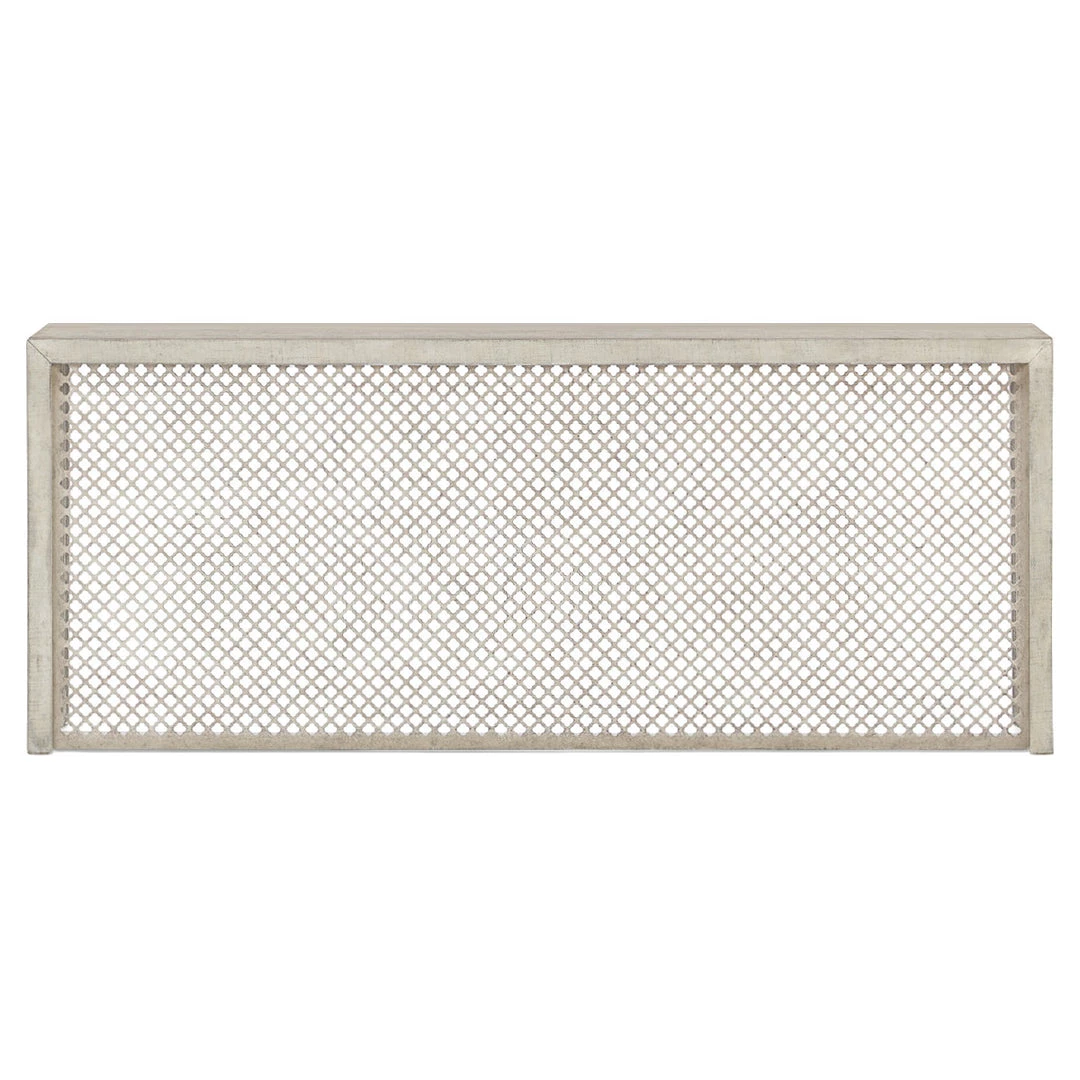 Inspired by the Belgian design aesthetic, this distinctively designed console combines a perforated wood grill pattern on the front with the tactile Grain Sack finish, plaster applied over distressed linen to give the authentic look of a plaster wall.