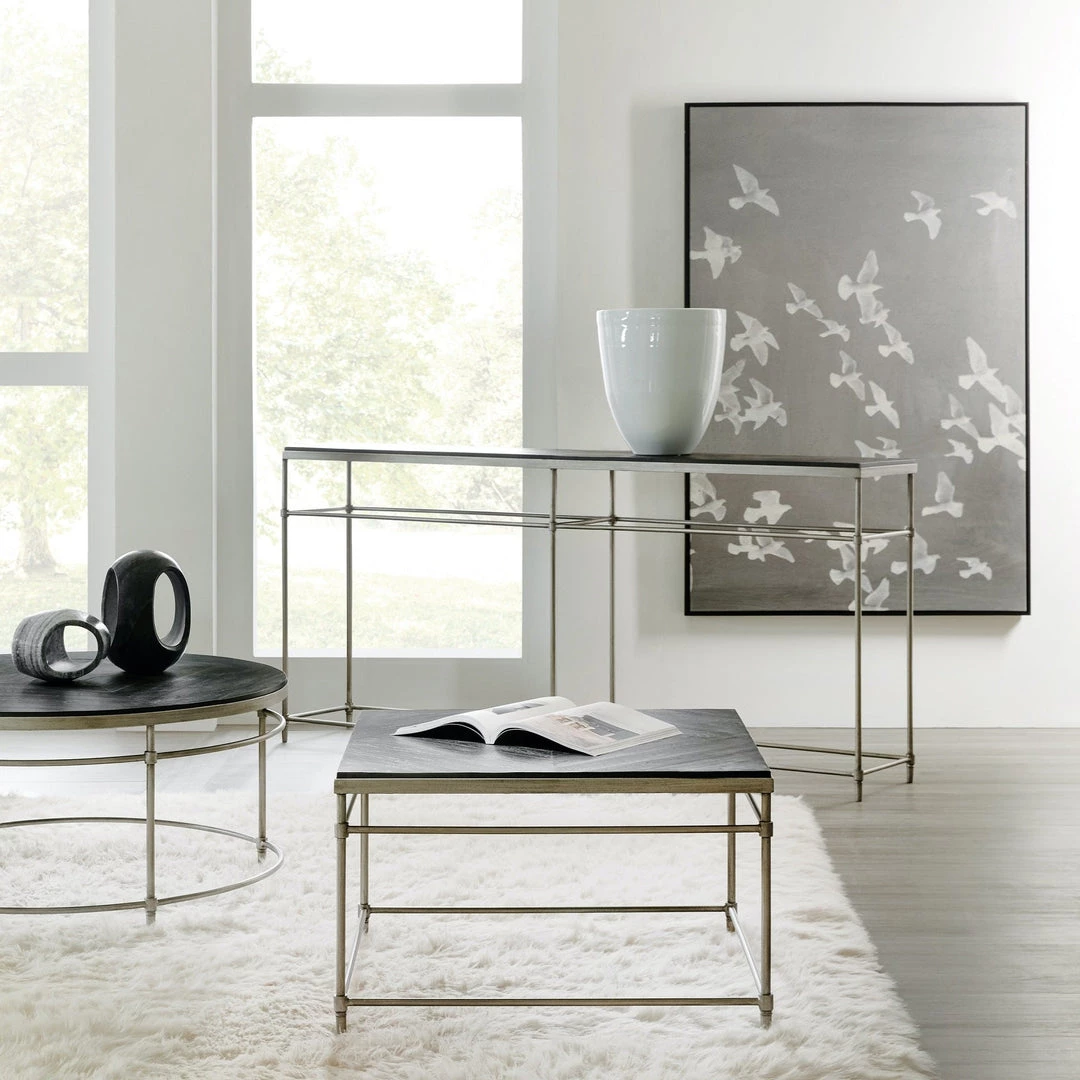 Light and airy and modern and minimalistic, the Arno Console has a lightly-scaled metal base and legs finished in brushed pewter with a Solid Acacia Wood top in a casual black finish. At only 14 inches deep, this slim piece will enhance many types of spaces.