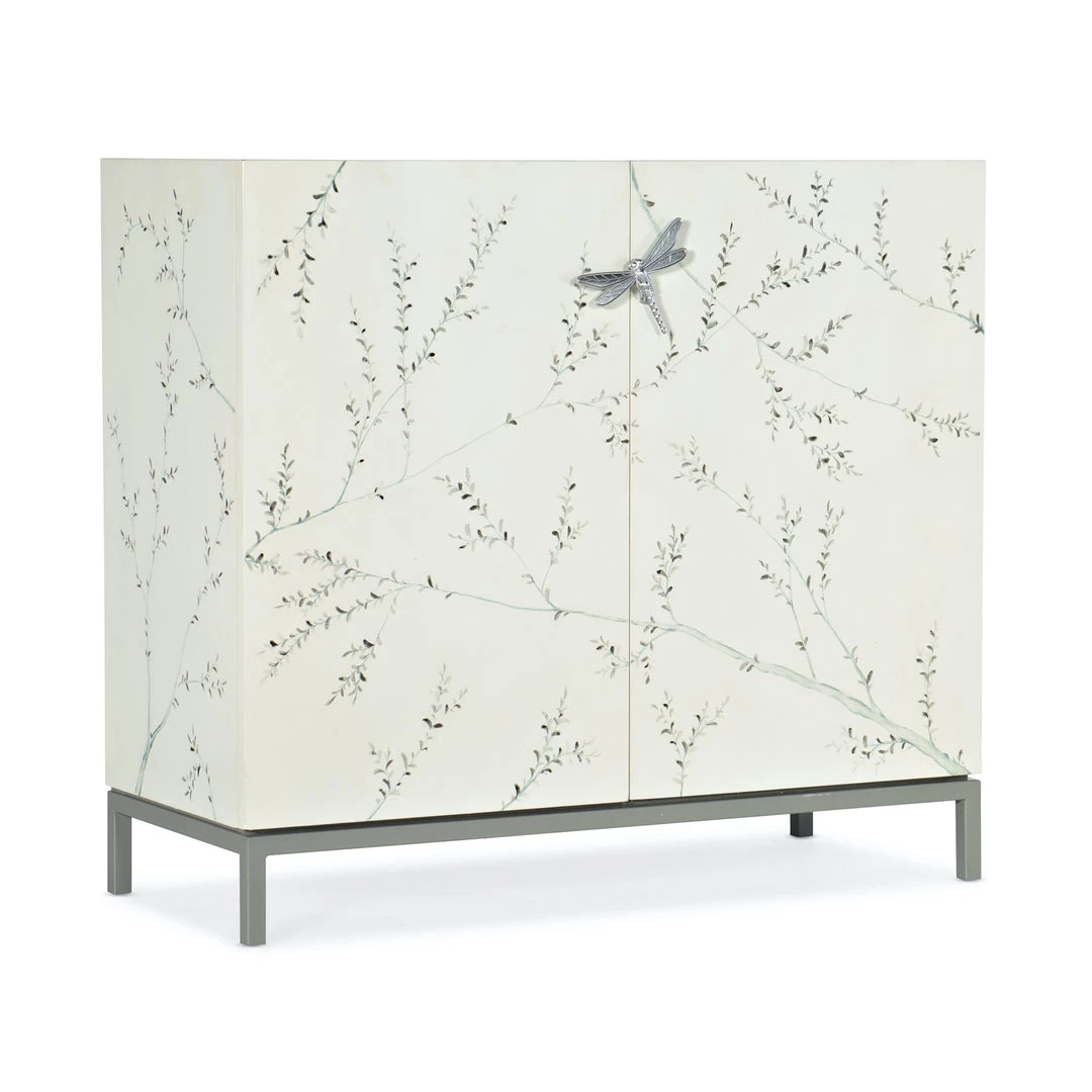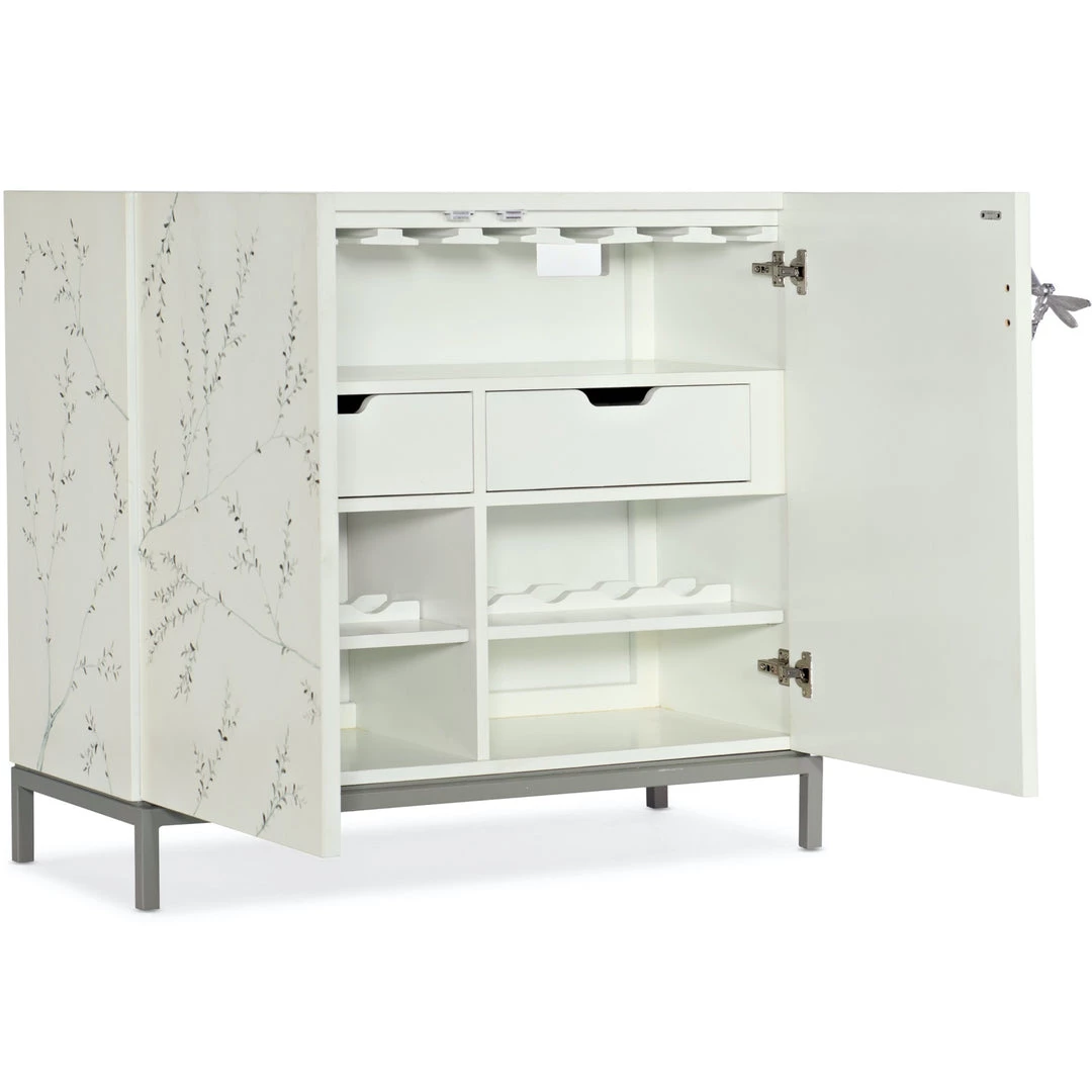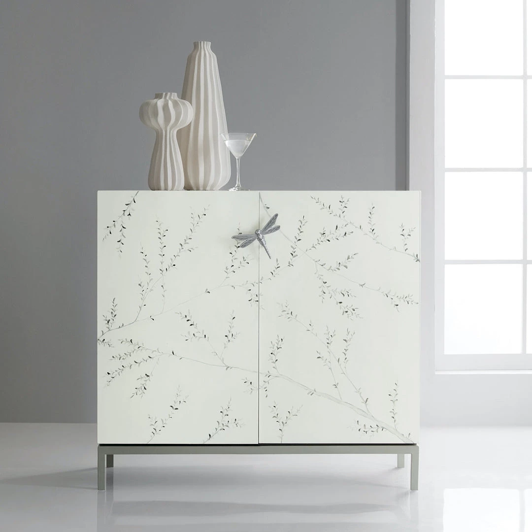 Simply enchanting, the exquisite Bale Bar Cabinet combines a handpainted white finish on hardwoods with a silver metal base. The dragonfly-shaped chrome-colored metal hardware adds whimsy and charm. With two doors, the cabinet has two adjustable shelves that are reversible to allow wine bottle storage and wine glass storage in the top.