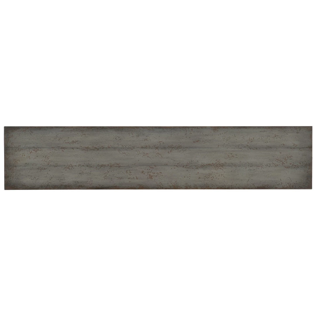 The Bella Vintage Console in a Speckled Grey finish that looks like it has aged through generations. This rustic farmhouse-inspired design features three drawers and aged bronze metal stretchers for a functional and welcoming entry piece.