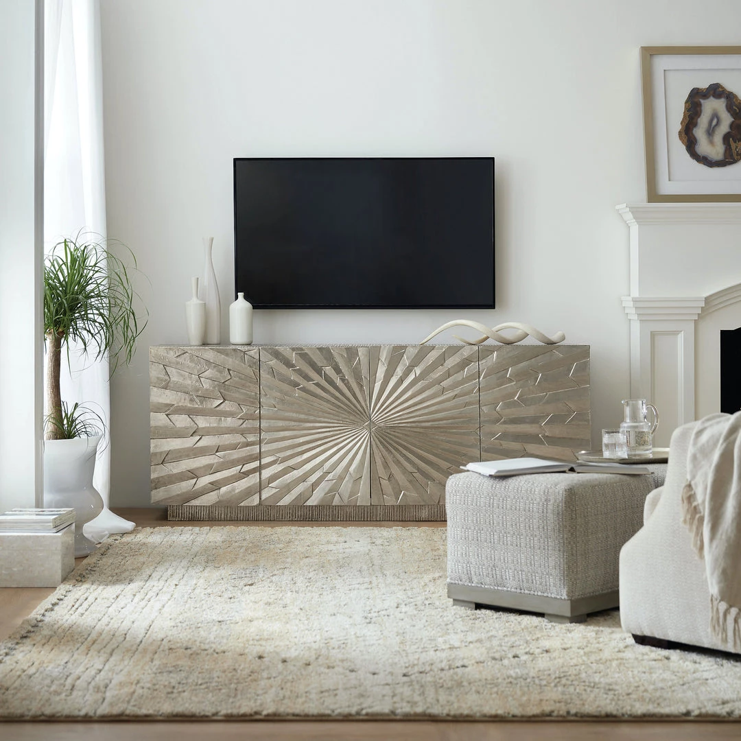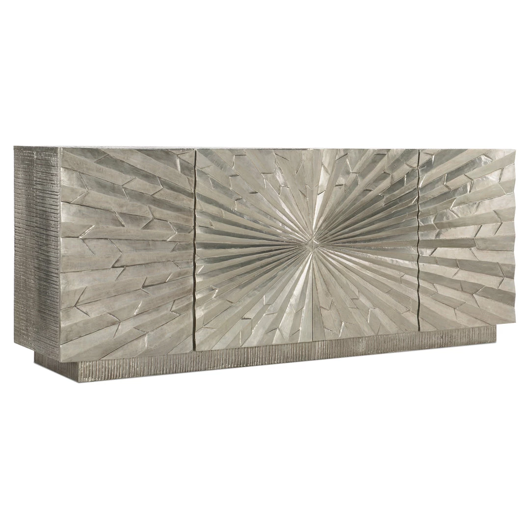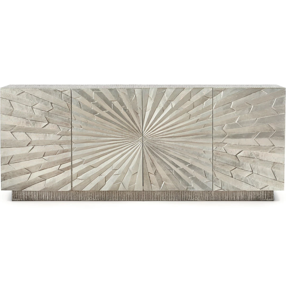 Channeling jet setting socialites from the golden age of Hollywood, the German Silver Console is a dramatic and striking focal point to glam up any interior. The exquisite burst design create a play on light that makes the metallic silver finish really shine. Perfect in any room, this iconic piece features 4 doors, removable shelves and a ventilated back panel to accommodate media components.