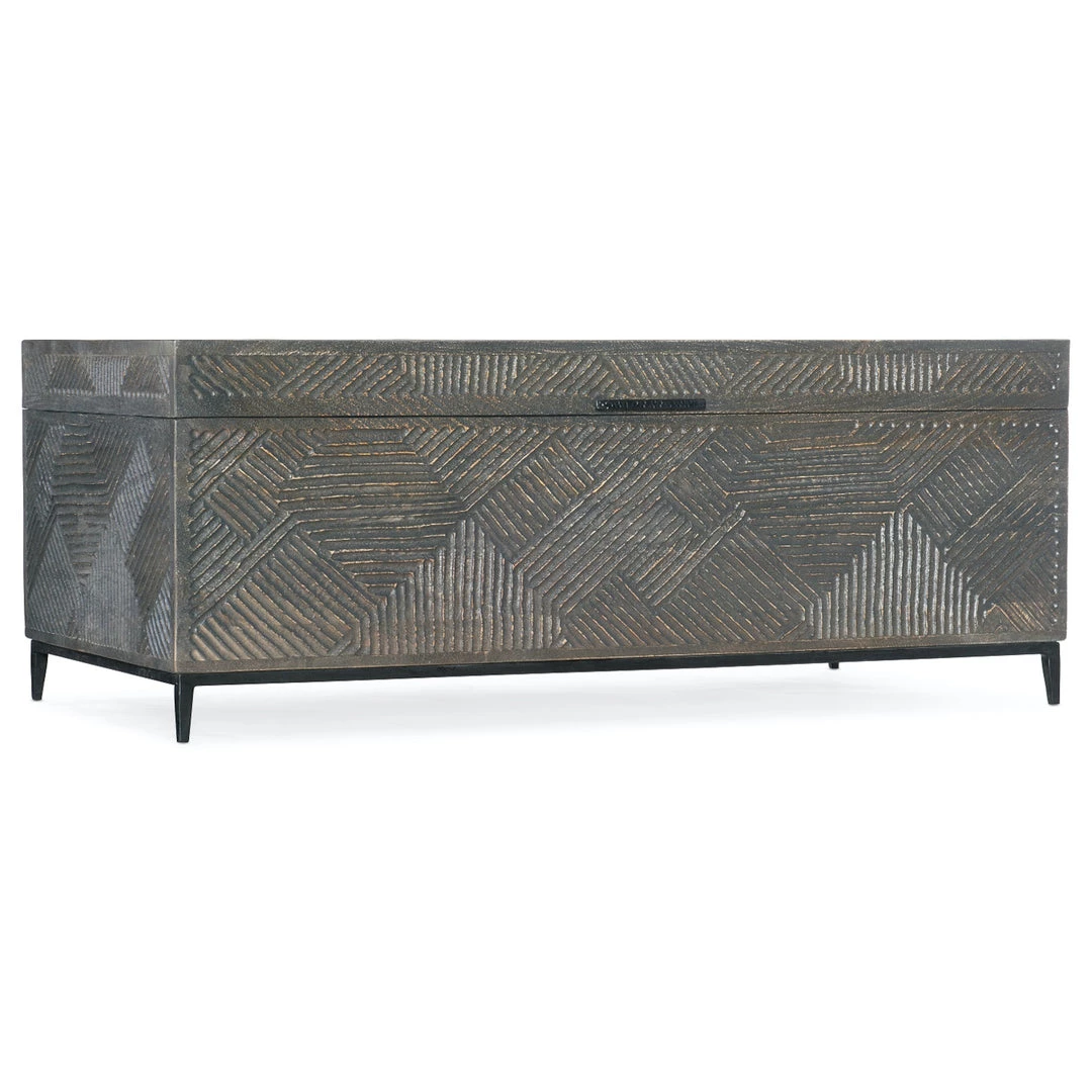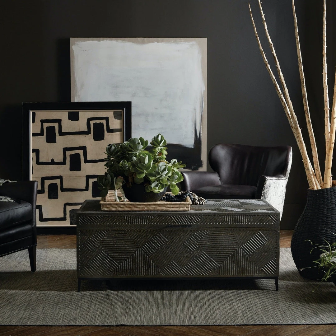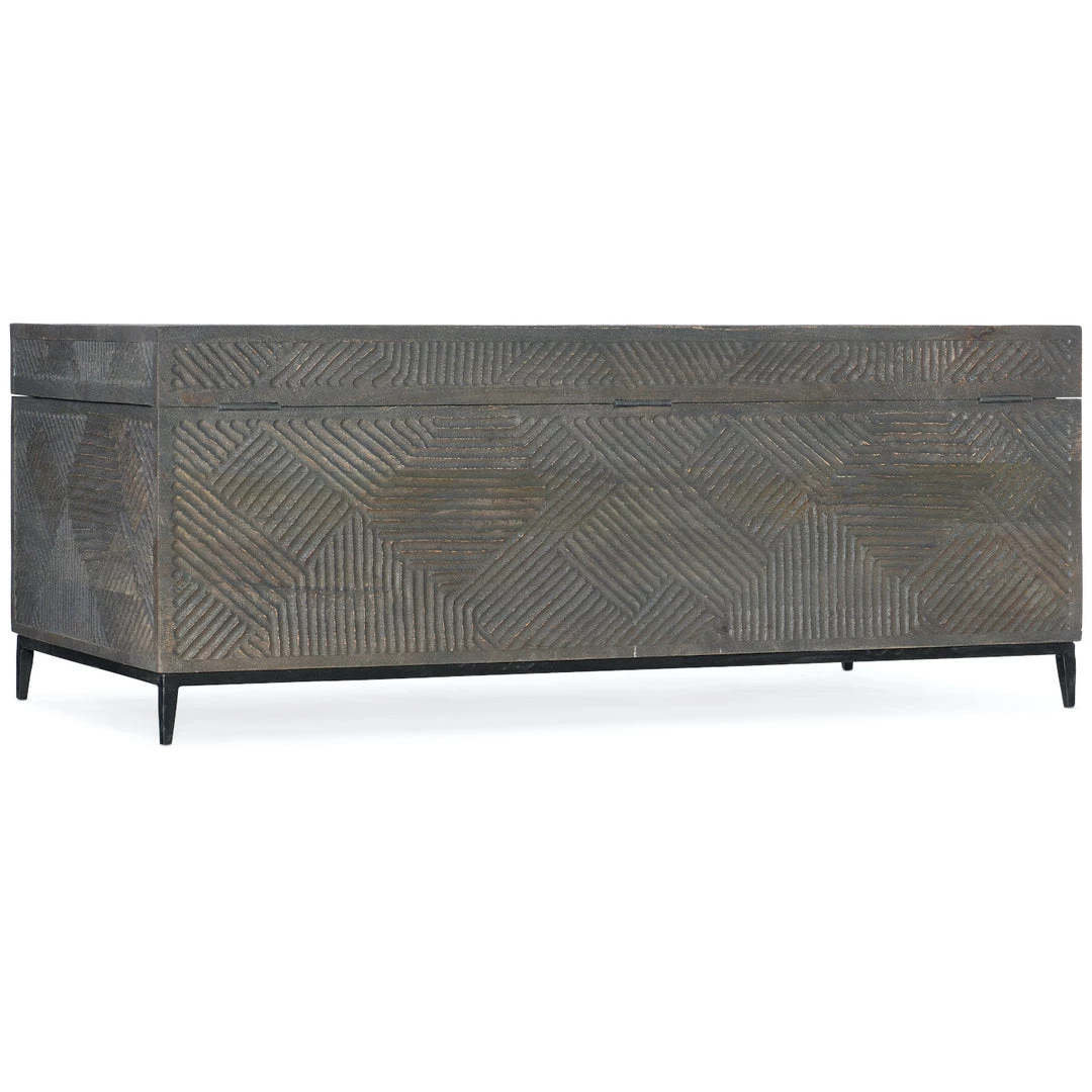 Textural and tactile with a tribal vibe, this storage coffee table puts a modern spin on a classic lift-top trunk. Crafted of Mango Wood with Iron, the table has a gray textured finish with a grooved pattern, and a black metal base and legs. Removable tray inside.