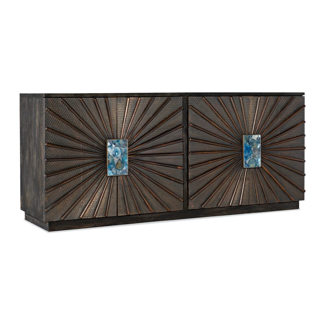 Statement storage with artistic intrigue. Featuring a hand-rubbed black mango wood case, Clio’s antique bronze metal clad doors highlights the texture and high craftsmanship with a honeycomb pattern and dimensional starburst overlay. Over-sized agate stone hardware centers the design while adding a pop of color a whimsy to the look.