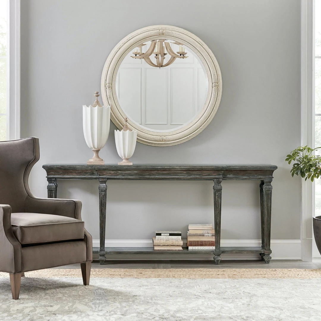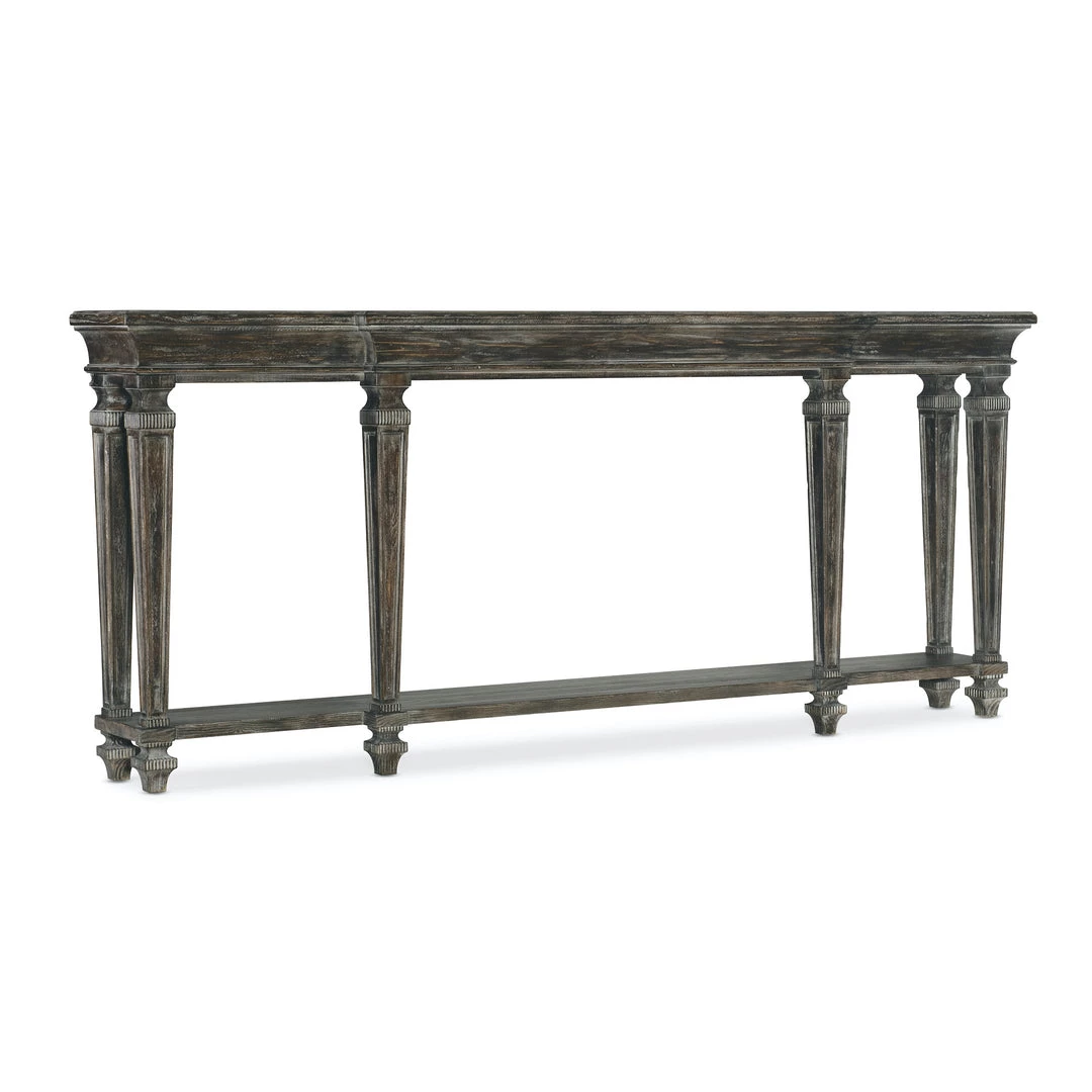 Inspired by antiques and architecture of vintage character, the Cozette Console Table has a breakfront-style shape and a narrow 12-inch depth to make it versatile for many spaces. Crafted of Pine and Oak Veneers with Walnut Inlay and a Solid-Wood Edge Top, the console is finish in Maduro, a rich brown with grey undertones to create a sophisticated neutral palette.