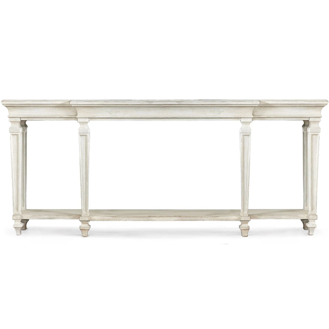Inspired by antiques and architecture of vintage character, the Cozette Console Table has a breakfront-style shape and a narrow 12-inch depth to make it versatile for many spaces. Crafted of Pine and Oak Veneers with Walnut Inlay and a Solid-Wood Edge Top, the console is finish in soft white with distressing for a casual appeal