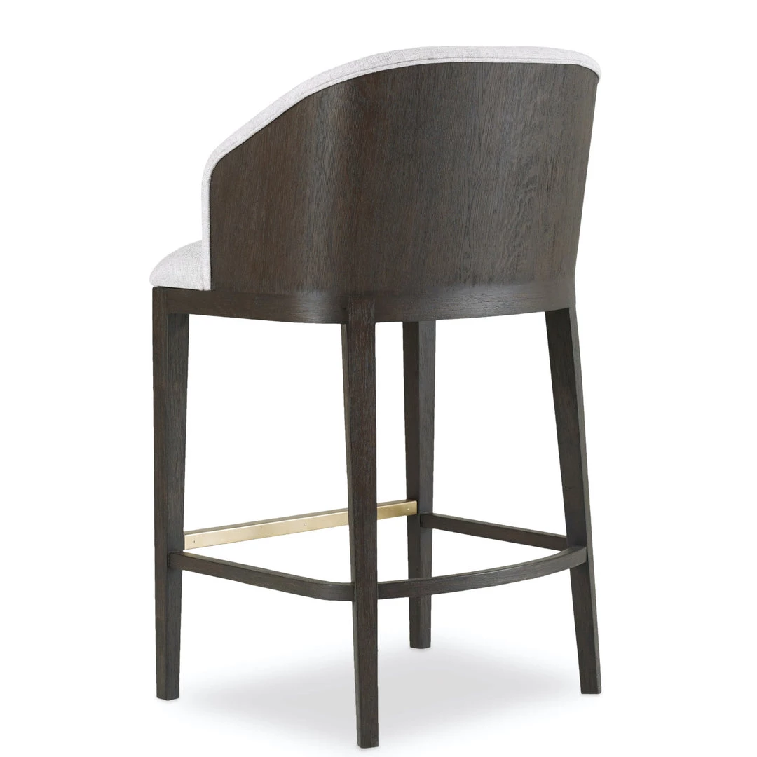 Chic and modern with an eclectic mix of a fabric upholstered seat and inside back, White Oak Veneer wood on the outside back and a metal foot rail, the 41 ¼-high Curata Bar Stool is comfy and inviting in a Midnight finish and upholstered in the neutral Montlieu Opal fabric. Create a curated chic modern look with an eclectic mix of sophisticated materials and finishes in the Curata Collection.