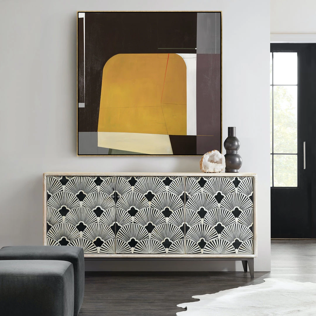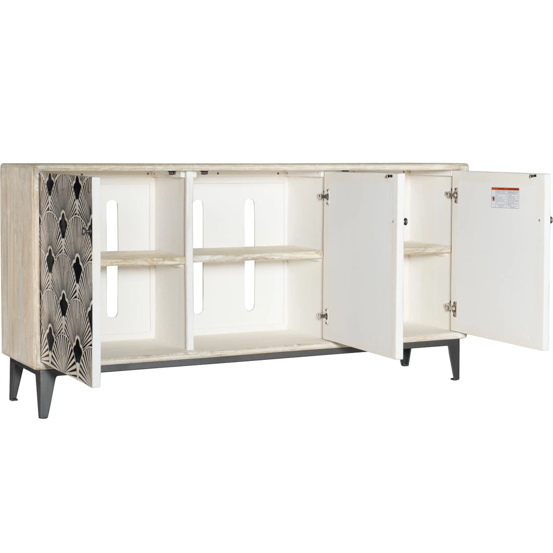 Light natural casing surrounds three door fronts with a graphic black and white bone inlay fan mosaic to create a majorly artistic statement piece. Spacious interior shelving brings ample storage to the dining or living room, with rear cutouts for cord management.