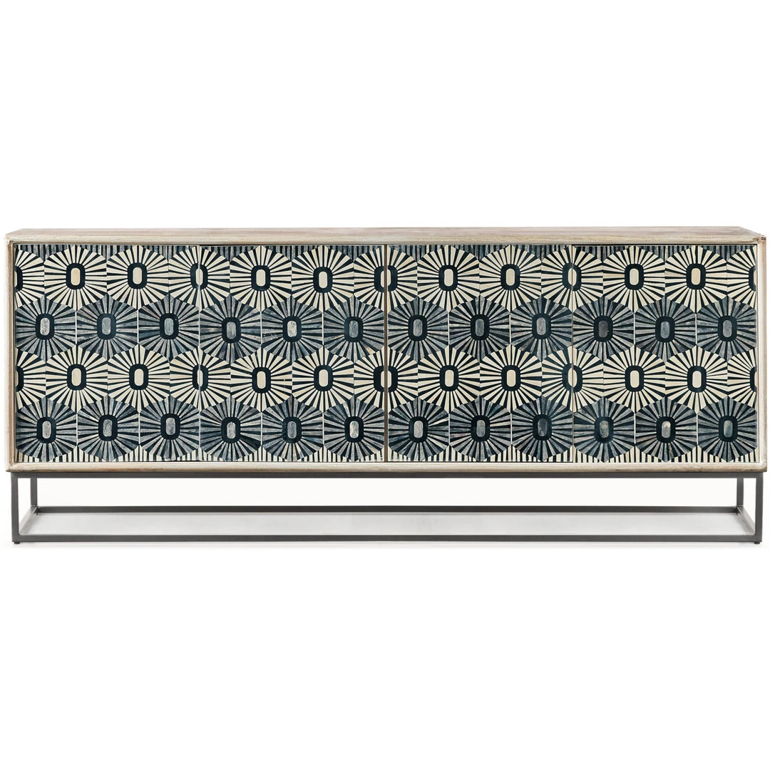 Light natural casing surrounds four abstract art patterned door fronts created with bone inlay in a black, white and gray color scheme makes this Credenza a one-of-a-kind artistic accent. The spacious interior brings ample storage to the dining or living room with a removable shelf behind each pair of doors, a ventilated back panel and wire management.