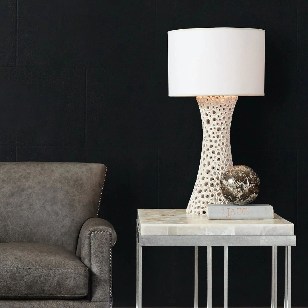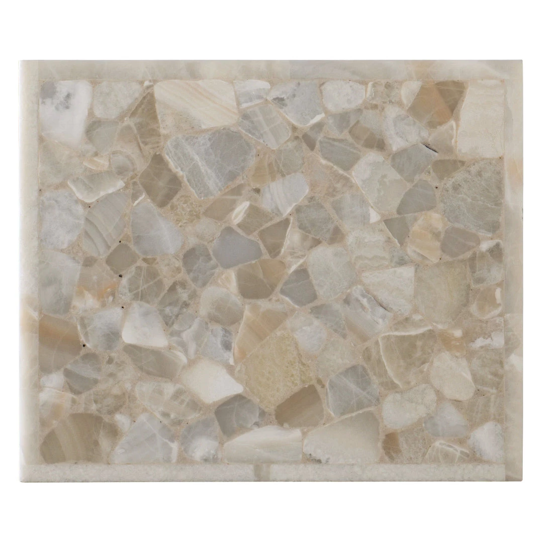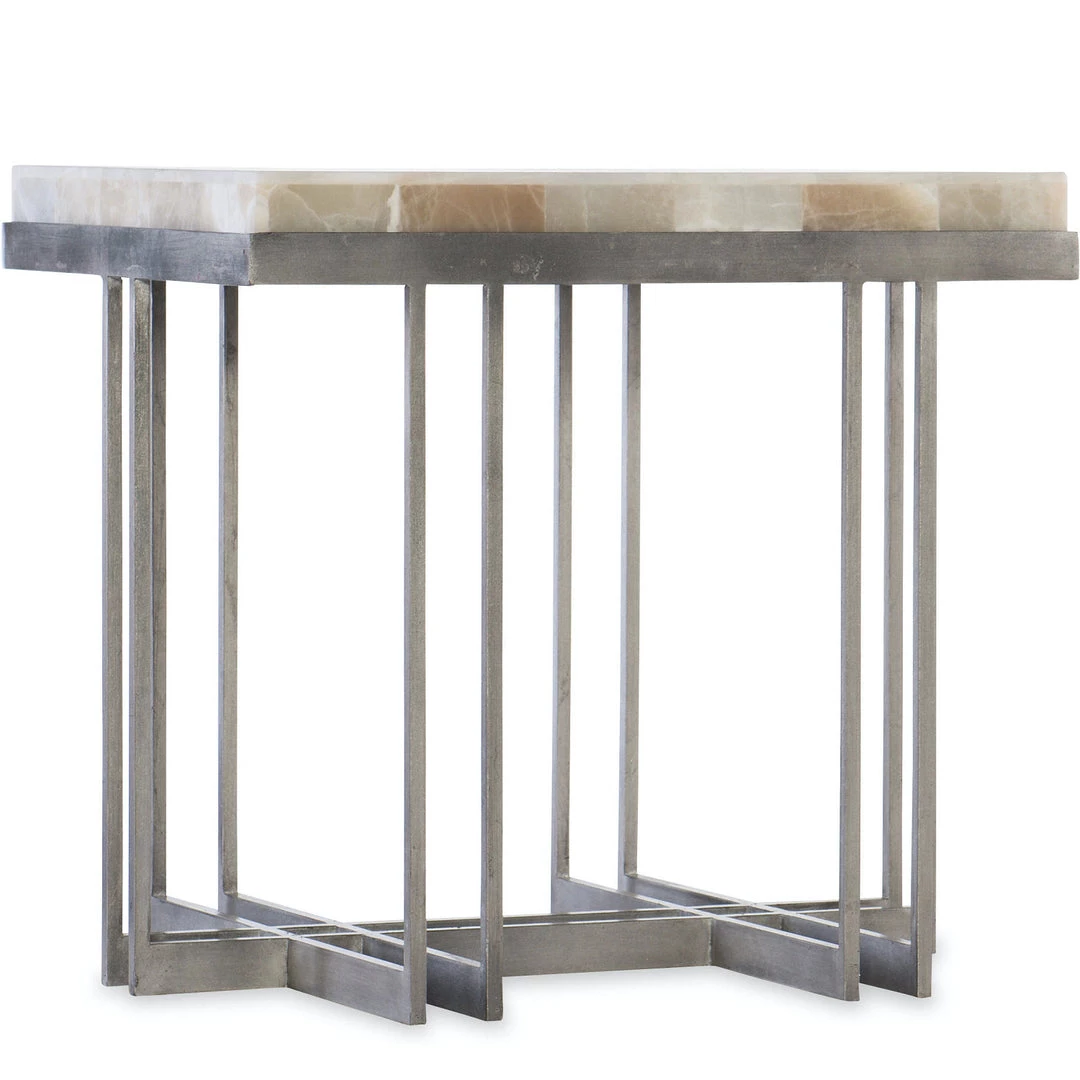 The Desert Onyx Cage End Table is modern in shape, organic in spirit. The stone top is a tumbled mix of white, creamy neutral onyx and is supported by a sophisticated cage of pewter finished metal.