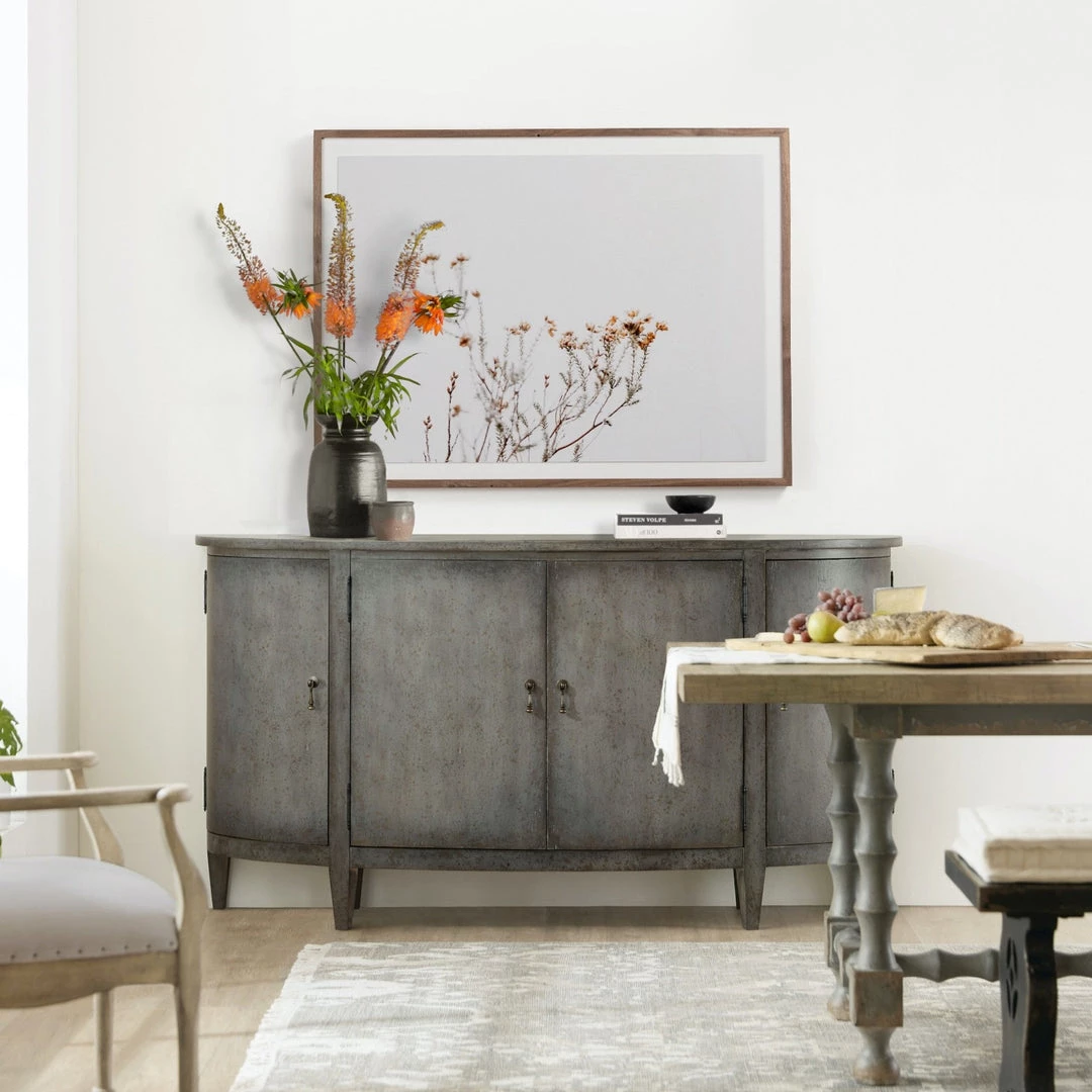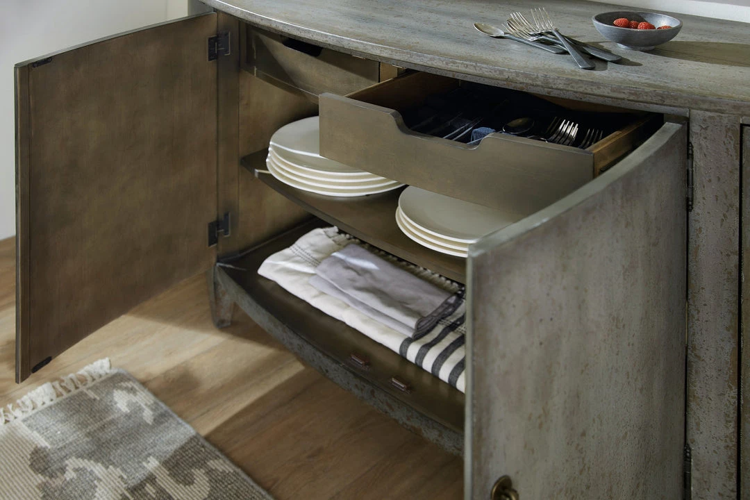 Inspired by European farmhouses, the graceful silhouette of the Bella Buffet will give a designer flair to any room. As a delightful bonus, this piece is packed with storage, with one adjustable shelf behind each pair of center doors, 2 fixed shelves behind the left and right doors, 2 drawers behind the center doors and drop-in felt liners with silverware storage. Crafted of Poplar and Hardwood Solids with Maple Veneers, the buffet features a character-filled Speckled Gray finish with hand chiseling and multi-layer rub-through. Tear-drop hardware adds a sparkle of style.