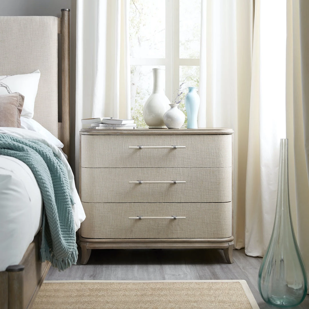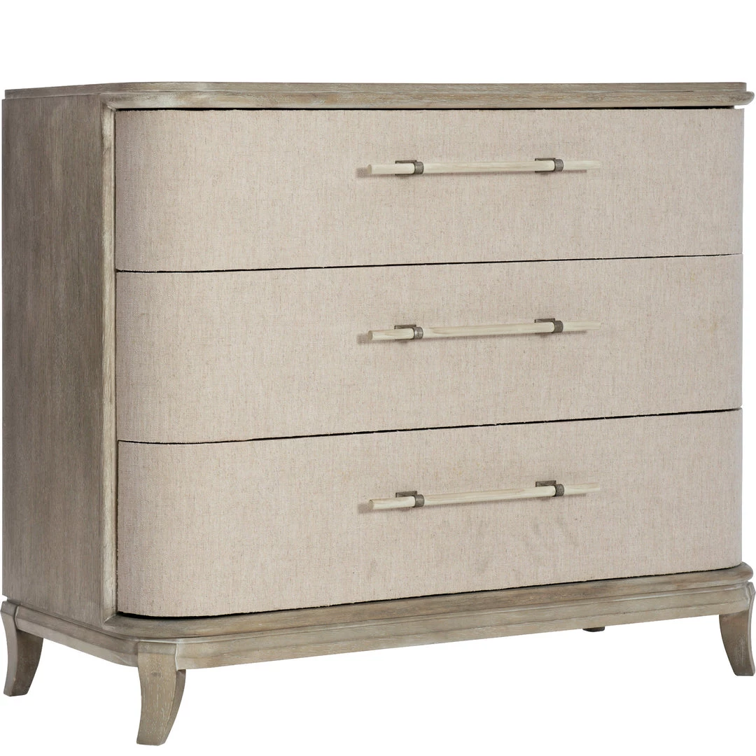 Affinity features soft, rounded corners in sand-blasted greige (gray/beige) finish on quartered white oak. Linen drawer fronts, pewter and antique white hardware make this piece perfectly zen with beach cottage appeal.