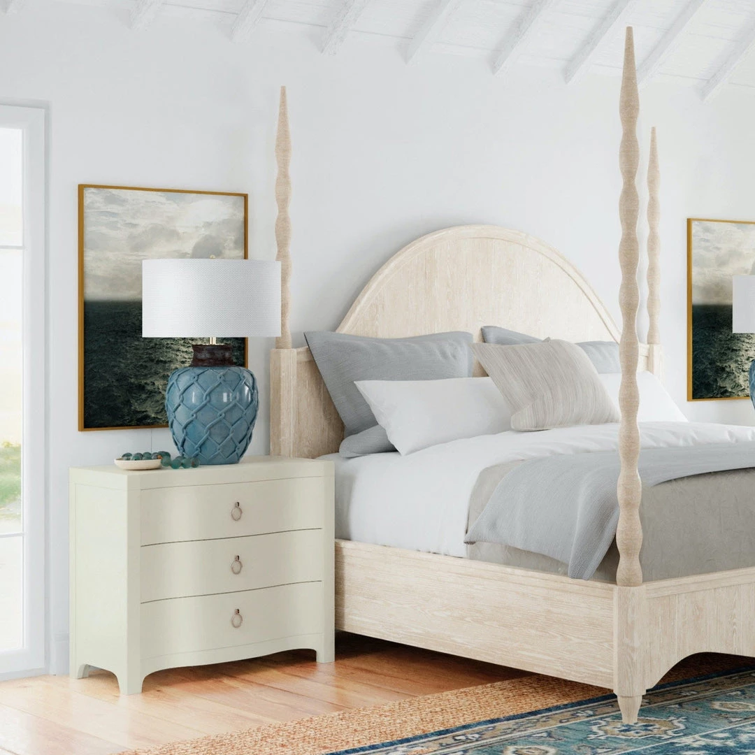 If you aspire to tranquil palettes and clean, crisp silhouettes, the Antigua Three-Drawer Nightstand will bring the peacefulness of the outdoors in with its shaped front and soft textured Shell white finish. Crafted of Oak Veneers, the nightstand has 3 drawers with soft-close drawer guides, a USB charger with two ports and a cord clip on the back. Light champagne decorative ring pulls add a designer touch.