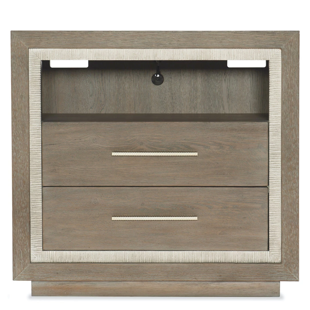 In a crisp two-tone finish combining a gray washed oak with a contrasting textured light gray color, the Serenity Balboa Two-Drawer Nightstand brings the organic textures of cottage waterfront living to your space. Crafted of Oak Veneers and resin, The nightstand has two drawers with soft-close drawer guides and an open area above the drawers. There’s a USB charger with two ports on the back and a cord clip. Designed to create a comfortable and inviting retreat within the home.