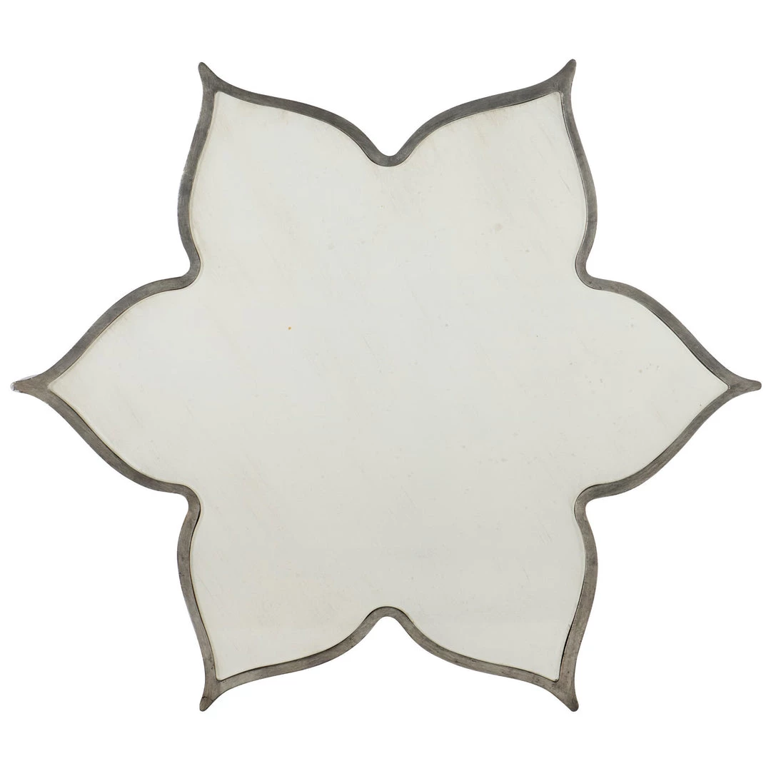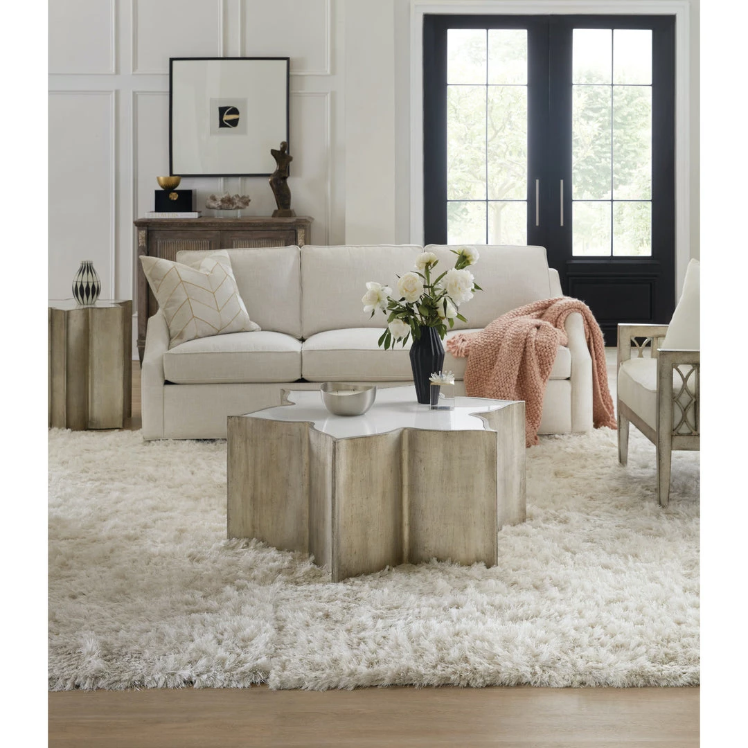 Like a Hollywood starlet, this exquisite flower-shaped cocktail table shimmering in a silver finish with undertones of gold and champagne will add beauty and drama to your room. The lovely top is finished in Meringue, a reverse painted glass in a creamy white finish. On casters for easy moving.