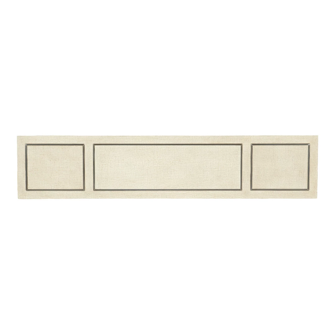 Finish: Pebble Beach: lacquered burlap finish. Champagne colored metal inlay around top, middle shelf and bottom shelf.