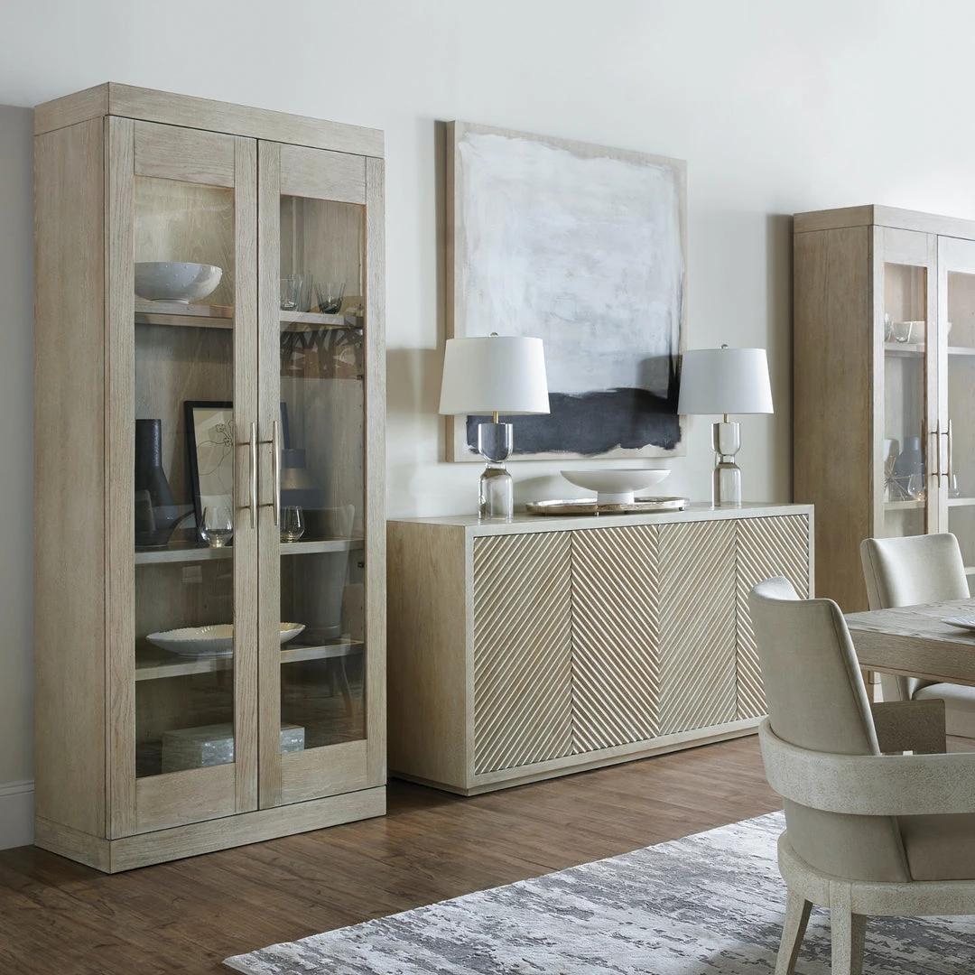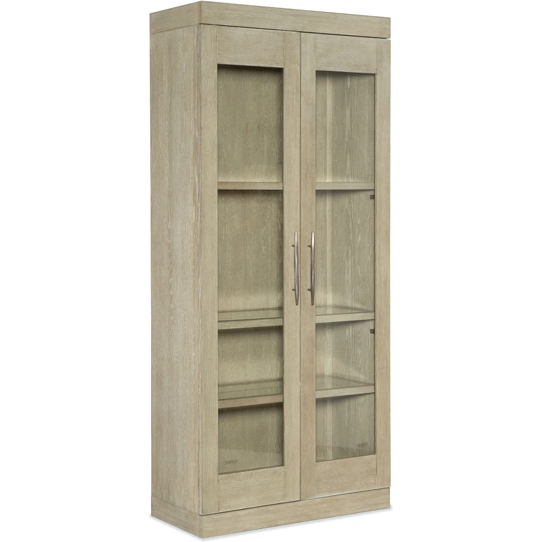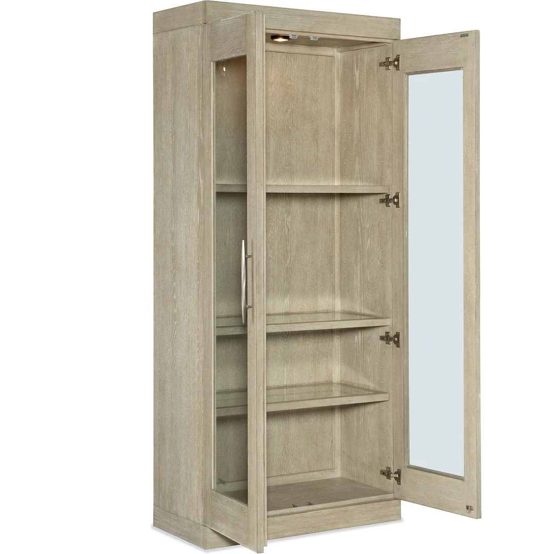 The sleek silhouette and serene neutral color palette of the Cascade Display Cabinet will help you create a retreat from your fast-paced lifestyle at home. Crafted of Oak Veneers in a soft taupe finish and tempered glass, the cabinet features two adjustable wood-framed glass shelves and one fixed wood-framed glass shelf and a light with a three-intensity touch switch.