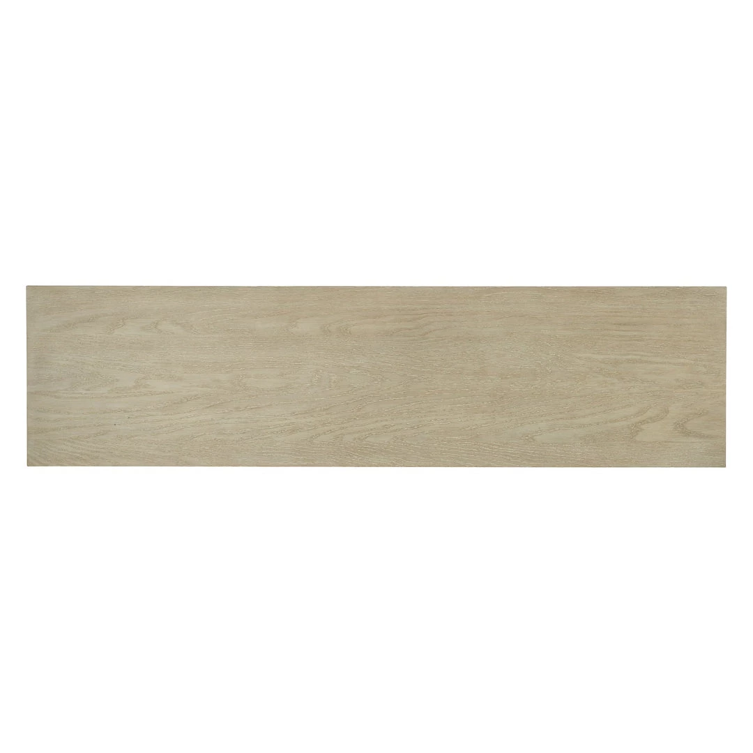 Finish: Terrain: a soft, taupe finish on oak veneers. Distressing includes dry brushing.