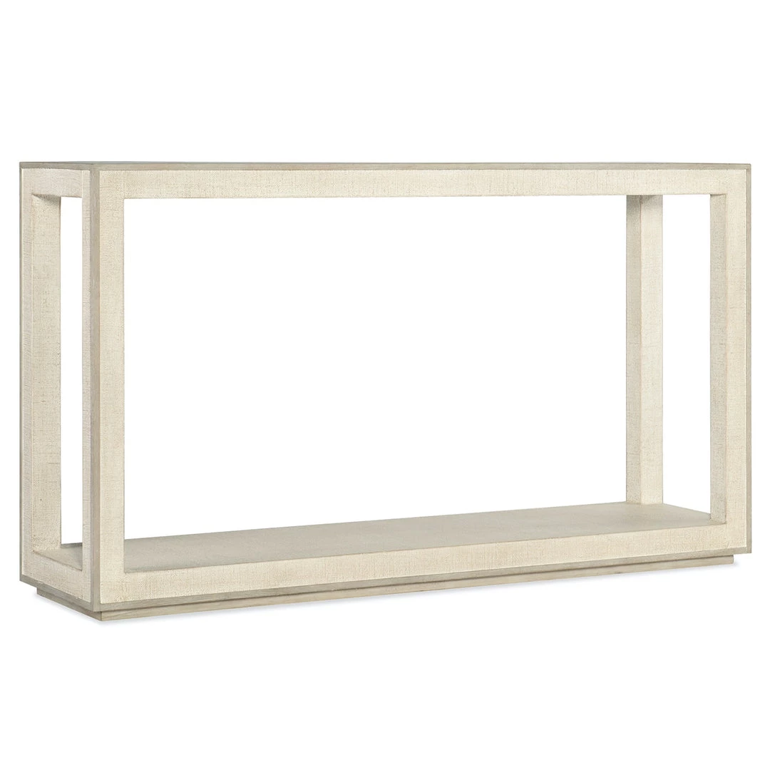 Crafted of tactile lacquered burlap with an Oak Veneer wood top and trim, this console table is finished on all sides so that it can float in a room, and the base can serve as a shelf.