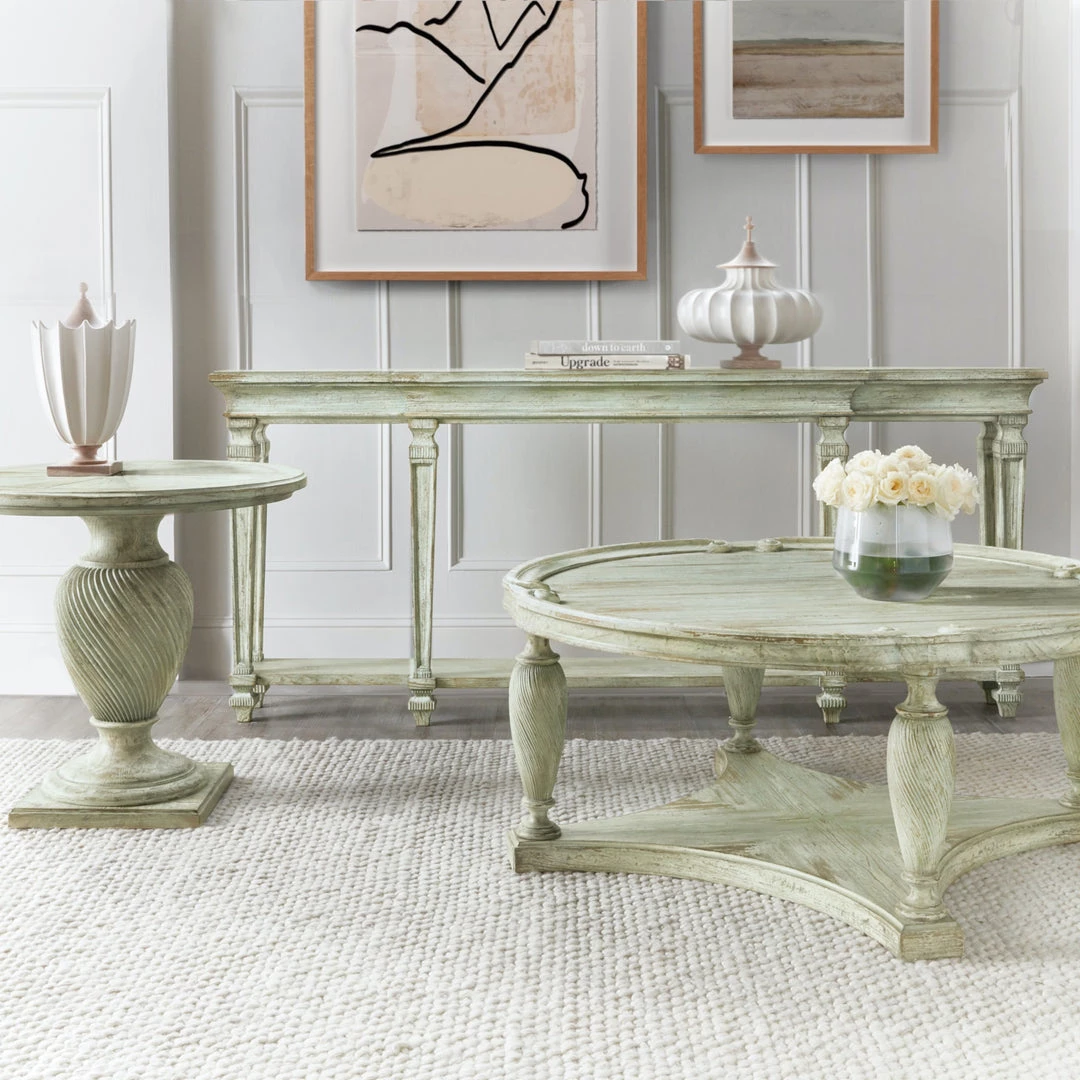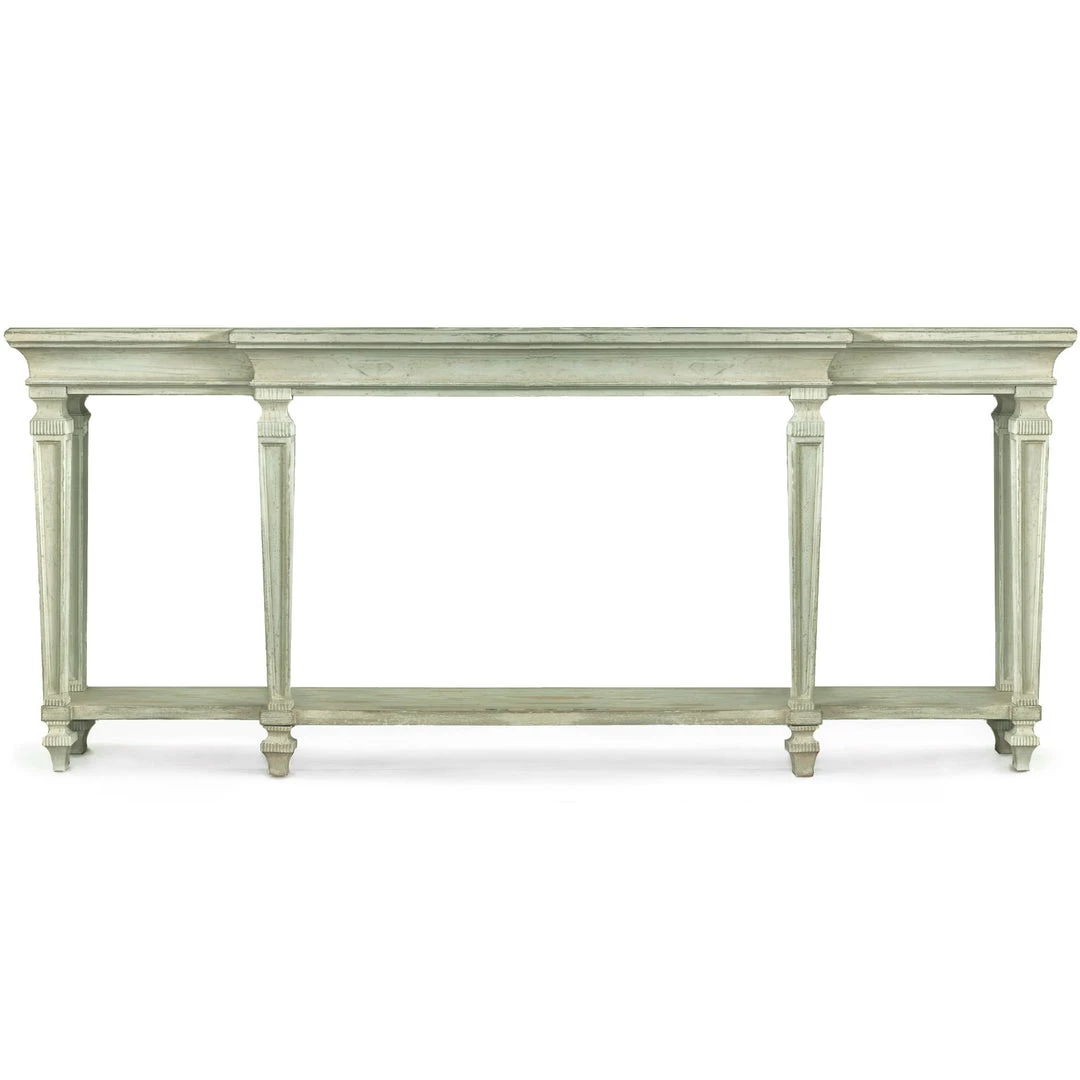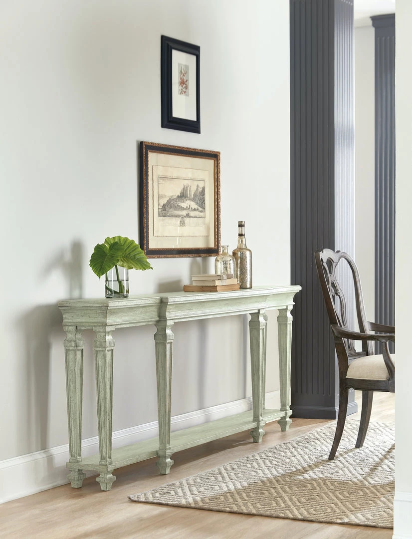 Inspired by antiques and architecture of vintage character, the Traditions Console Table has a classic breakfront design updated by the subtle and stylish green Pistachio finish. Crafted of Pine and Oak Veneers with Walnut Inlay and a Solid-Wood Edge Top, the table has a slim 12-inch depth to fit in even tight spaces and one fixed shelf.