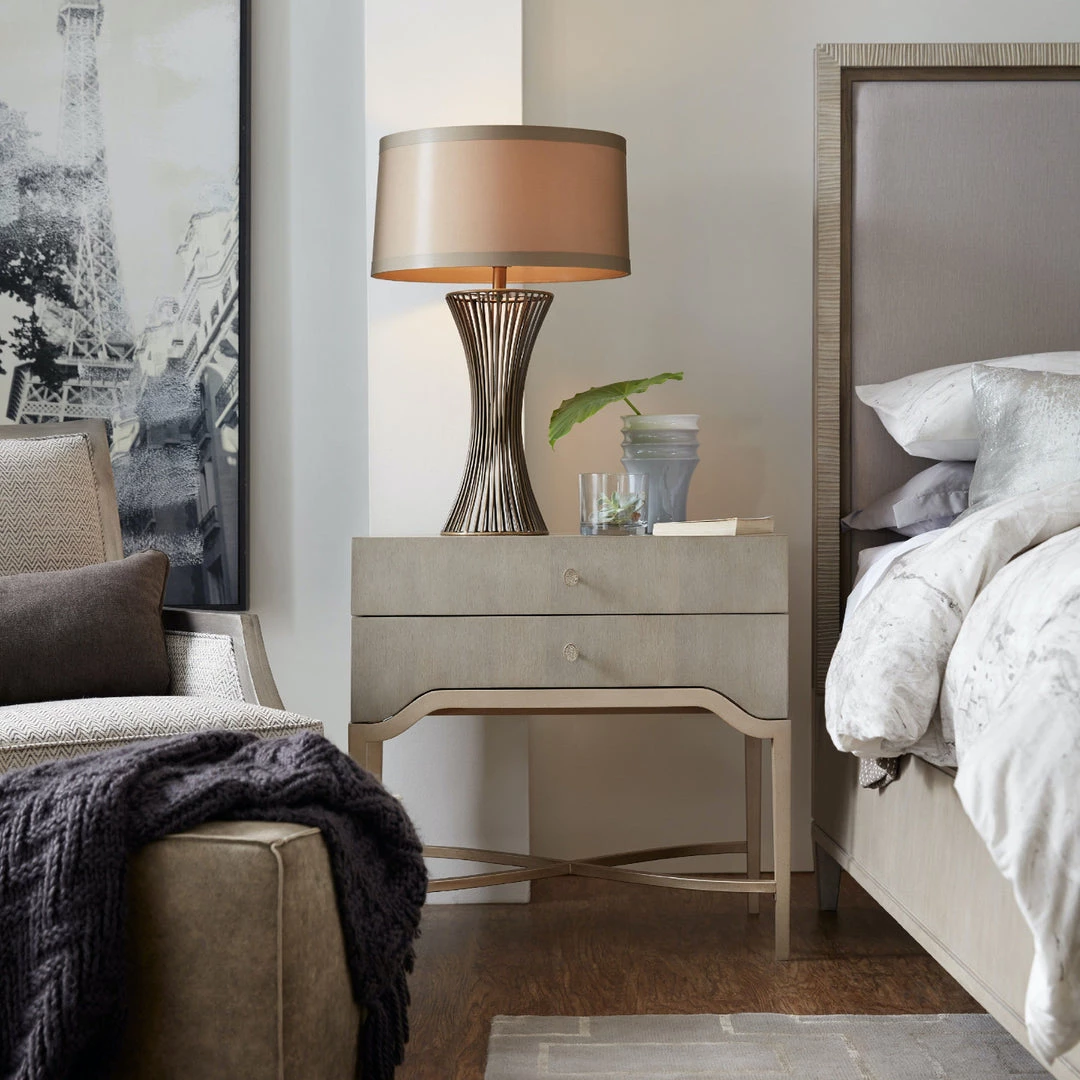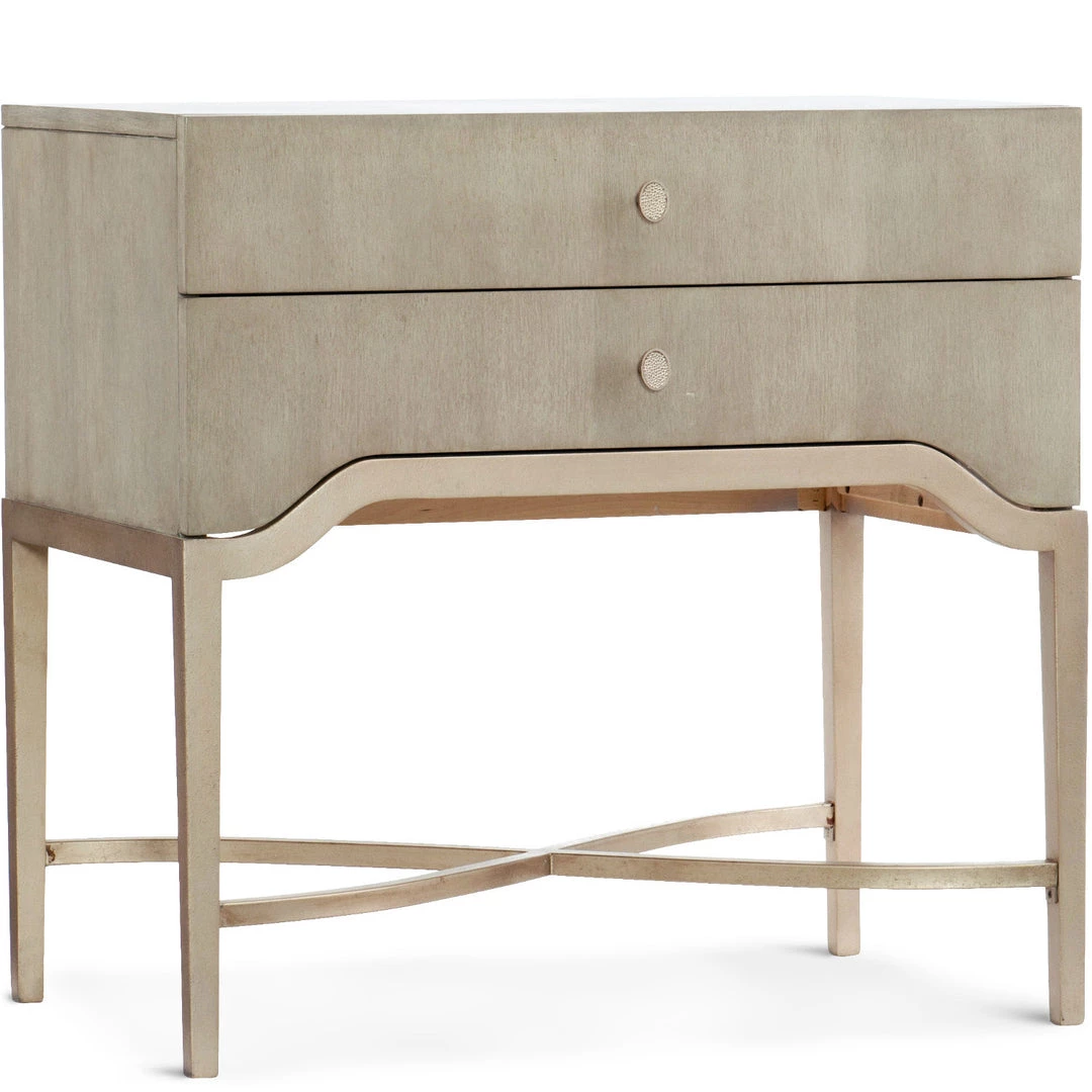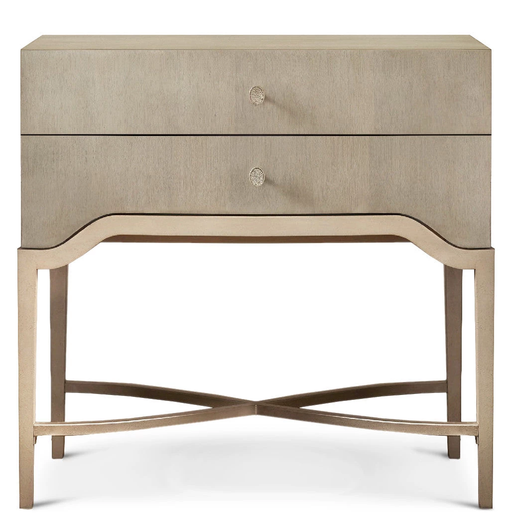 Curvy and elegant, the Elixir Two-Drawer Nightstand combines metal trim and a metal X-stretcher in champagne silver color with a serene gray beige wood finish.