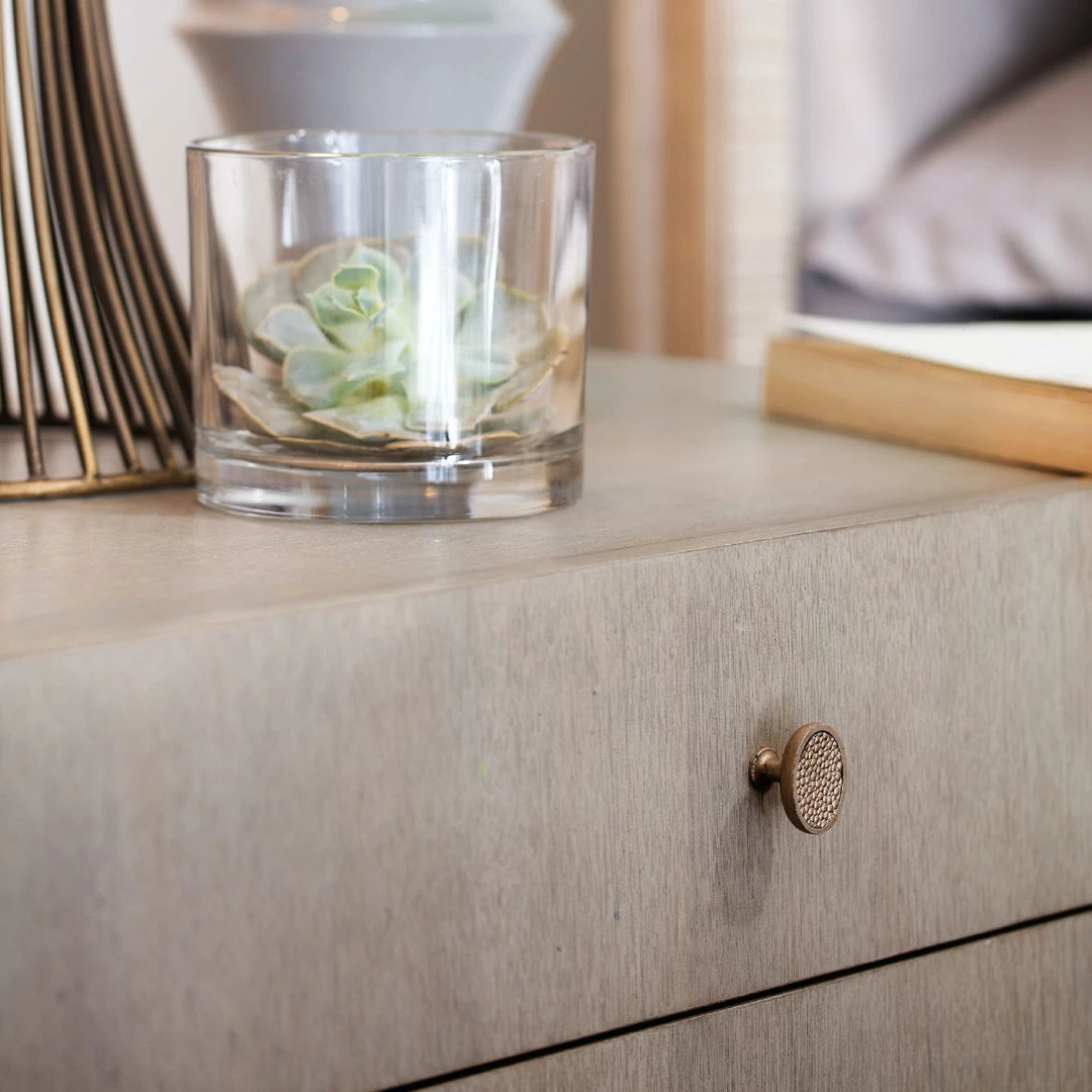 Finish Detail: A serene gray beige finish applied to lightly sand-blasted walnut veneer for an organic and textured look. Champagne silver finish on the metal elements and hardware. Custom-designed knob hardware in a champagne silver finish.
