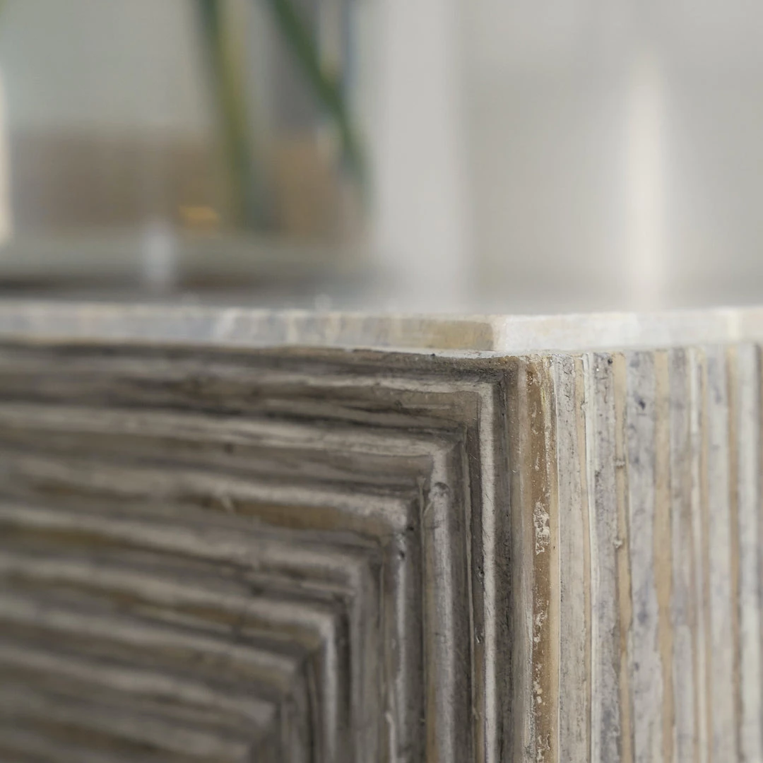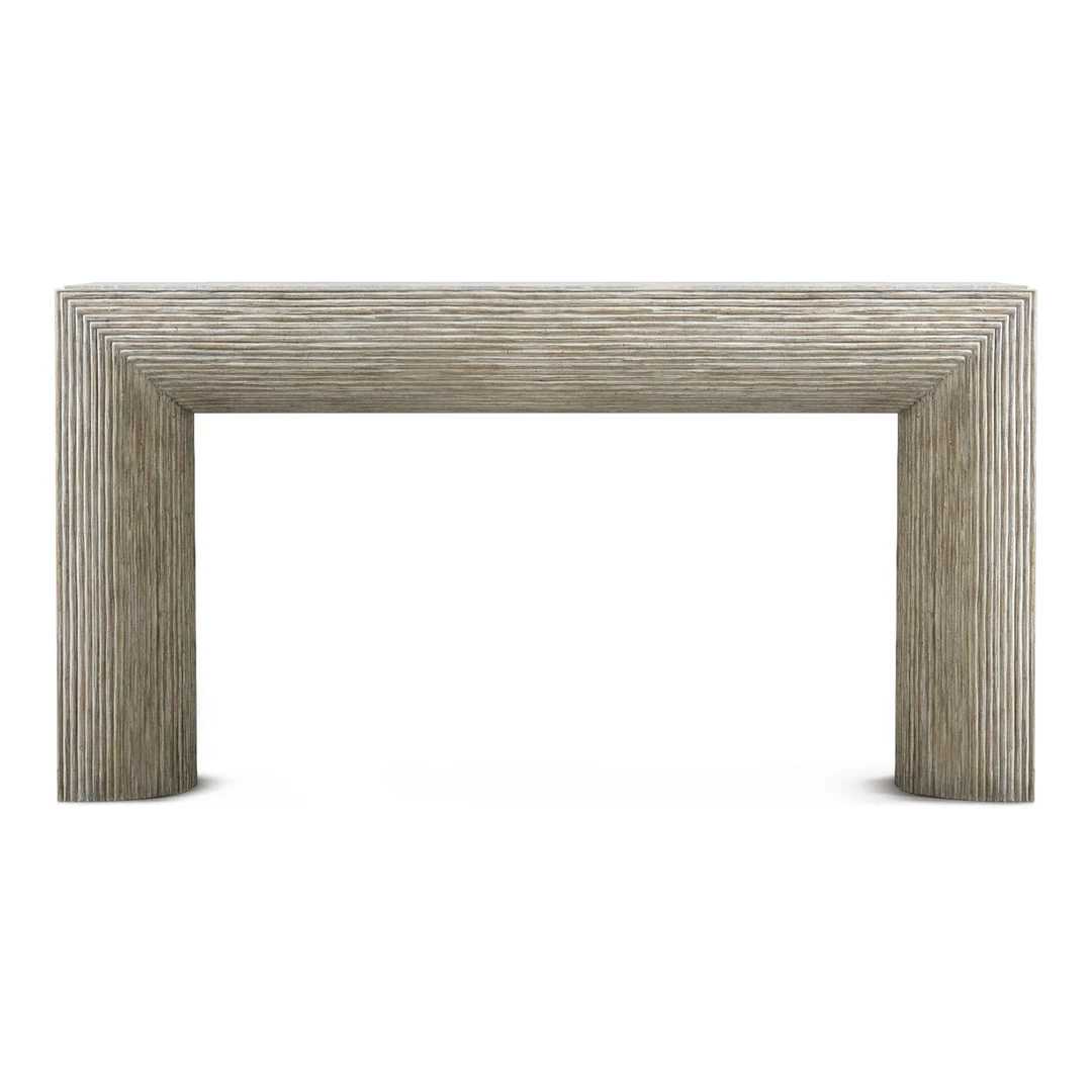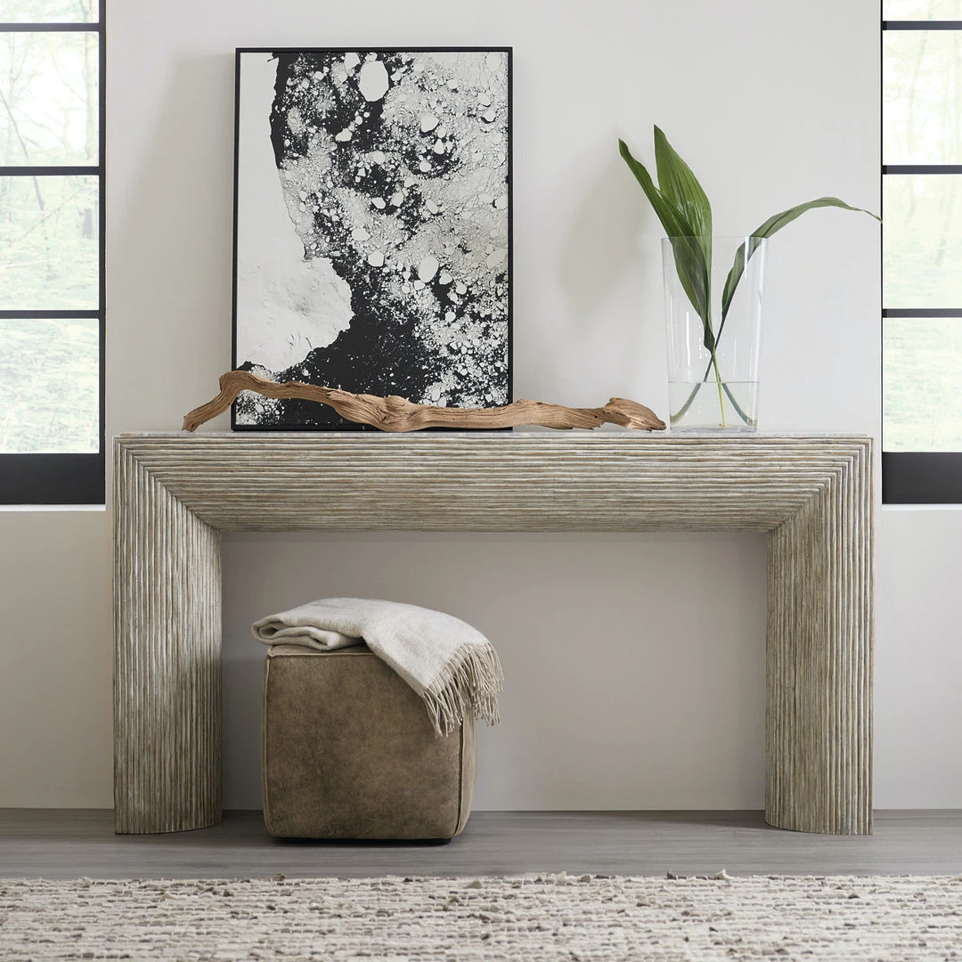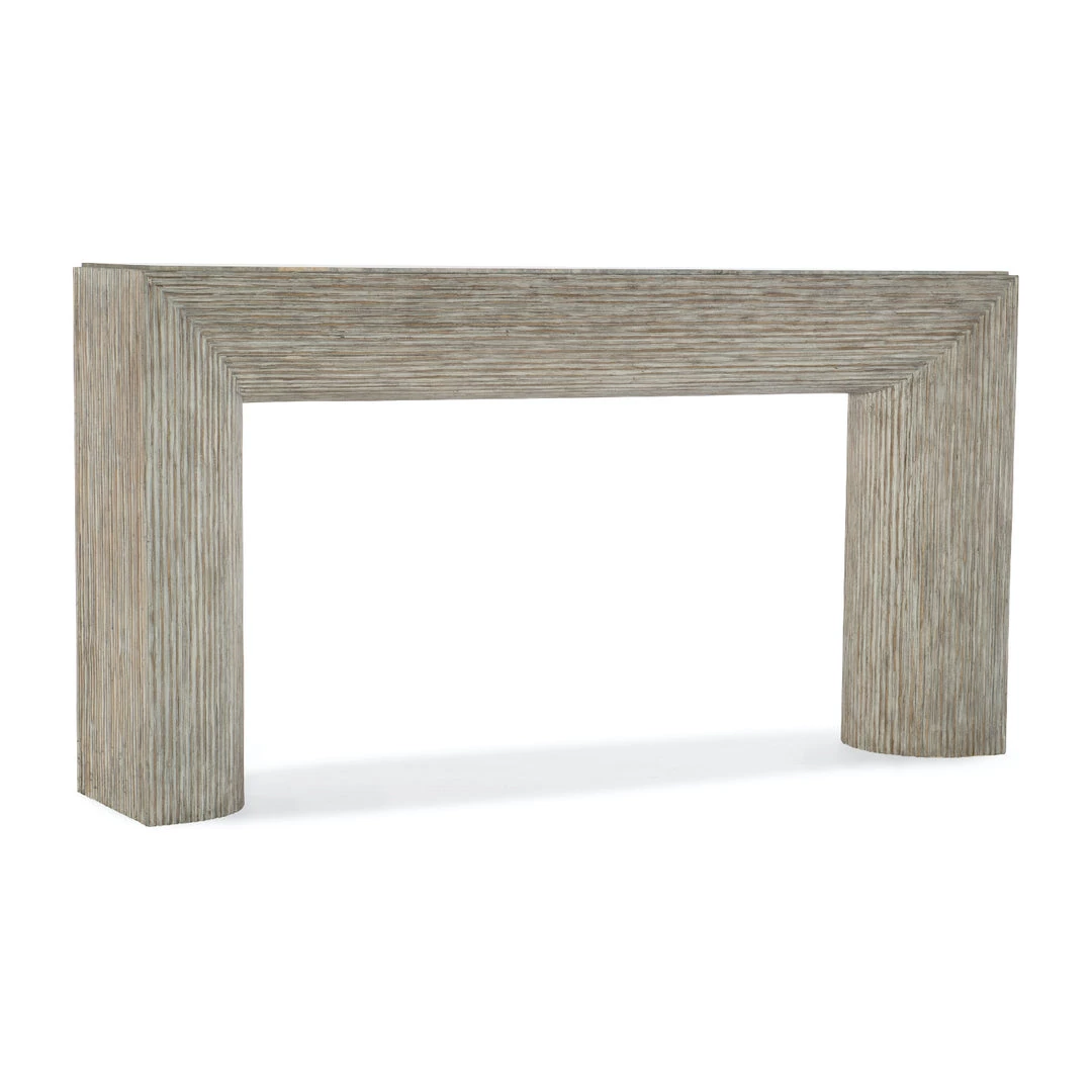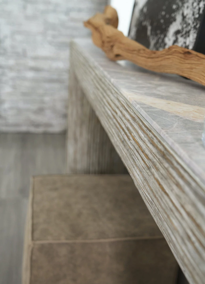 A tranquil mix of organic materials, this modern, yet casual console table evokes beach retreat with its sand blasted wood tones and crema marble top.