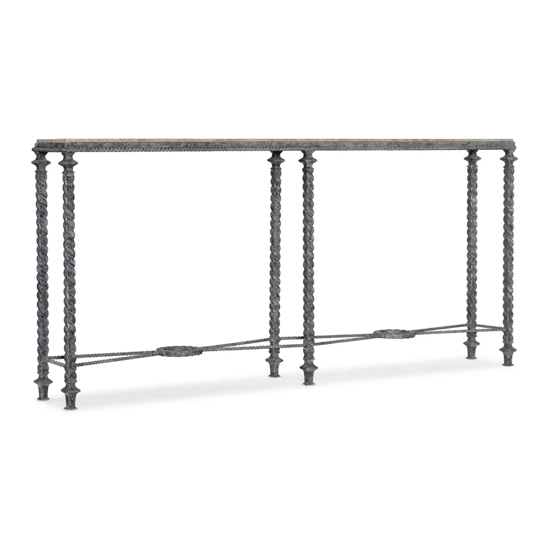 Inspired by European antiques, the intricately-designed Marseille Console Table combines a metal base in a Verdigris finish with a gray and brown Travertine top. The twisted metal legs and stretchers are accented by a circular motif in the center of each stretcher on the base.